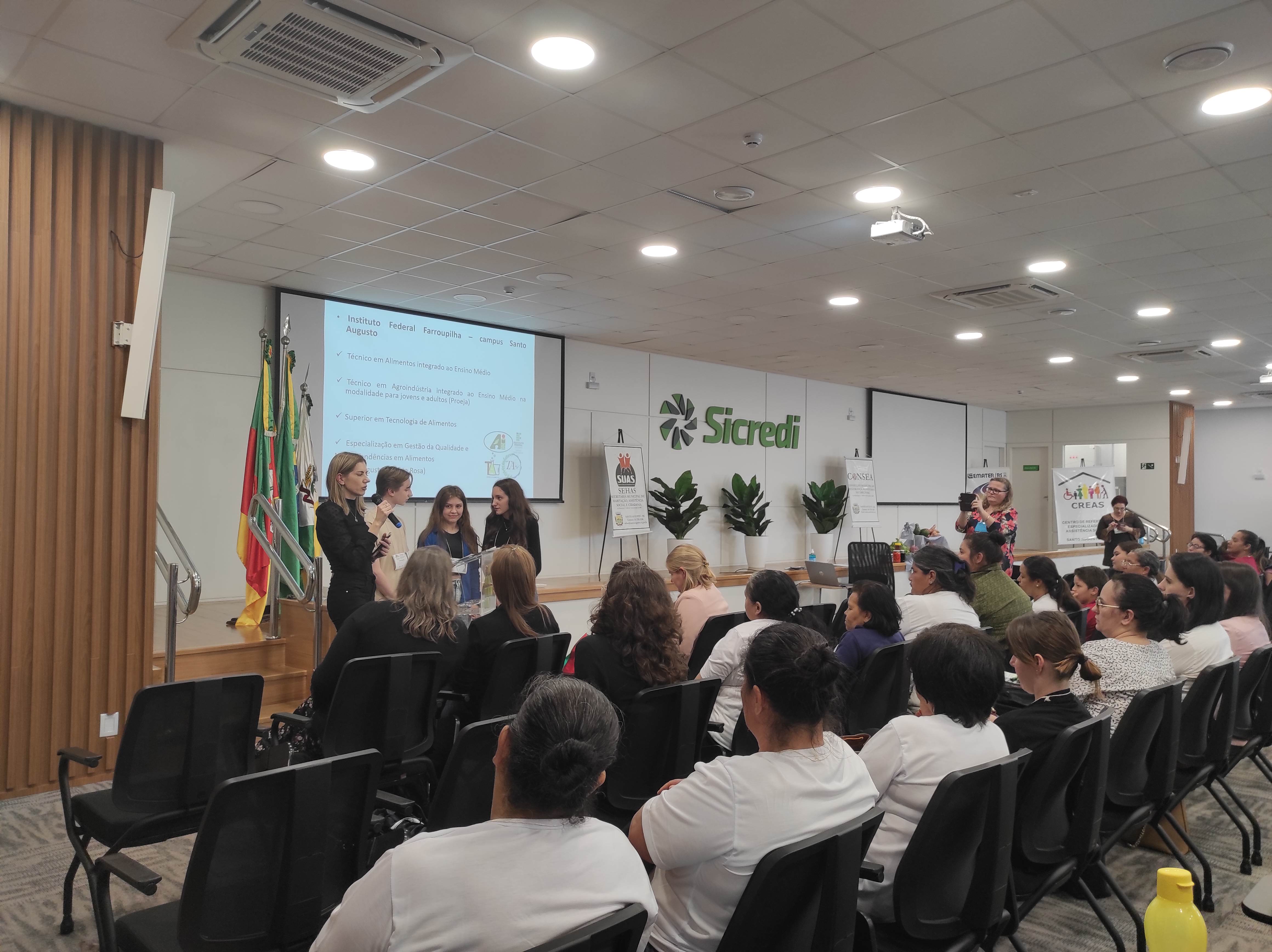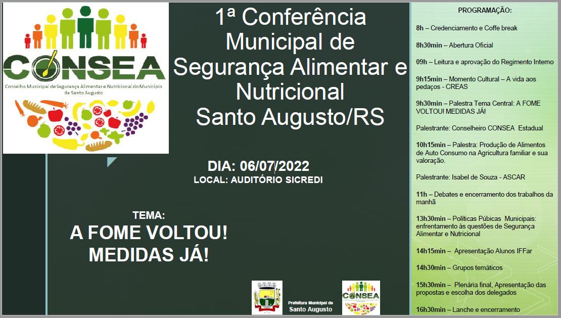 O IFFar – Campus Santo Augusto participou , no dia 06 de julho, no auditório do Sicredi, da 1ª Conferência Municipal de Segurança Alimentar e Nutricional, com o tema “A Fome Voltou! Medidas Já”. A instituição foi representada pela Diretora Geral, Márcia Fink, pelos estudantes do curso técnico em Alimentos, pelas professoras Melissa dos Santos Oliveira e Tatiane Storch, pelas técnicas de laboratório, Denise Rocha, Maria Fernanda Menezes e Luciane da Silva e pela jornalista Carla Maron.