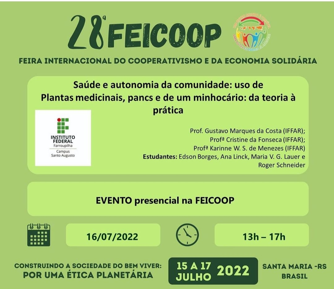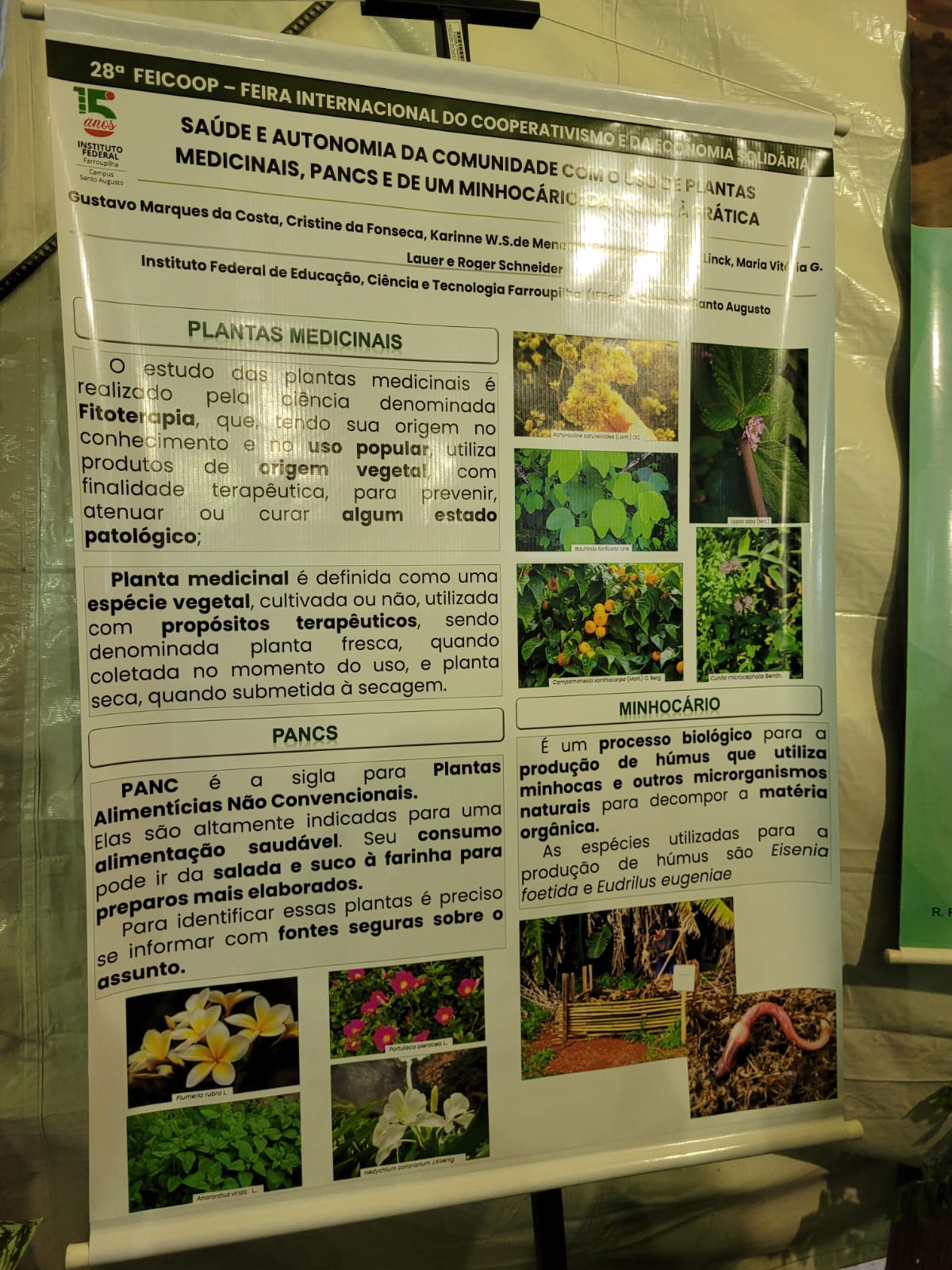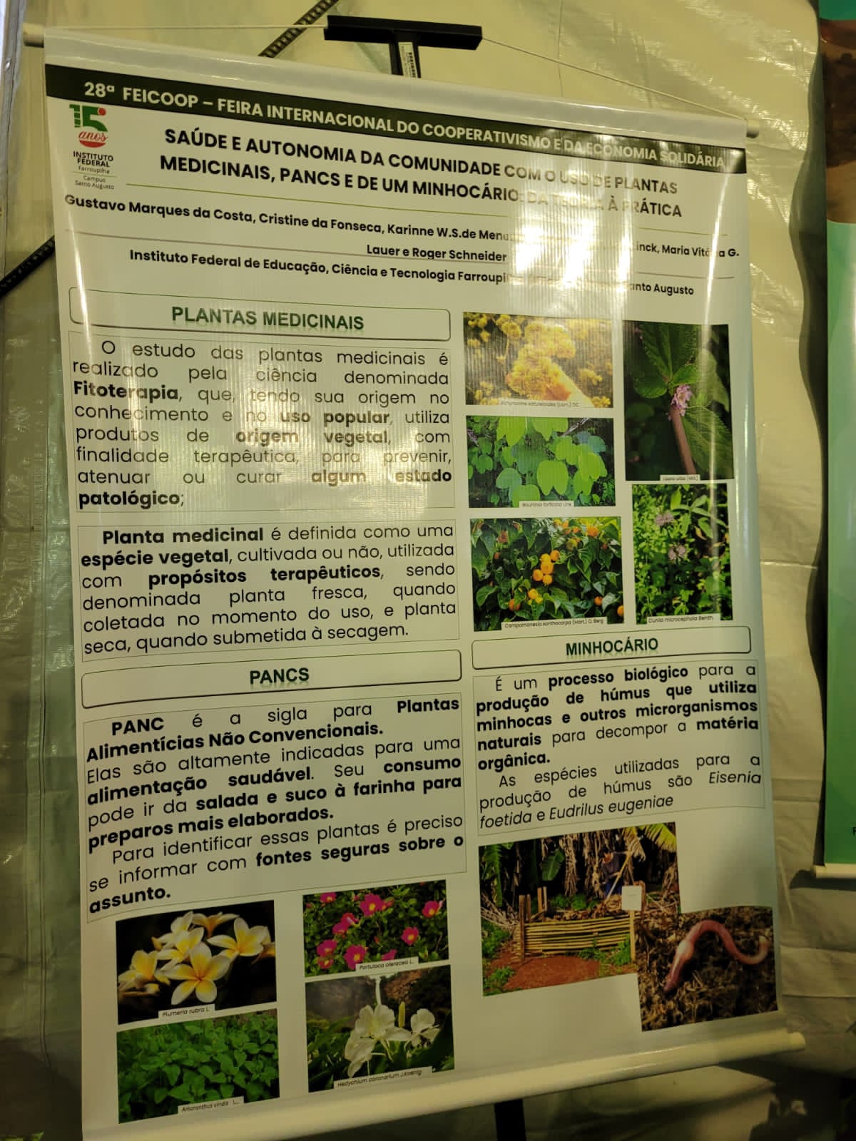 Na ocasião o grupo apresentou para a comunidade o Projeto de Extensão “Saúde e Autonomia da comunidade com o uso de Plantas Medicinais, Pancs e de Um Minhocário: Da Teoria À Prática”. O trabalho teve inicio a partir da disciplina de Botânica II, do curso Licenciatura em Ciências Biológicas, onde os estudantes realizaram sob a coordenação do professor Gustavo Marques da Costa, uma exposição sobre plantas medicinais do Rio Grande do Sul.