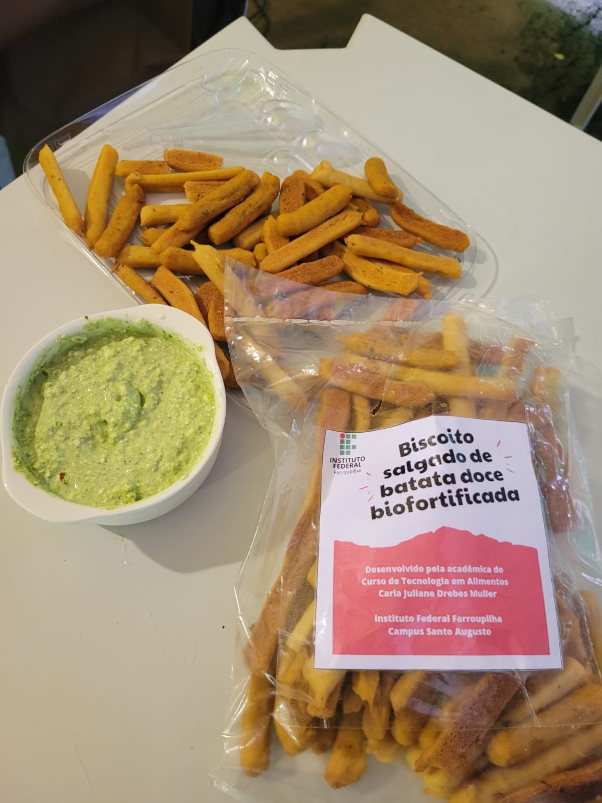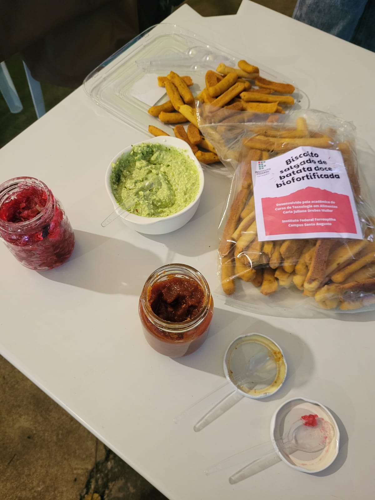 Tanto a geleia de flor de camélia, quanto a pasta de Ora-pro-nobis, puderam ser degustadas pelos visitantes, com um biscoito salgado, de batata doce biofortificada, rico em caroteno, desenvolvido pela acadêmica do curso superior de Tecnologia em Alimentos, Carla Juliane Drebes Muller.