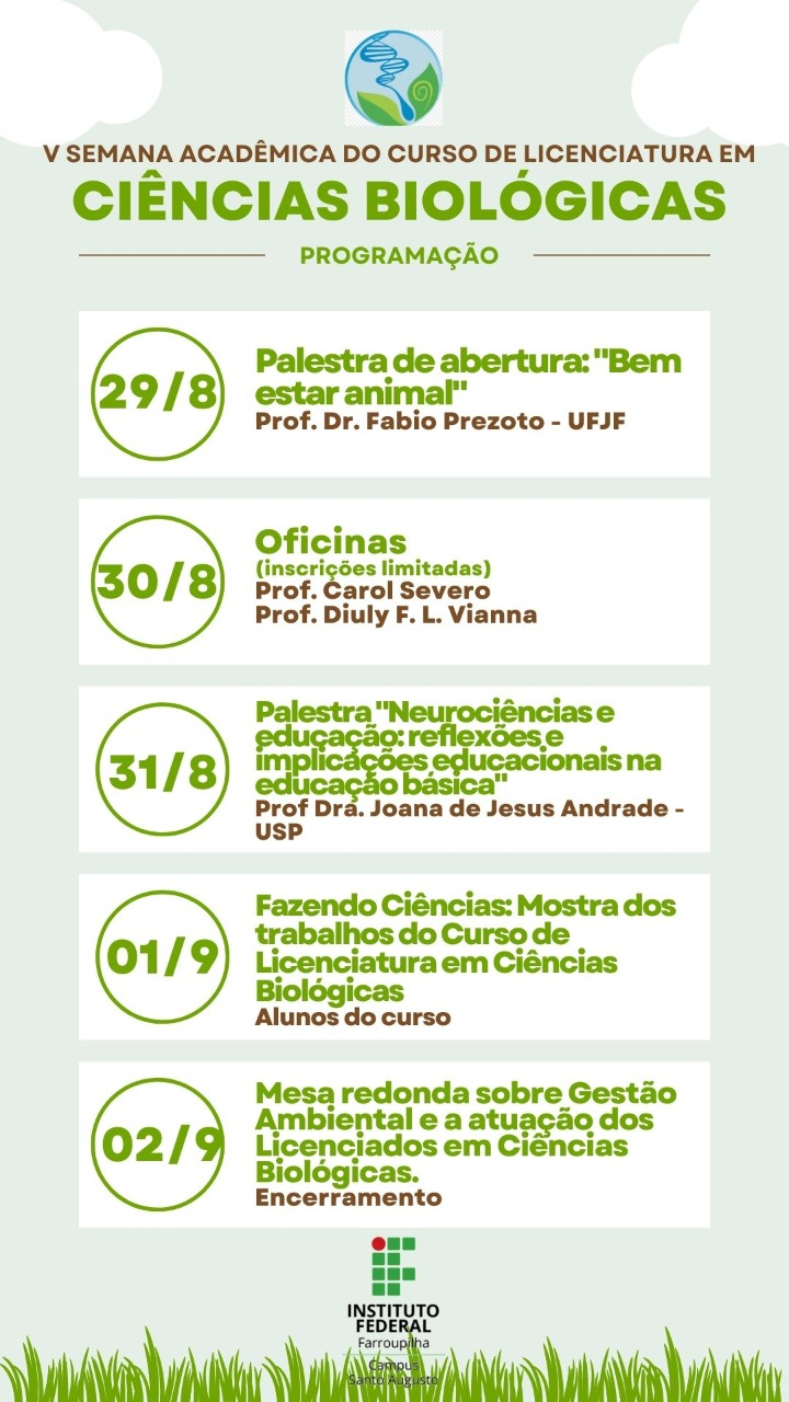 O Curso de Licenciatura em Ciências Biológicas do IFFar – Campus Santo Augusto promoveu de 29 de agosto a 02 de setembro a V Semana Acadêmica. O evento teve início na segunda-feira, dia 29, às 19h30 no auditório, com a palestra sobre “Bem estar animal”, ministrada online pelo professor da UFJF, Dr Fábio Prezoto.