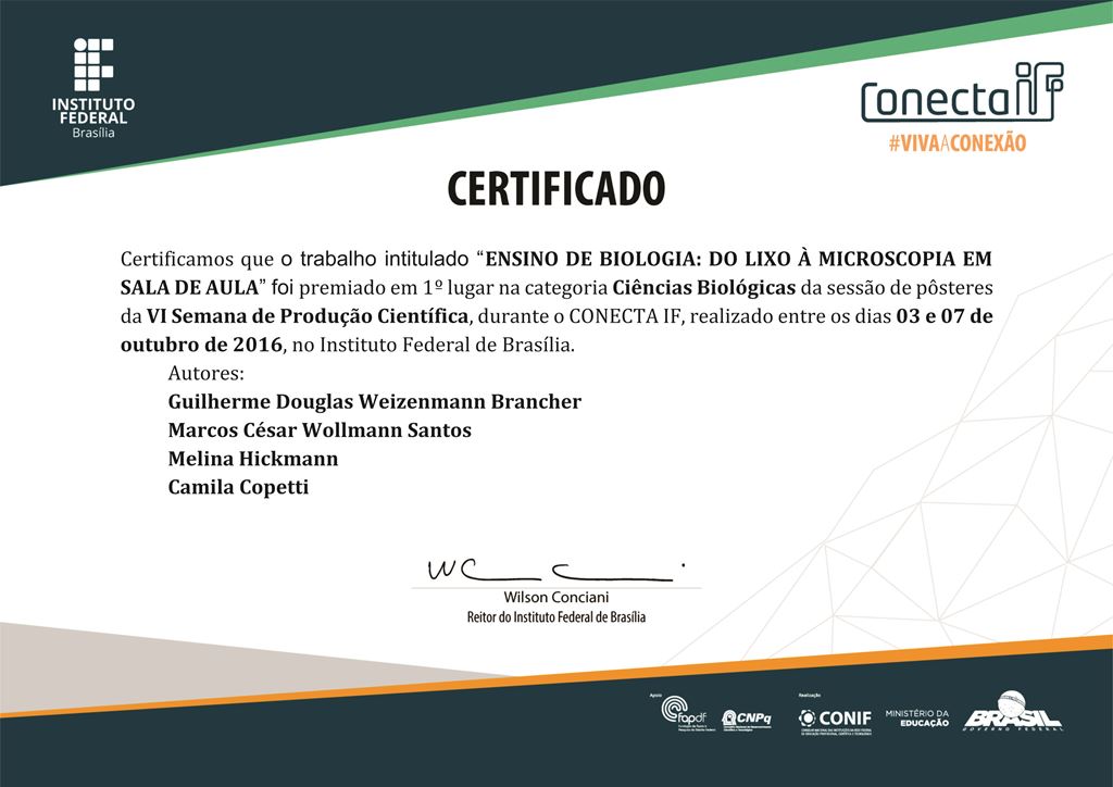 O trabalho foi submetido à VI Semana de Iniciação Científica do Conecta IF, realizado em Brasília no início do mês de outubro. Segundo a professora Camila, foram enviadas inclusive as imagens obtidas na prática de observação das células da mucosa bucal, bem como a observação de células vegetais a partir da planta aquática Elodea e o efeito da luz sobre o movimento dos cloroplastos. “Para a nossa alegria o trabalho foi aprovado! Apresentamos e recebemos muitos elogios por parte dos avaliadores, também professores de Biologia, pela criatividade, pela nitidez das imagens e principalmente por apresentarmos possibilidades baratas para a as aulas de Ciências e Biologia”.