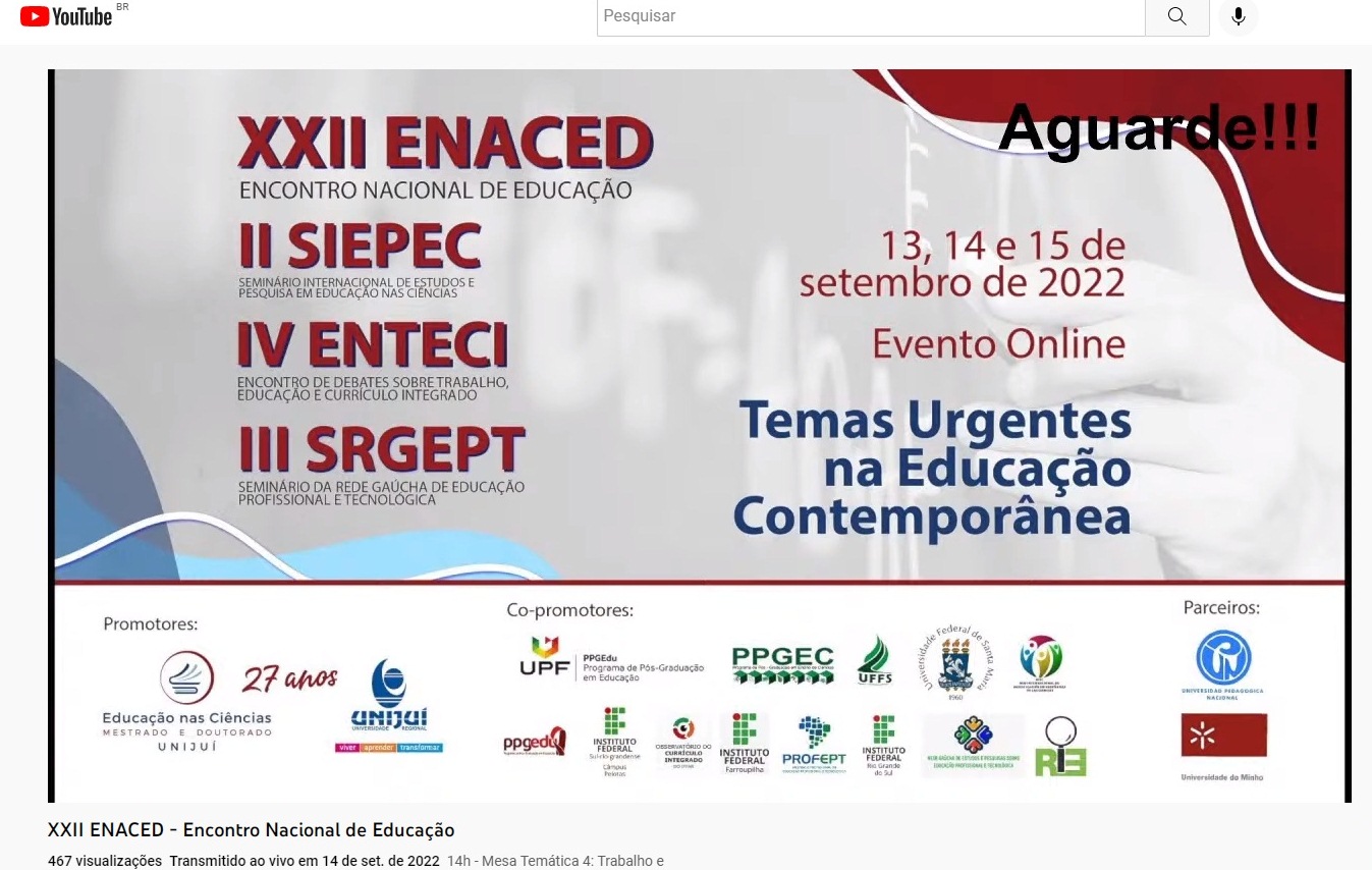 Foi realizado na tarde de ontem, 15 de setembro, às 15h20, o lançamento do Observatório do Currículo Integrado (OCI) do Instituto Federal Farroupilha, dentro da programação dos eventos integrados XXII ENACED, II SIEPEC, IV ENTECI e III SRGEPT, que se realizaram online nos dias 13, 14 e 15/09, com transmissão pelo Youtube da Unijuíí, em parceria com outras universidades, institutos federais e seus respectivos programas de pós-graduação - entre eles, o IFFar e o Programa de Pós-Graduação em Educação Profissional e Tecnológica - ProfEPT.