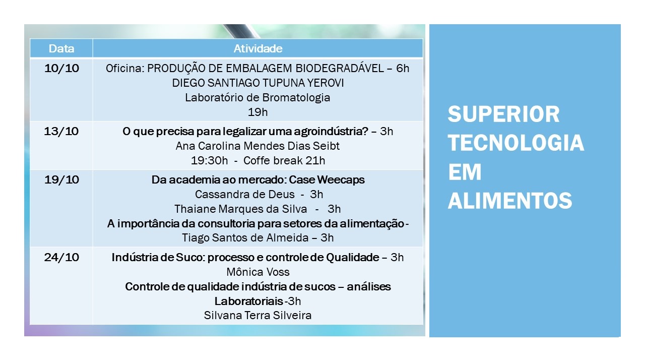 No dia 19 de outubro, às 19h, os acadêmicos participaram das seguintes palestras online: “Da academia ao mercado”, com Cassandra de Deus e Thaiane Marques da Silva da sturtup Weecaps, idealizada em 2020, com o propósito de ampliar os benefícios à saúde, através da incorporação de probióticos microencapsulados, seguida por “A importância da consultoria para setores da alimentação”, com Tiago Santos de Almeida da empresa Agrega Agro e Negócios que presta consultoria para campo, varejo e indústrias, treinamento e capacitação, habilitação e regularização documental RT e Rotulagem.