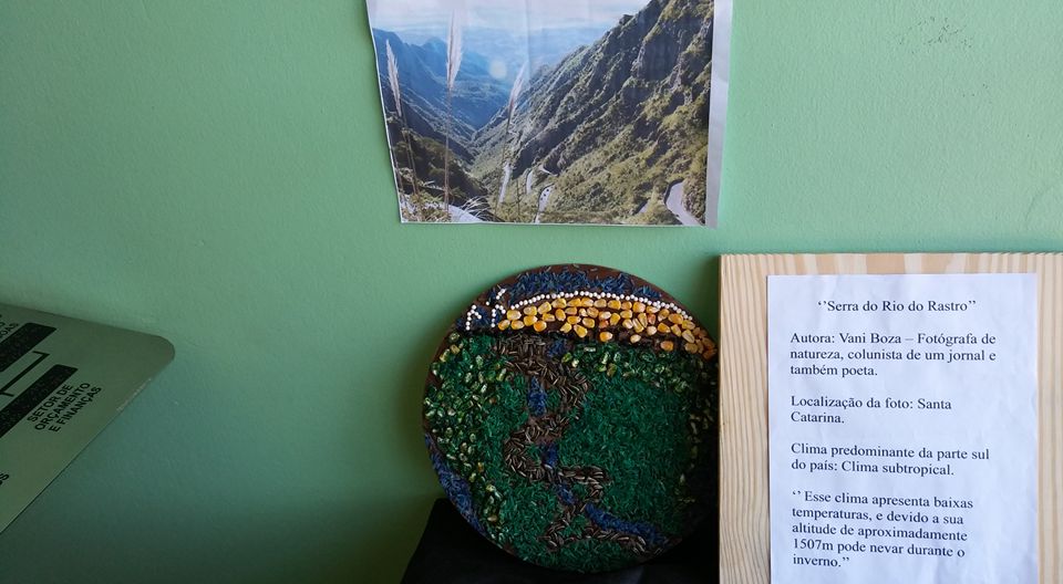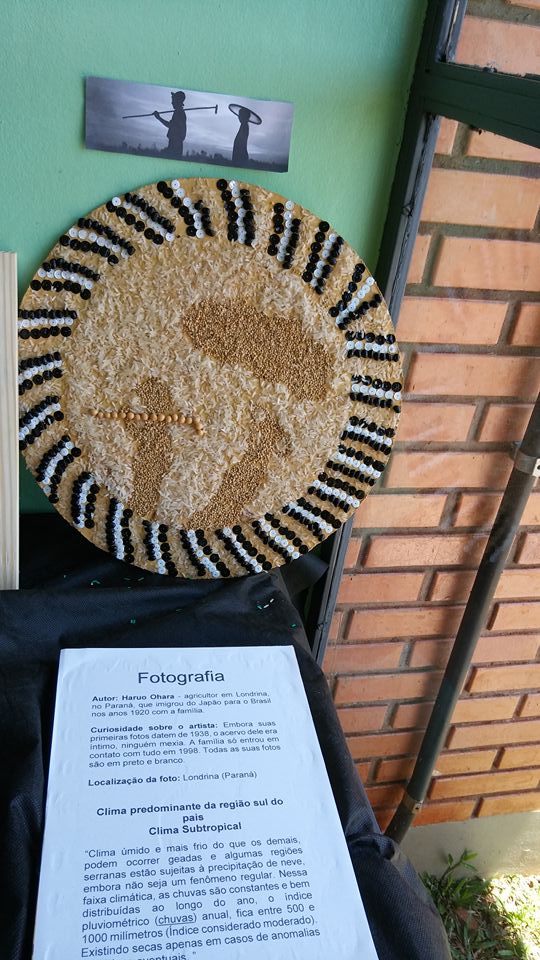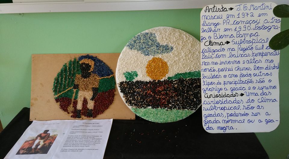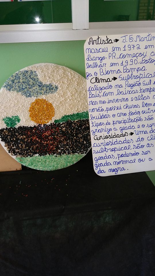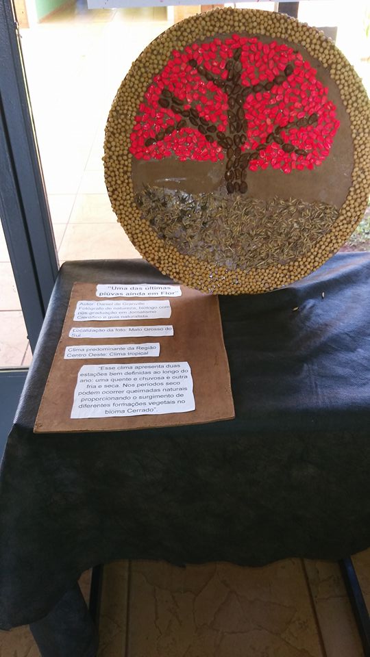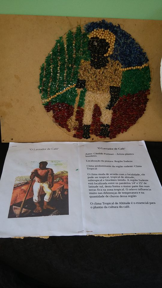 Os alunos realizaram pesquisas de fotógrafos brasileiros e através das fotografias analisaram os possíveis climas e paisagens do nosso país. Para a confecção das releituras fotográficas foram utilizados grãos, sementes e cascas de produtos agrícolas.