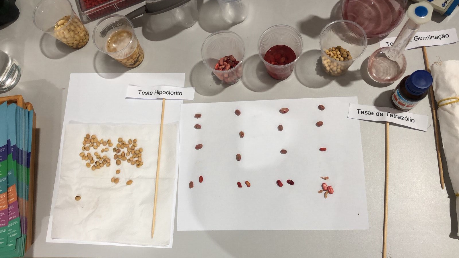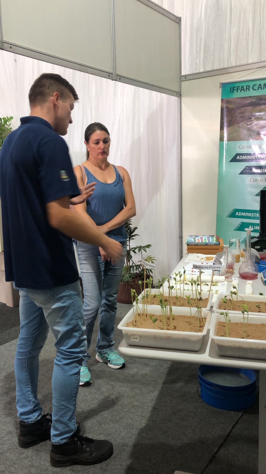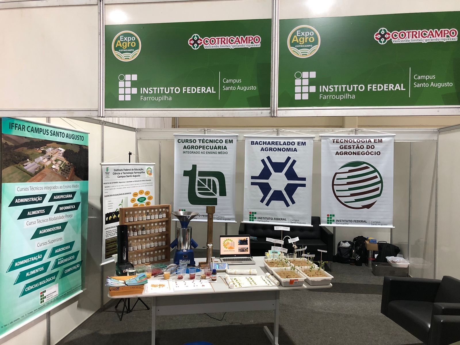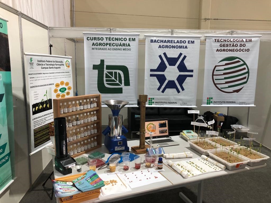 Na quinta-feira, dia 23, o estande ficou sob a responsabilidade dos cursos superiores de Bacharelado em Agronomia e Tecnologia em Gestão do Agronegócio e do curso técnico em Agropecuária integrado ao ensino médio. Na ocasião, os estudantes de Agronomia, Darlan Dörtelmann, Hernan Stumm, Luis Juliani e Alessandra Stroher, membros do Grupo Pós-Col: Ensino, Pesquisa e Extensão em Pós-Colheita e Qualidade de Grãos e Sementes, sob a supervisão do professor Ricardo Paraginski, organizaram no espaço da instituição, as análises de qualidade de sementes realizadas, onde foram elaborados testes de germinação, apresentando diferenças de qualidade de sementes de alto vigor, esverdeadas e com manchas púrpuras. Ainda, foram apresentados os testes de umidade, matérias estranhas e impurezas, germinação, vigor, teste de hipoclorito e testes de tetrazólio, além de um sementário elaborado pelo estudante de Agronomia, Everton Bueno, na Disciplina de Produção e Tecnologia de Sementes e doado a instituição. Os alunos do 2º ano do técnico em Agropecuária, acompanhados pelas professoras Eliane Rotilli e Patrícia Mombach, também estiveram presentes no evento nesse dia.