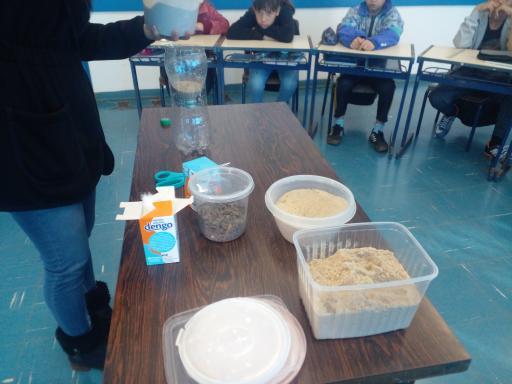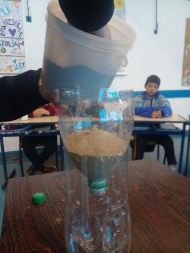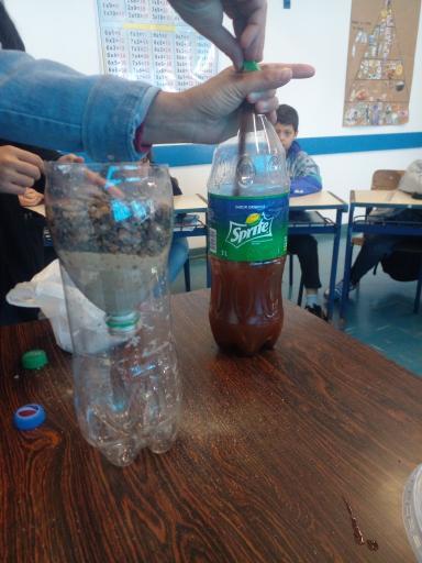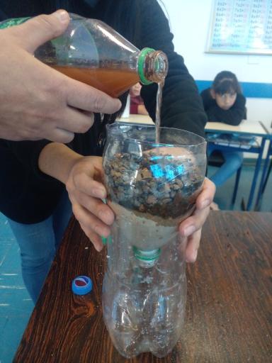 Foram utilizados na confecção do filtro os seguintes materiais: garrafas pet de 2 litros, algodão, areia fina, areia grossa e pedras finas. As garrafas foram cortadas de modo a retirar a tampa, na qual foi colocado o algodão, areia fina, areia grossa e as pedras finas, em seguida num outro recipiente foi feita uma mistura de terra e água, a qual foi colocada no filtro para mostrar como ocorre o processo de filtração da água.