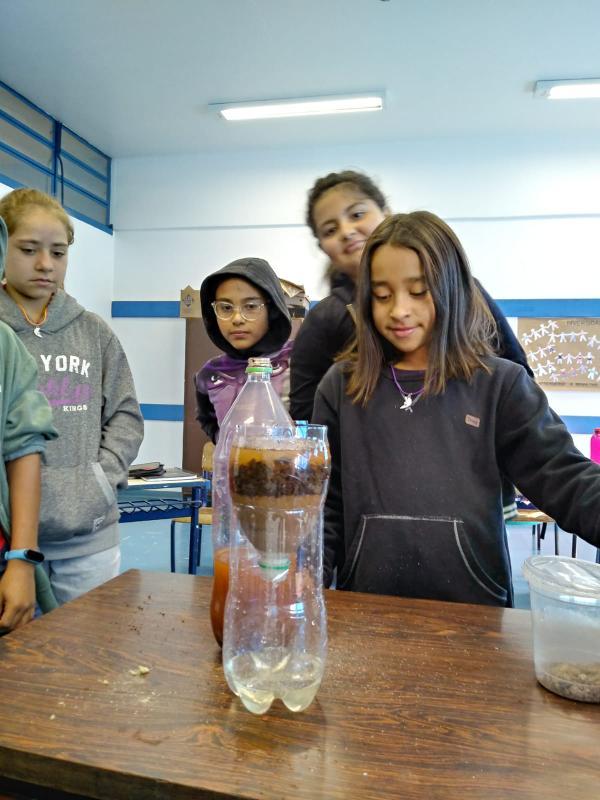 Acadêmicas de Licenciatura em Ciências Biológicas produzem filtro de água caseiro com estudantes do 5º ano do ensino fundamental