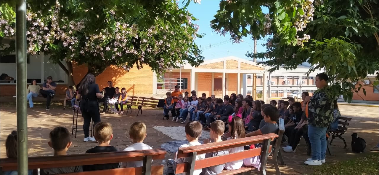 No dia 17 de maio, o projeto de extensão “Biblioteca em Ação: contar, encantar e educar”, desenvolvido no IFFar – Campus Santo Augusto, recebeu a visita de alunos do 1º ao 5º ano da Escola Municipal de Ensino Fundamental Vó Maria, de São Valério do Sul, acompanhados pelo professor Felipe Saggin, egresso da Licenciatura em Ciências Biológicas.