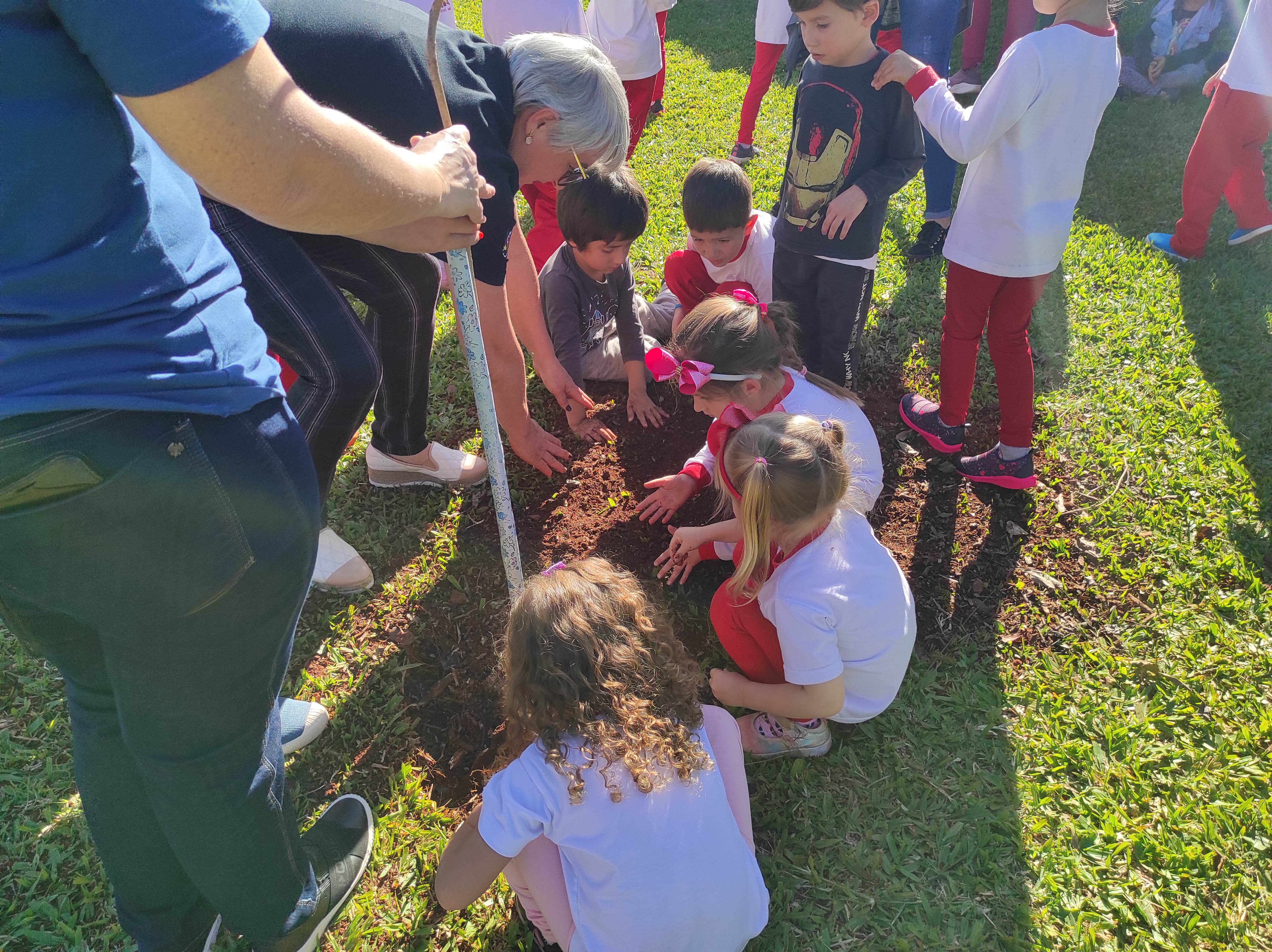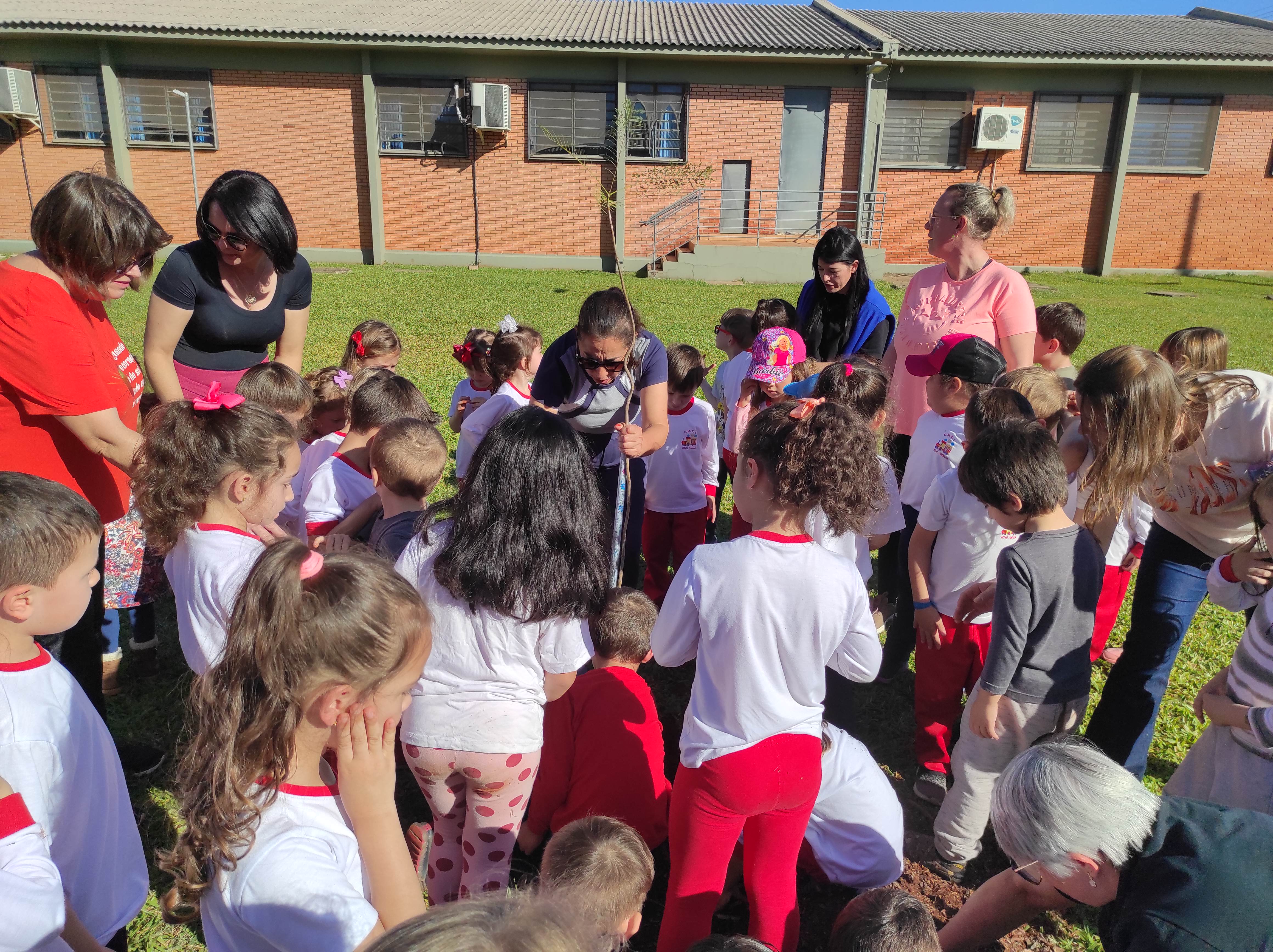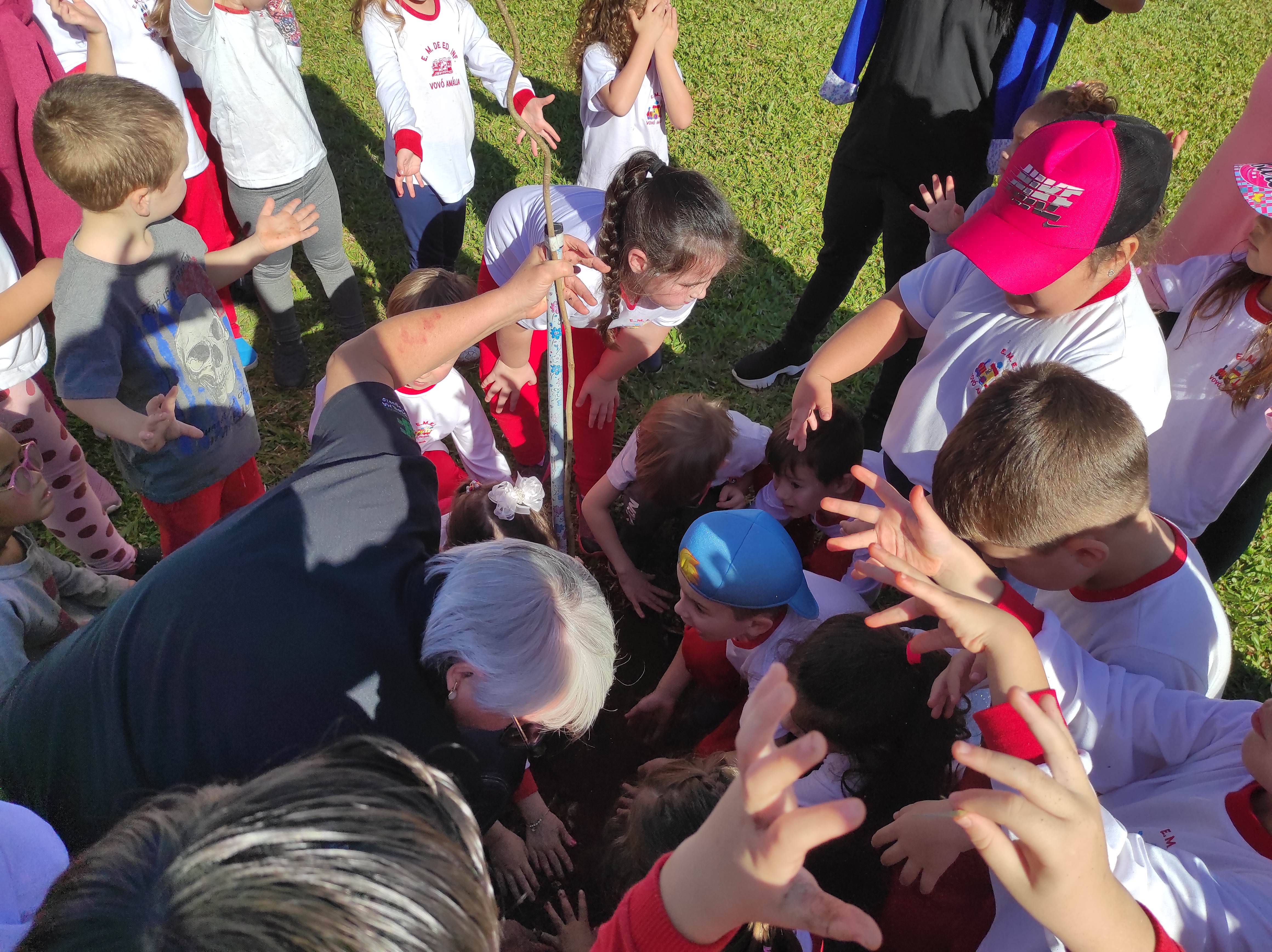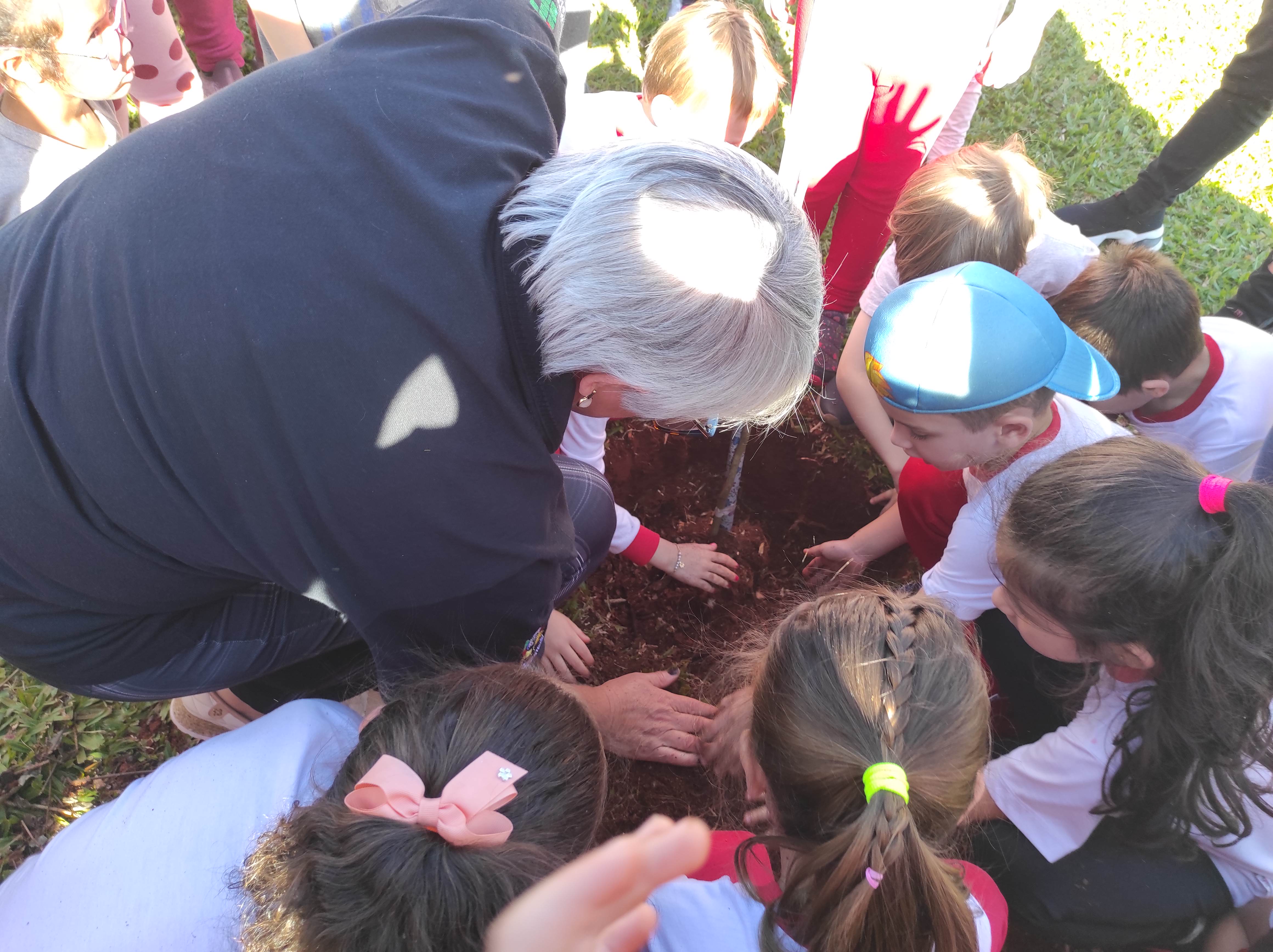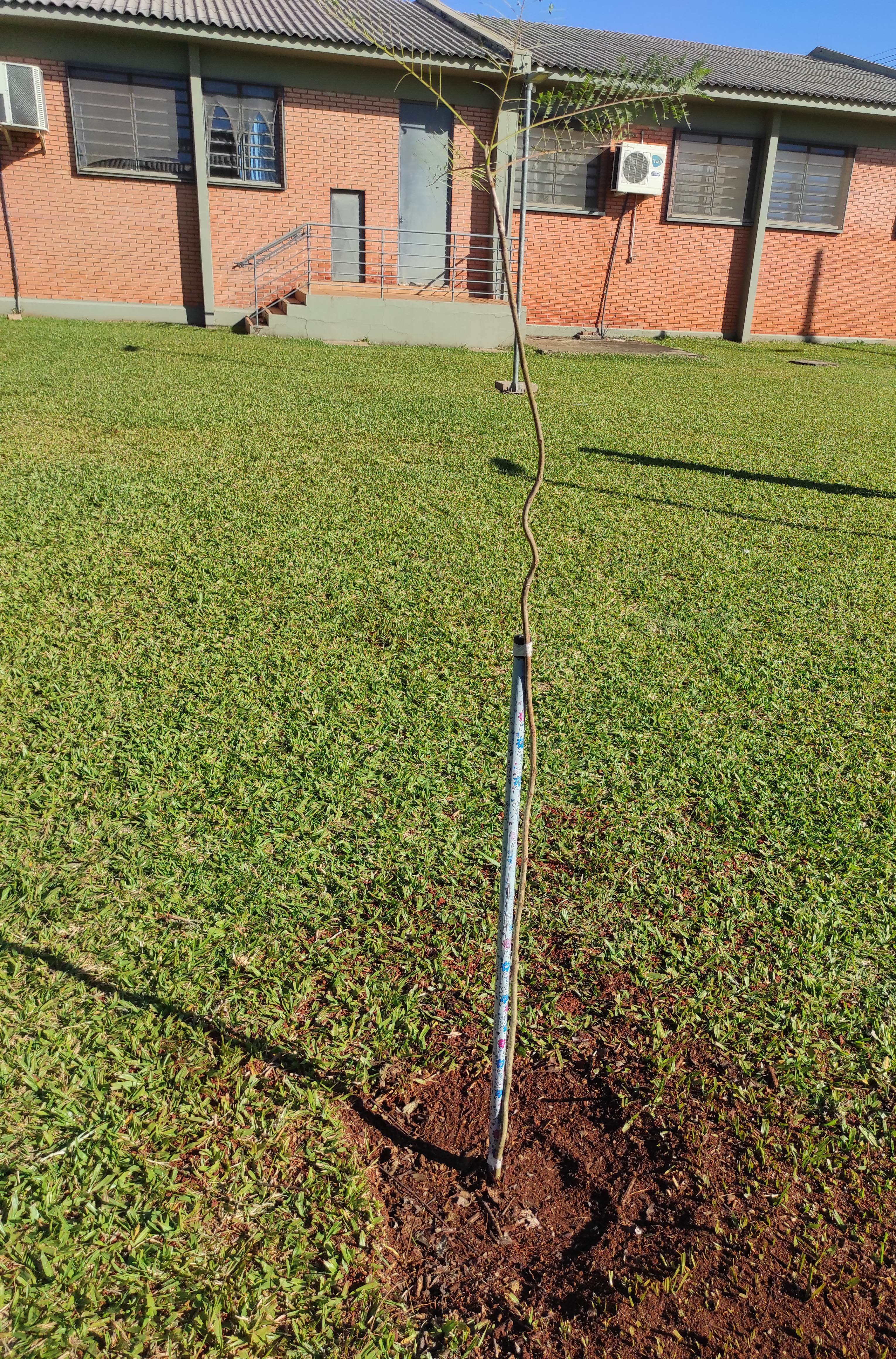 Na tarde desta quinta-feira, 18 de maio, estudantes da Escola Municipal de Educação Infantil Vovó Amália, acompanhados por professores e pela Diretora Márcia Castro, vieram até o IFFar – Campus Santo Augusto, para plantar uma muda de jacarandá-mimoso.