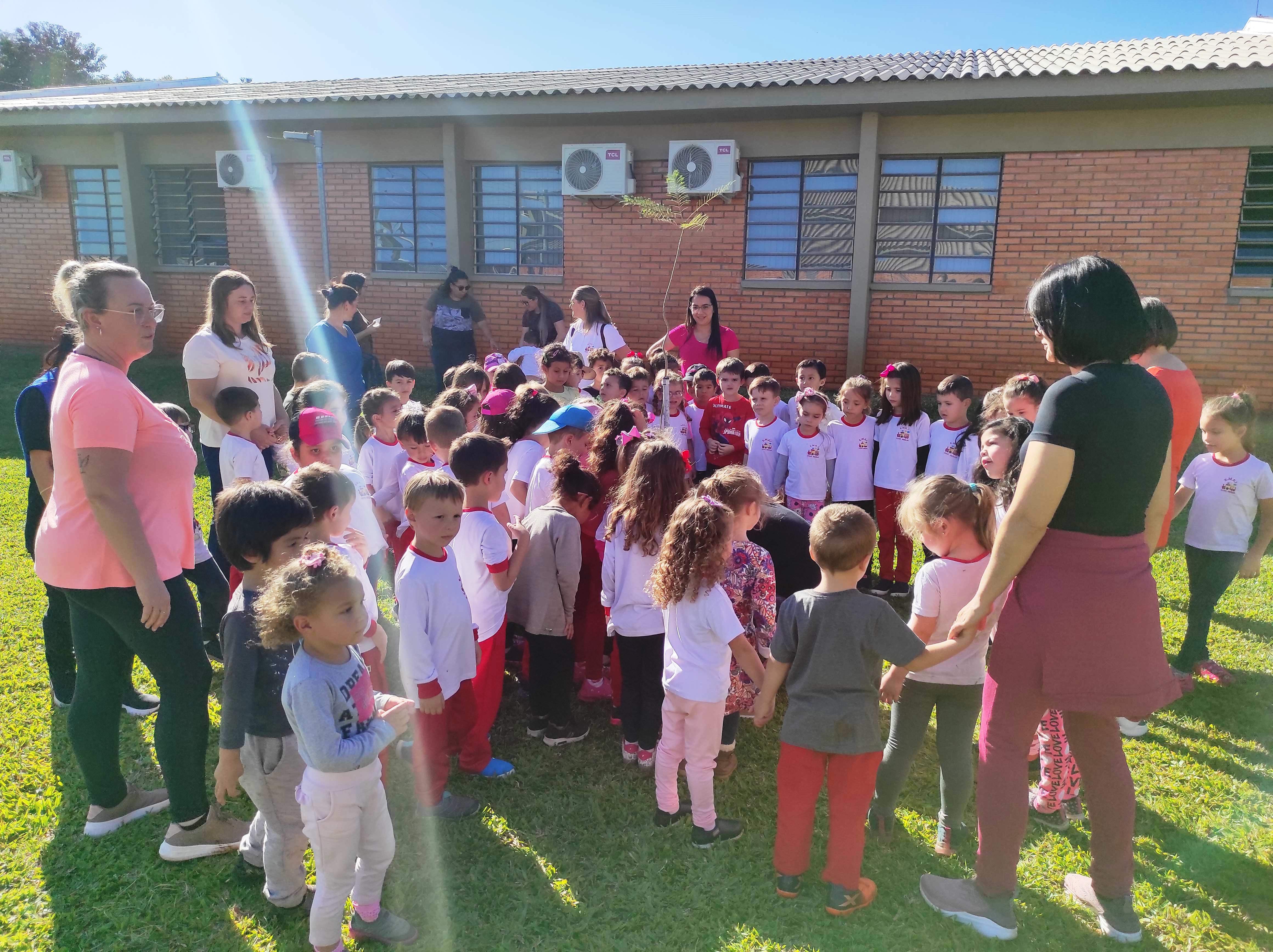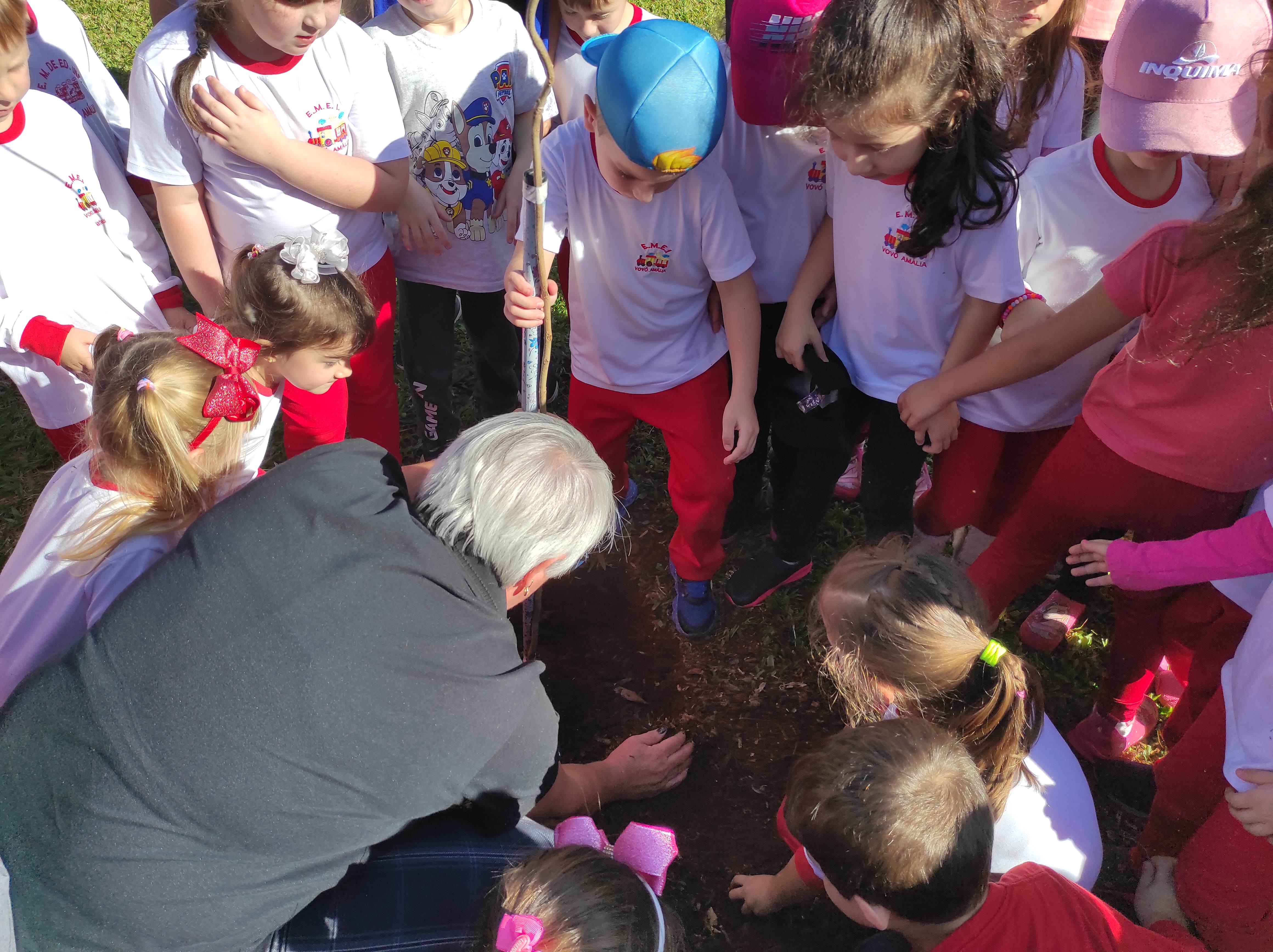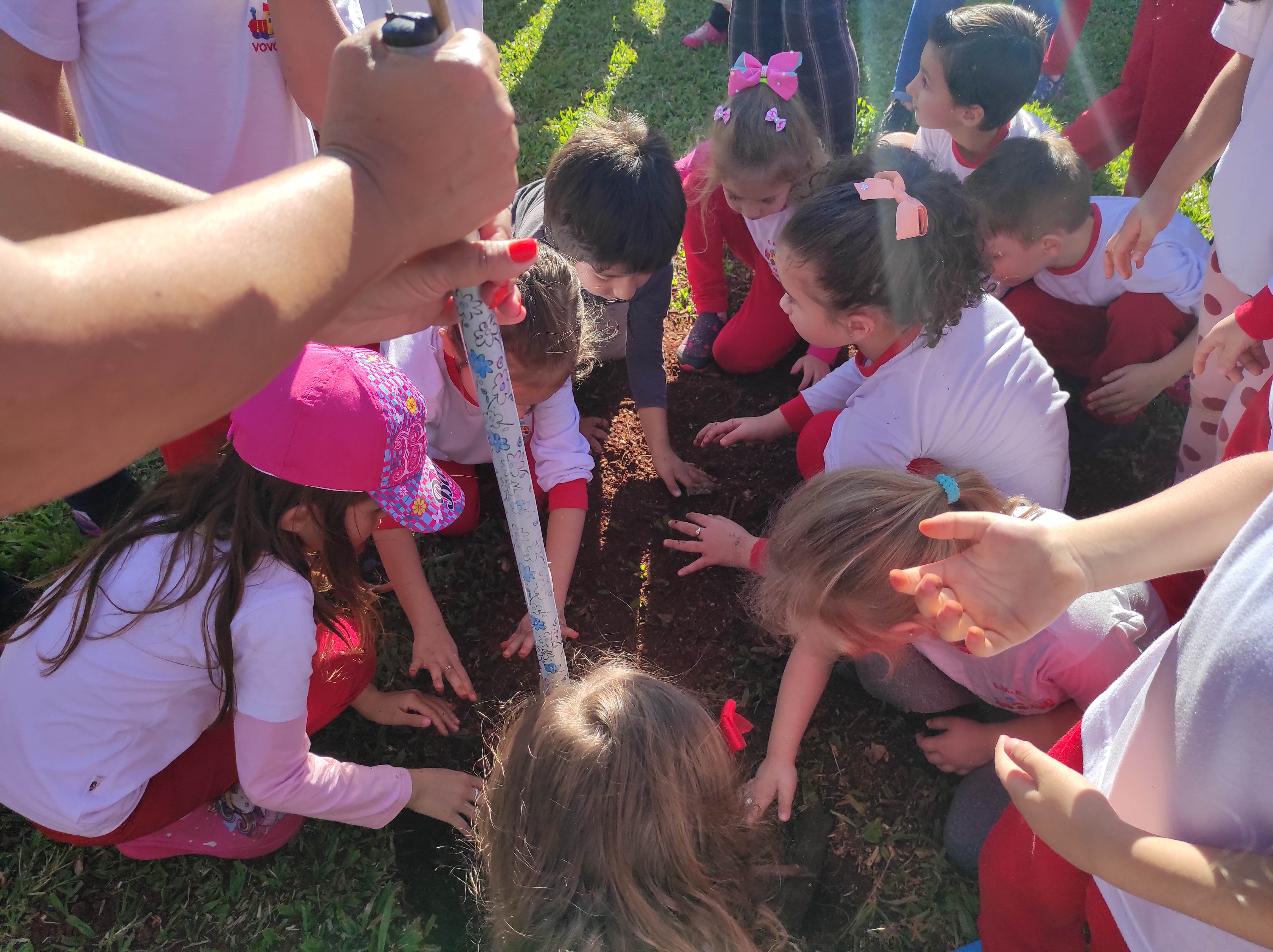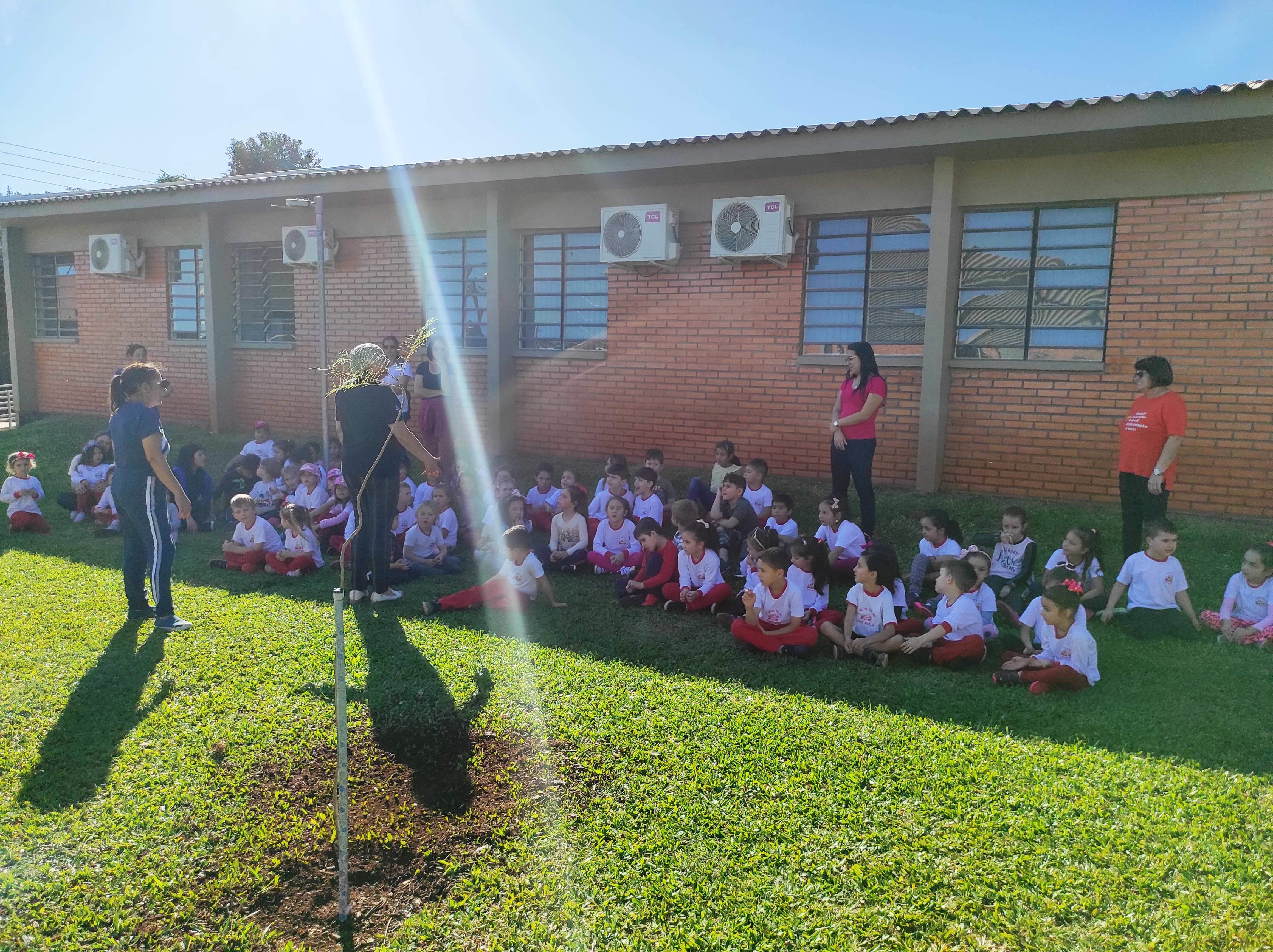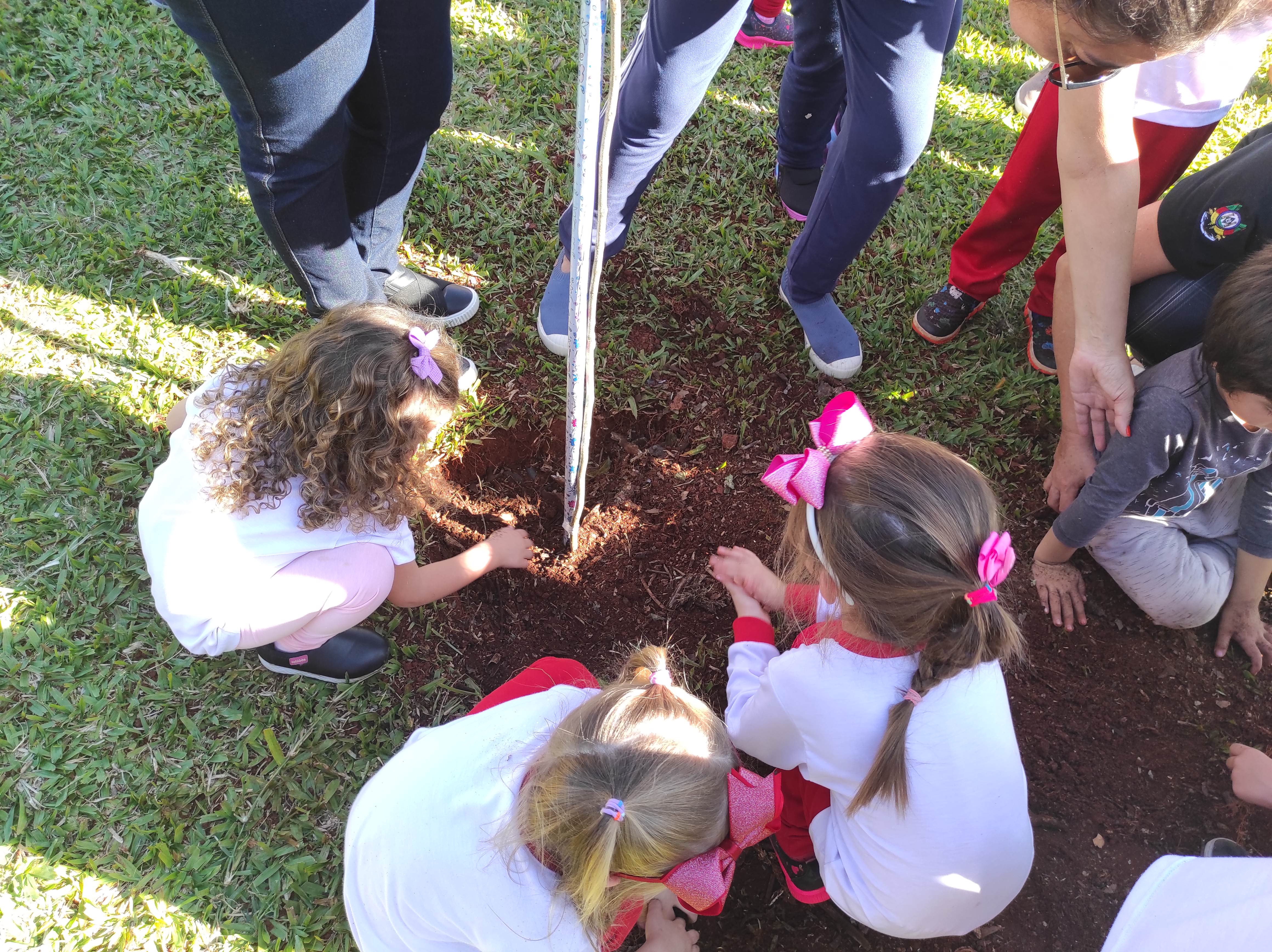 Na tarde desta quinta-feira, 18 de maio, estudantes da Escola Municipal de Educação Infantil Vovó Amália, acompanhados por professores e pela Diretora Márcia Castro, vieram até o IFFar – Campus Santo Augusto, para plantar uma muda de jacarandá-mimoso.