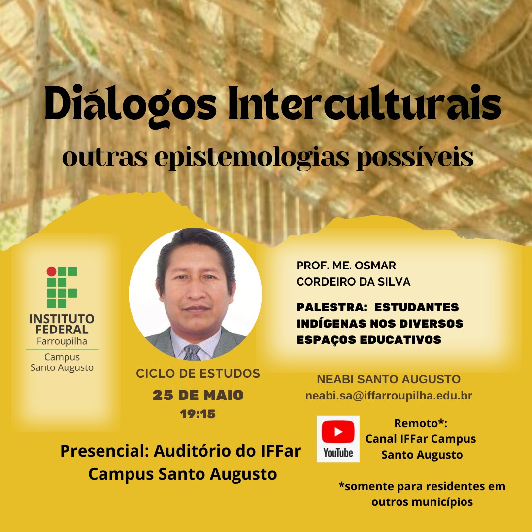 O projeto, intitulado "Diálogos Interculturais: outras epistemologias possíveis", promovido pelo Núcleo de Estudos Afro-brasileiros e Indígenas - NEABI do IFFar - Campus Santo Augusto, está sendo ofertado na modalidade presencial, sendo um encontro por mês, até setembro, no turno da noite. Os moradores de outros municípios participam de forma remota através do canal no You Tube do IFFar - Campus Santo Augusto. Parte da carga horária do curso será destinada para leituras e sistematização dos conhecimentos. A carga horária total é de 30 horas, com certificação.