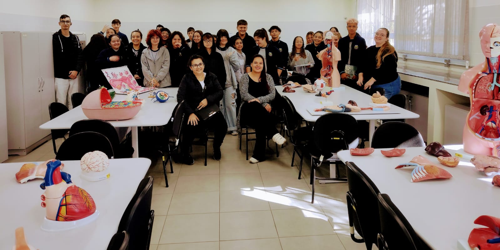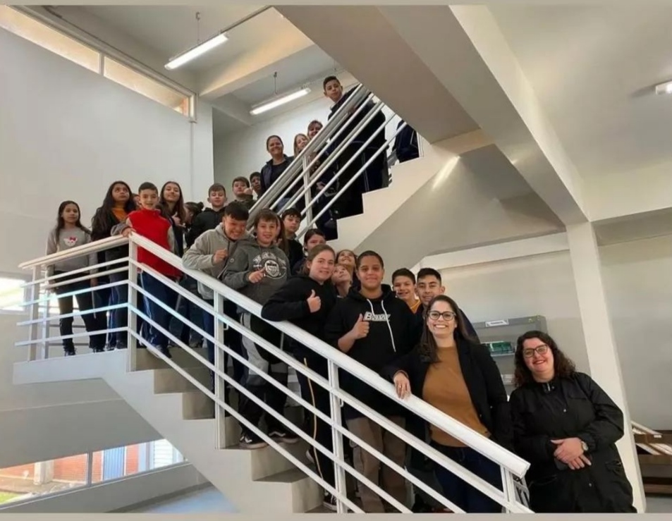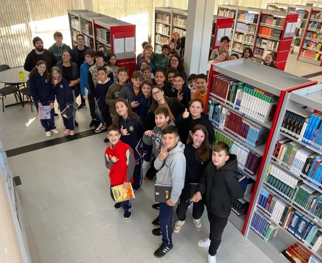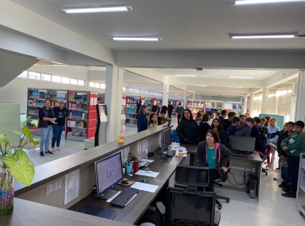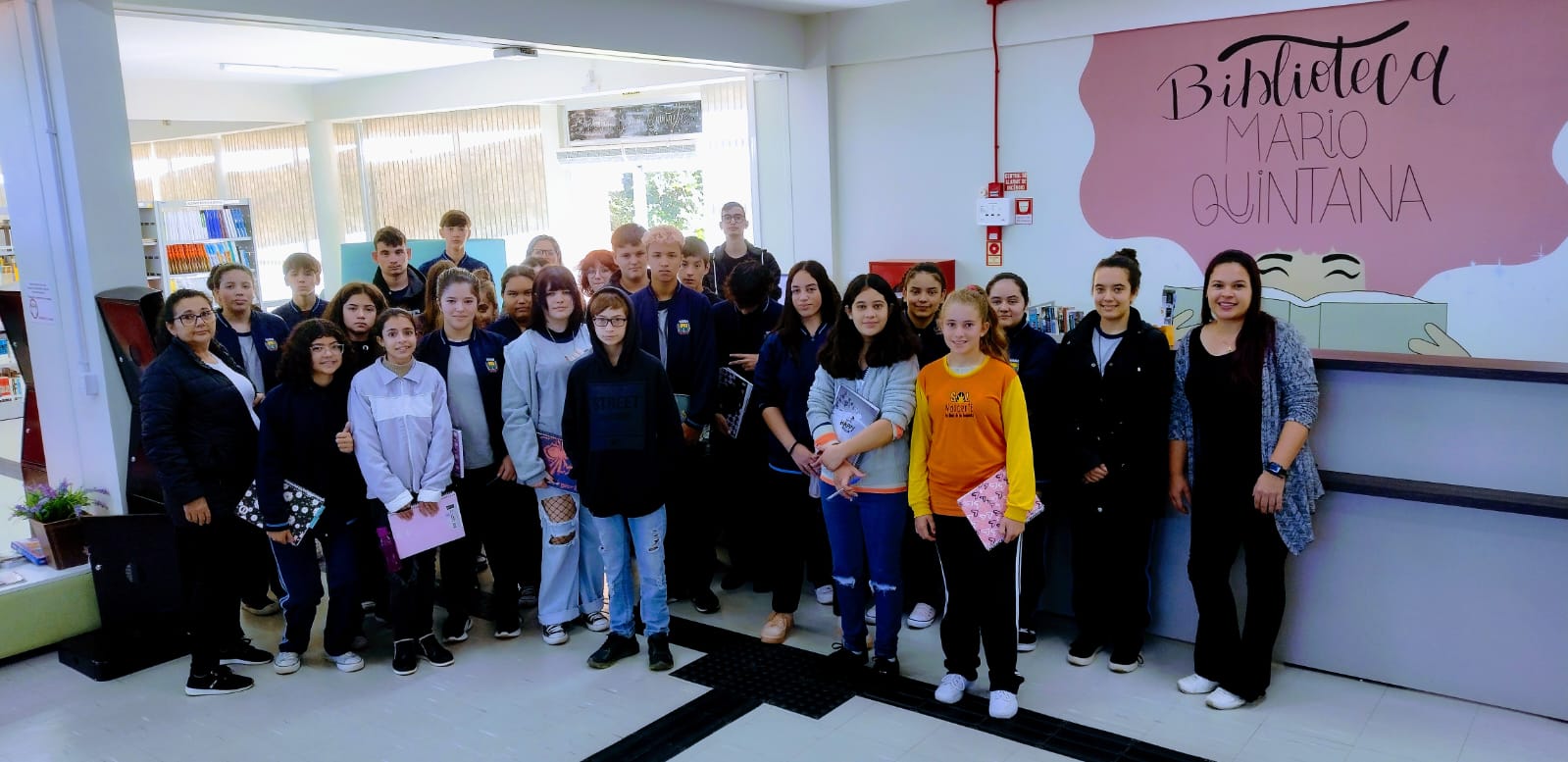 Após a palestra, os visitantes, acompanhados pelos bolsistas do PIBID, puderam conhecer a instituição, principalmente a Biblioteca Mario Quintana e os laboratórios de Biologia Geral e de Zoologia.