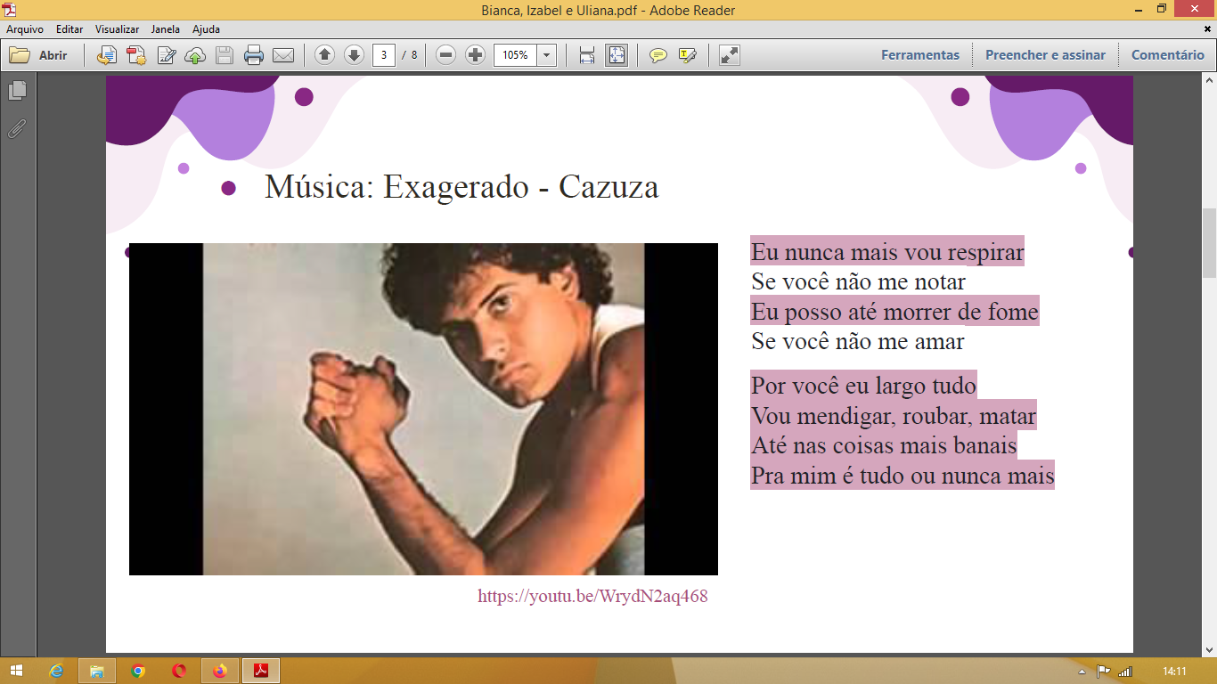 Divididos em duplas e trios os estudantes deveriam identificar cinco figuras de linguagem em letras de músicas nacionais e depois explicar o conceito de cada figura e exemplificar com o trecho da música. A atividade obteve uma boa aceitação das turmas, pois as músicas e as figuras de linguagem apresentadas foram escolhidas pelos estudantes, com a supervisão do professor.