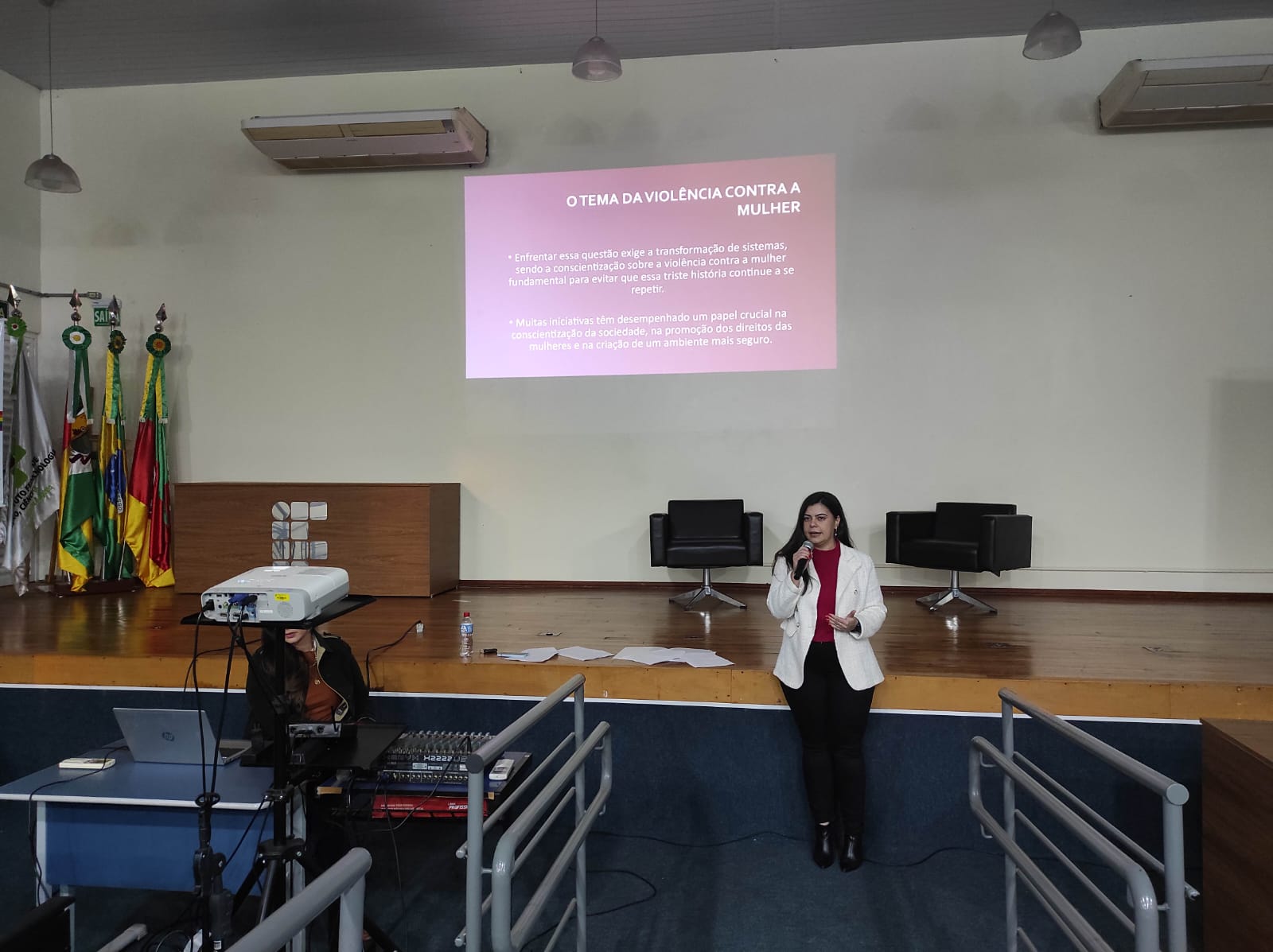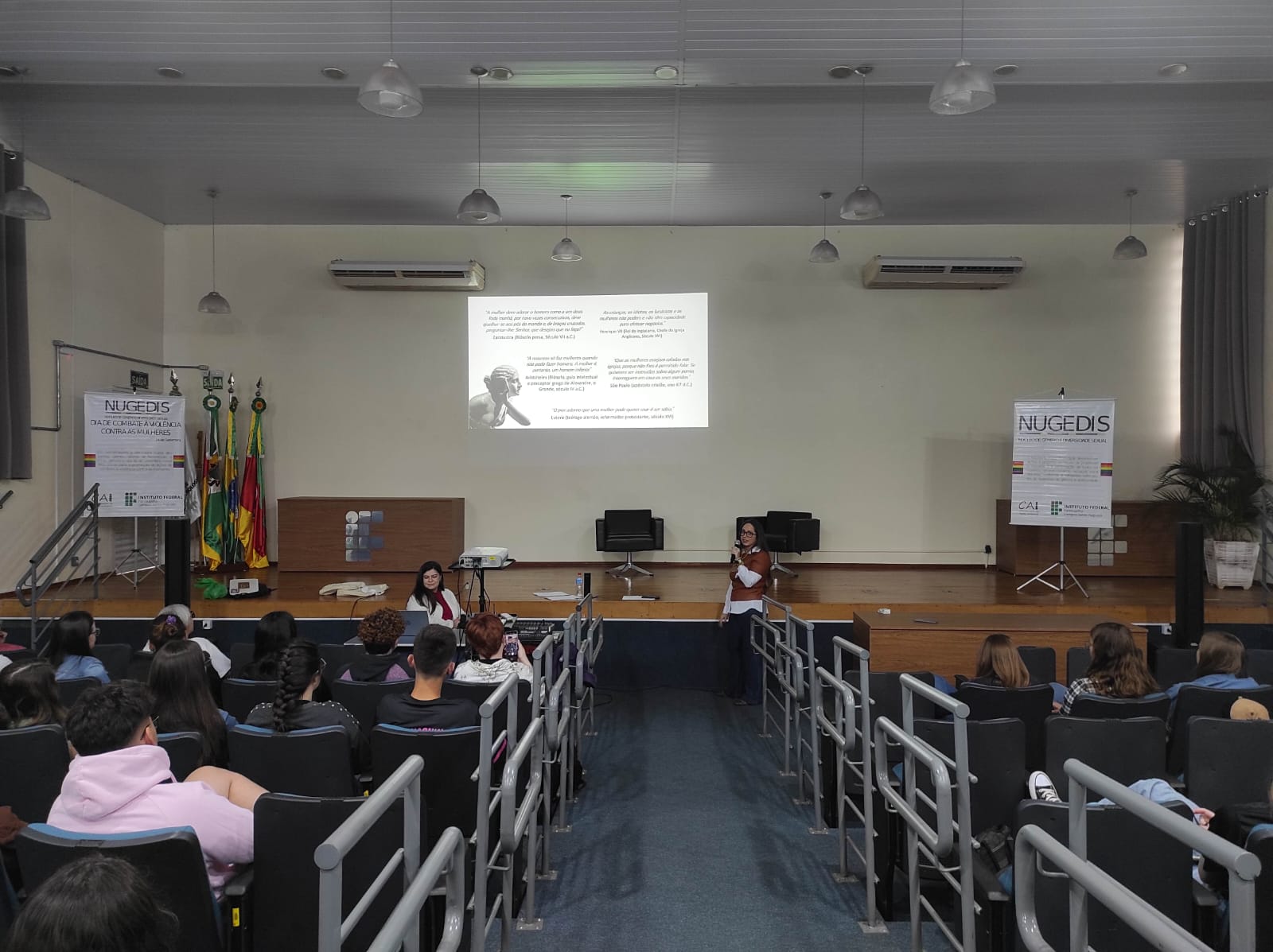 Segundo as palestrantes, a violência contra a mulher é um problema global e histórico, que se manifesta em várias formas. “Trata-se de uma violação dos direitos humanos e barreira para a igualdade de gênero, requerendo conscientização, proteção das vítimas e mudança de atitudes. Desde os tempos antigos e também na atualidade, as mulheres enfrentaram e ainda enfrentam diversas formas de abuso, subjugação e discriminação, muitas vezes justificadas por normas sociais e sistemas patriarcais. Apesar de tudo, esta é também uma história de resistência e luta, com mulheres ao longo dos séculos defendendo seus direitos, promovendo a igualdade de gênero e impulsionando avanços legais e sociais significativos na busca por um mundo mais justo e igualitário”.