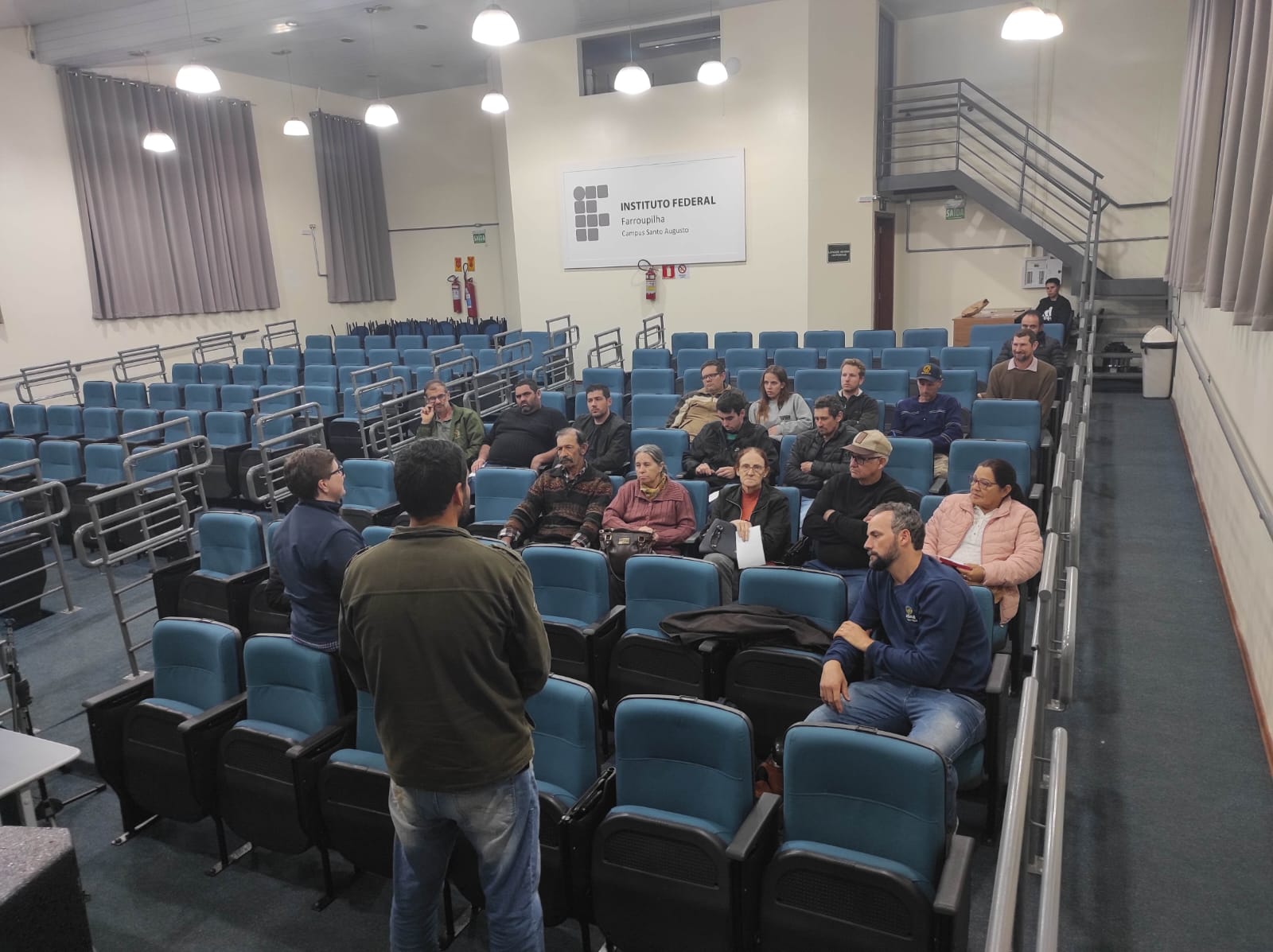Participaram da reunião agricultores familiares e proprietários de agroindústrias de Santo Augusto e região, bem como representantes da Emater e Senar, os quais foram recebidos pela Diretora Geral do IFFar – Campus Santo Augusto, Márcia Fink, pelo Diretor de Pesquisa Extensão e Produção, Ricardo Paraginski, pelo Coordenador de Licitações e Contratos, Leônidas Assunção e pela Coordenadora da Assistência Estudantil substituta, Daniele Uhlmann Anacleto.
