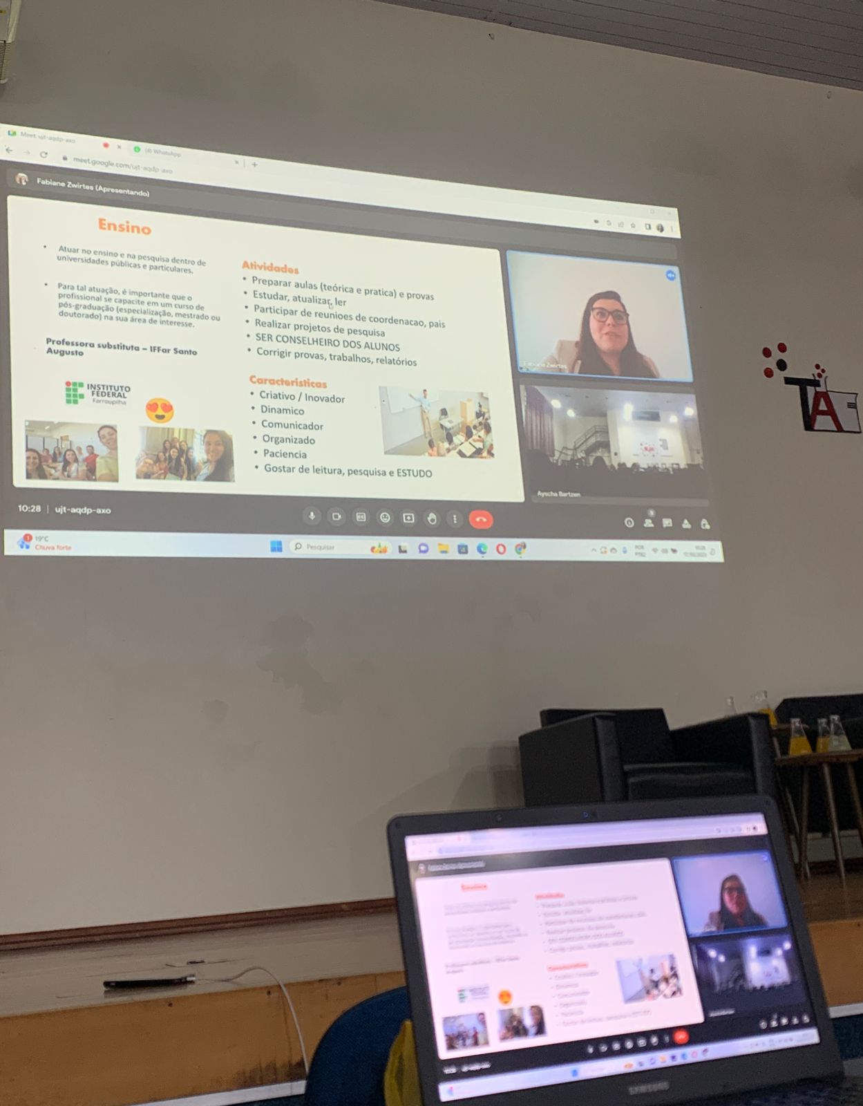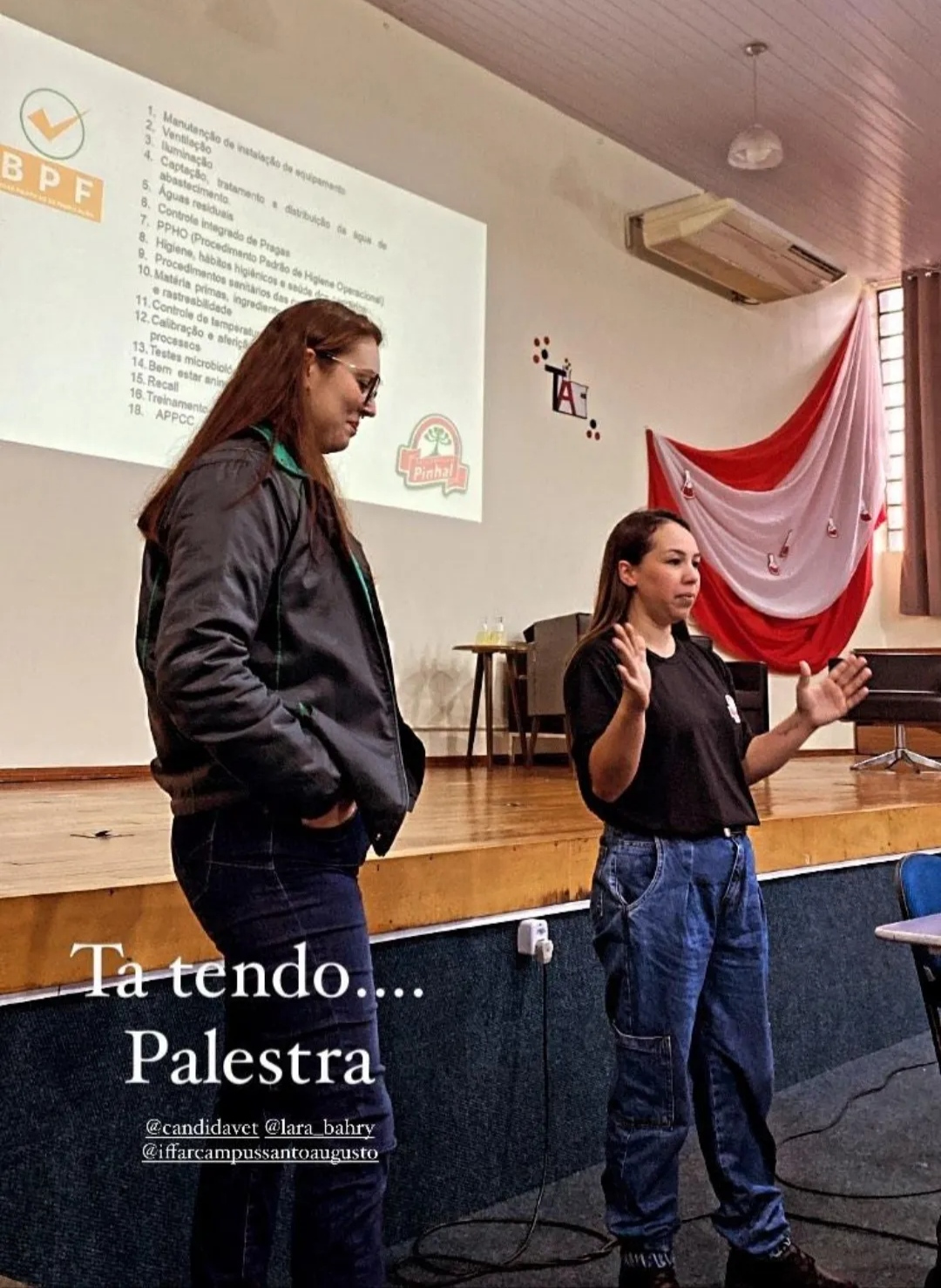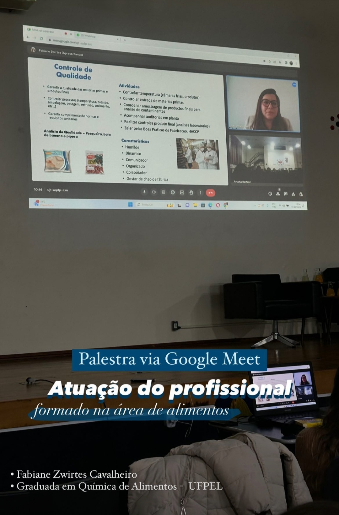 Na quarta-feira, dia 18, às 8h, foi realizada a palestra sobre “Controle de Qualidade”, com a supervisora do Frigorífico Pinhal de Santo Augusto, Daniela Oliveira Salvati, com a responsável pelo controle de qualidade, Lara Bahry e com a RT da empresa, a médica veterinária Cândida Lodi Faccio. Na sequência, às 9h50, foi realizada a palestra por webconferencia sobre “Atuação do profissional formado na área de alimentos”, com a professora Drª. Fabiana Zwirtes.