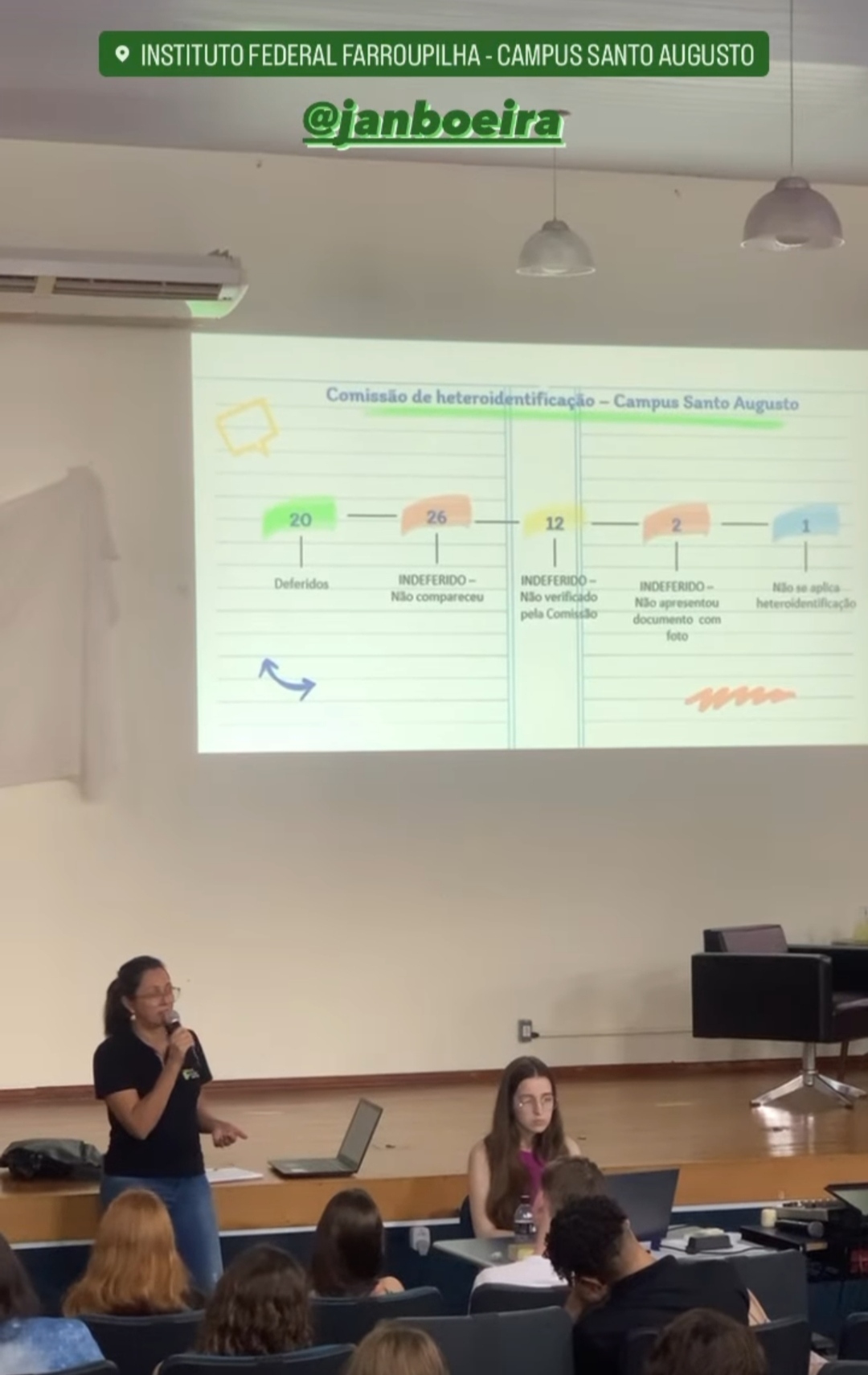 O evento teve início na segunda-feira, dia 16, às 14h, com apresentações artísticas, seguida pela palestra “Descomplicando o Prouni, Fies e Sisu”, com a Nutricionista do IFFar – Campus Santo Ângelo, Ma. Fernanda Martini de Andrade, com a colaboração da professora Ma. Janice Boeira, que explicou um pouco como funcionam as cotas raciais no IFFar e o processo de heteroidentificação.