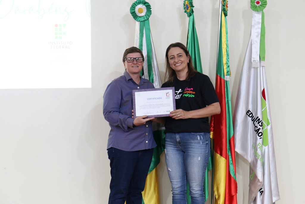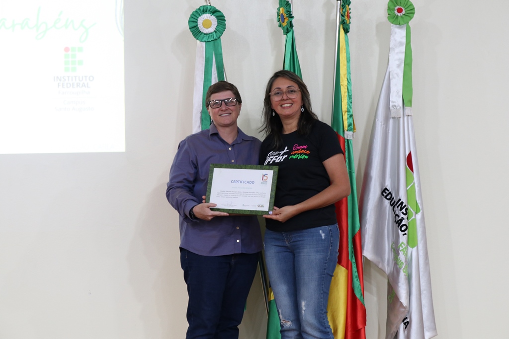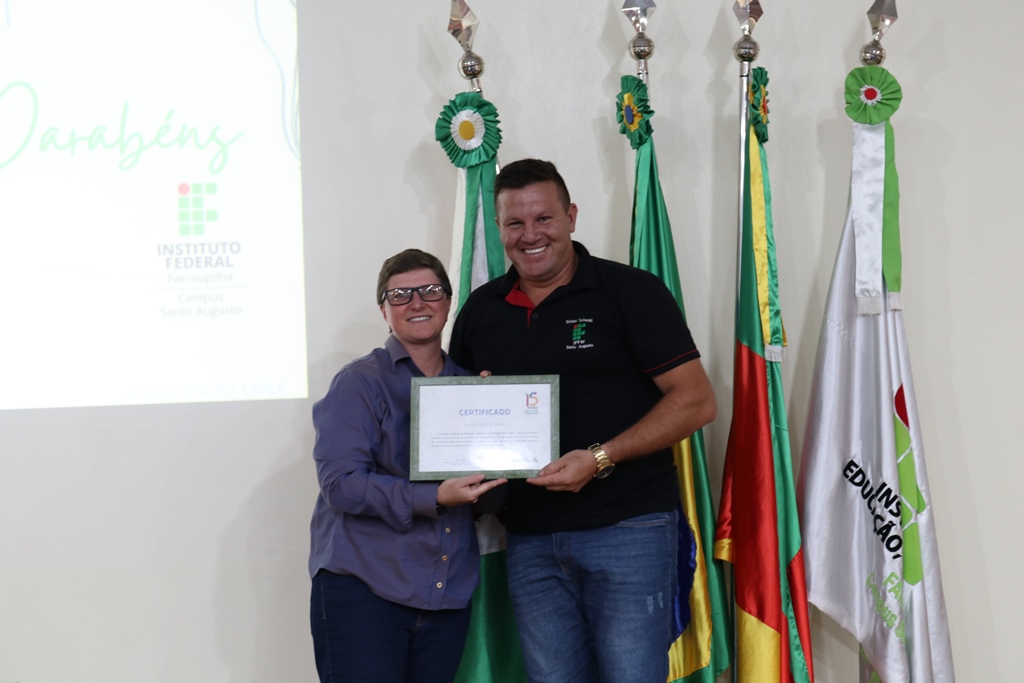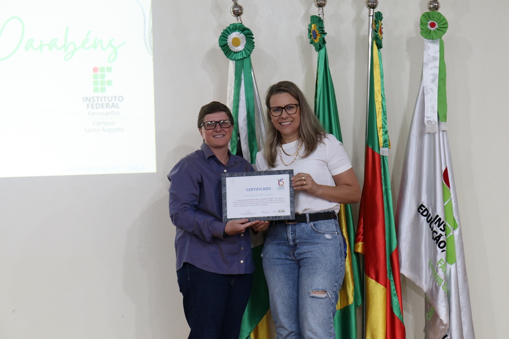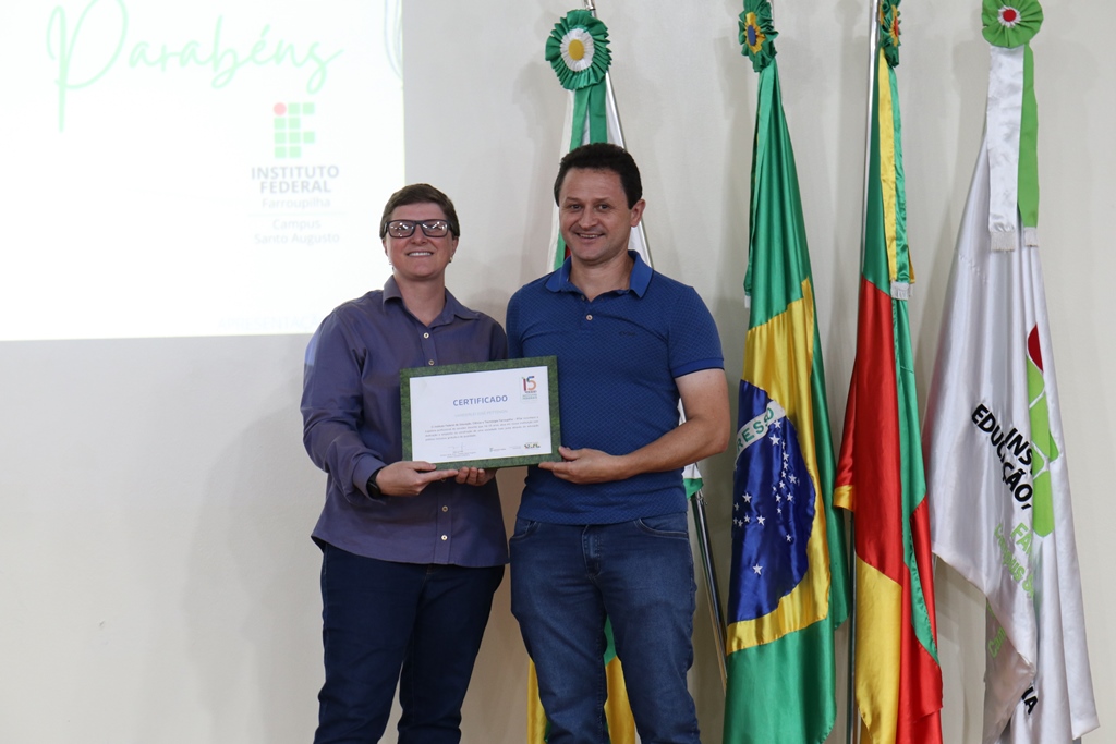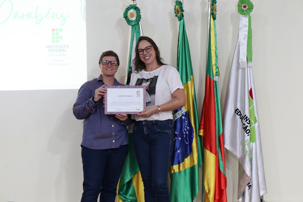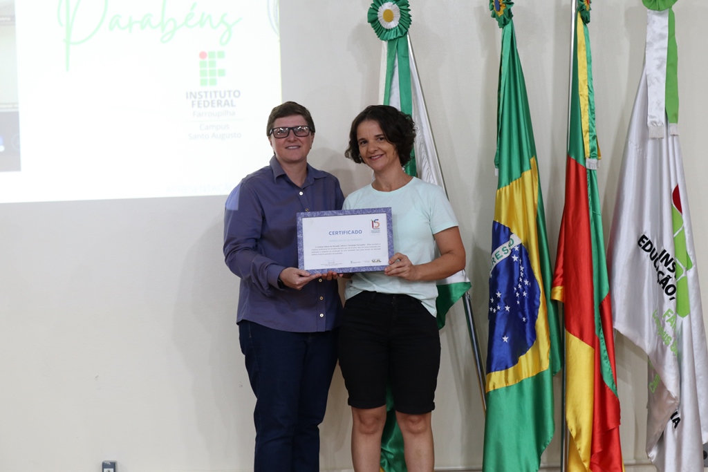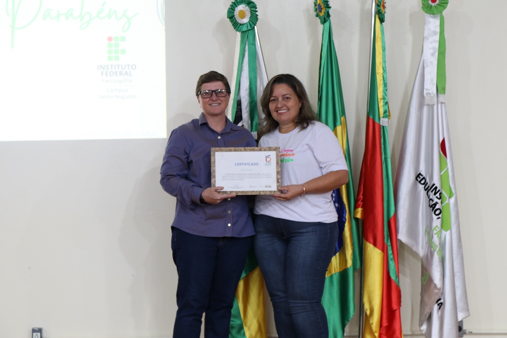 Na ocasião, a Diretora Márcia Fink, entregou para os servidores homenageados um quadro com um certificado, reconhecendo os 15 anos de trajetória profissional, a dedicação e o empenho na construção de uma sociedade mais justa através da educação pública, inclusiva, gratuita e de qualidade.