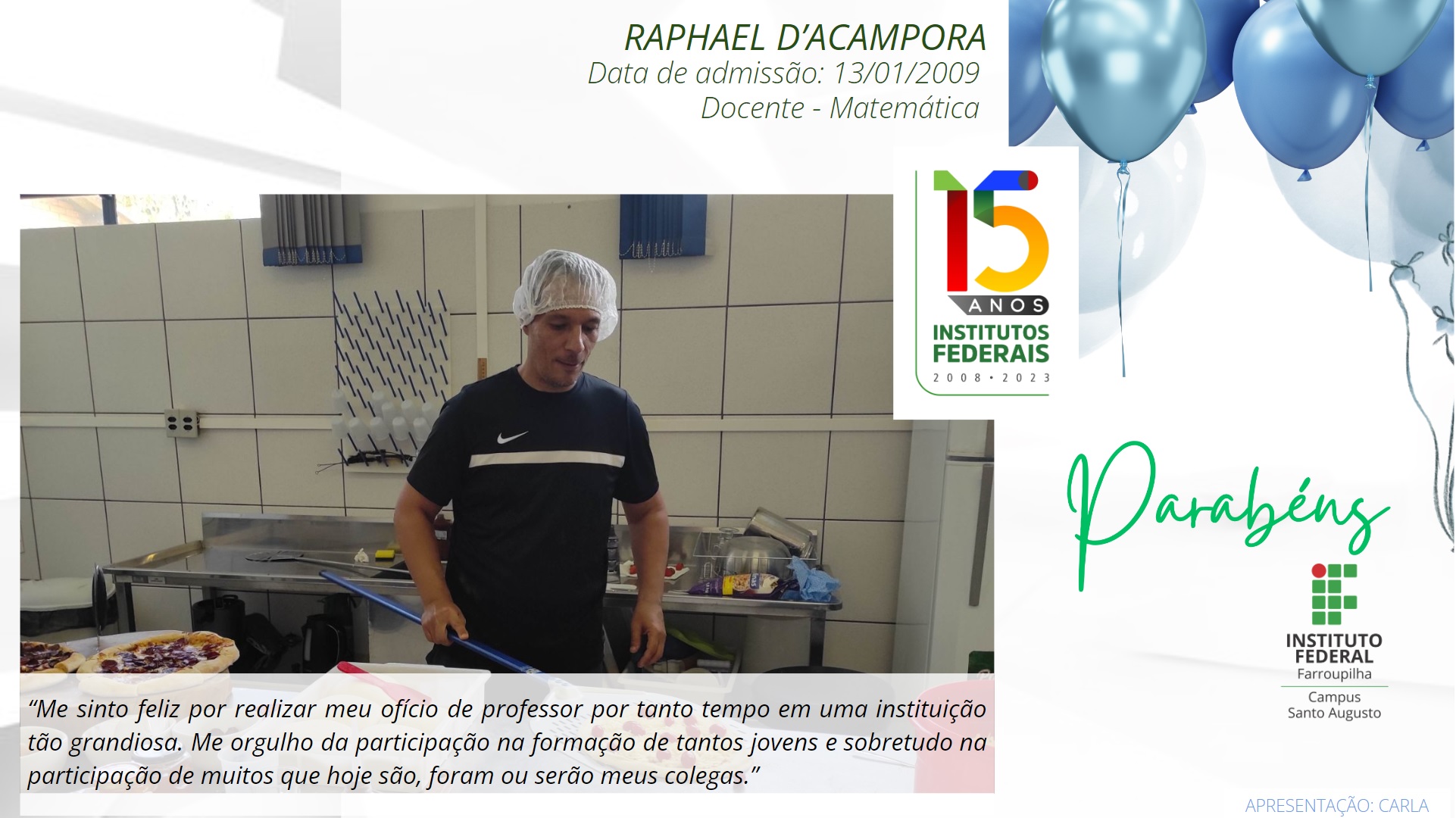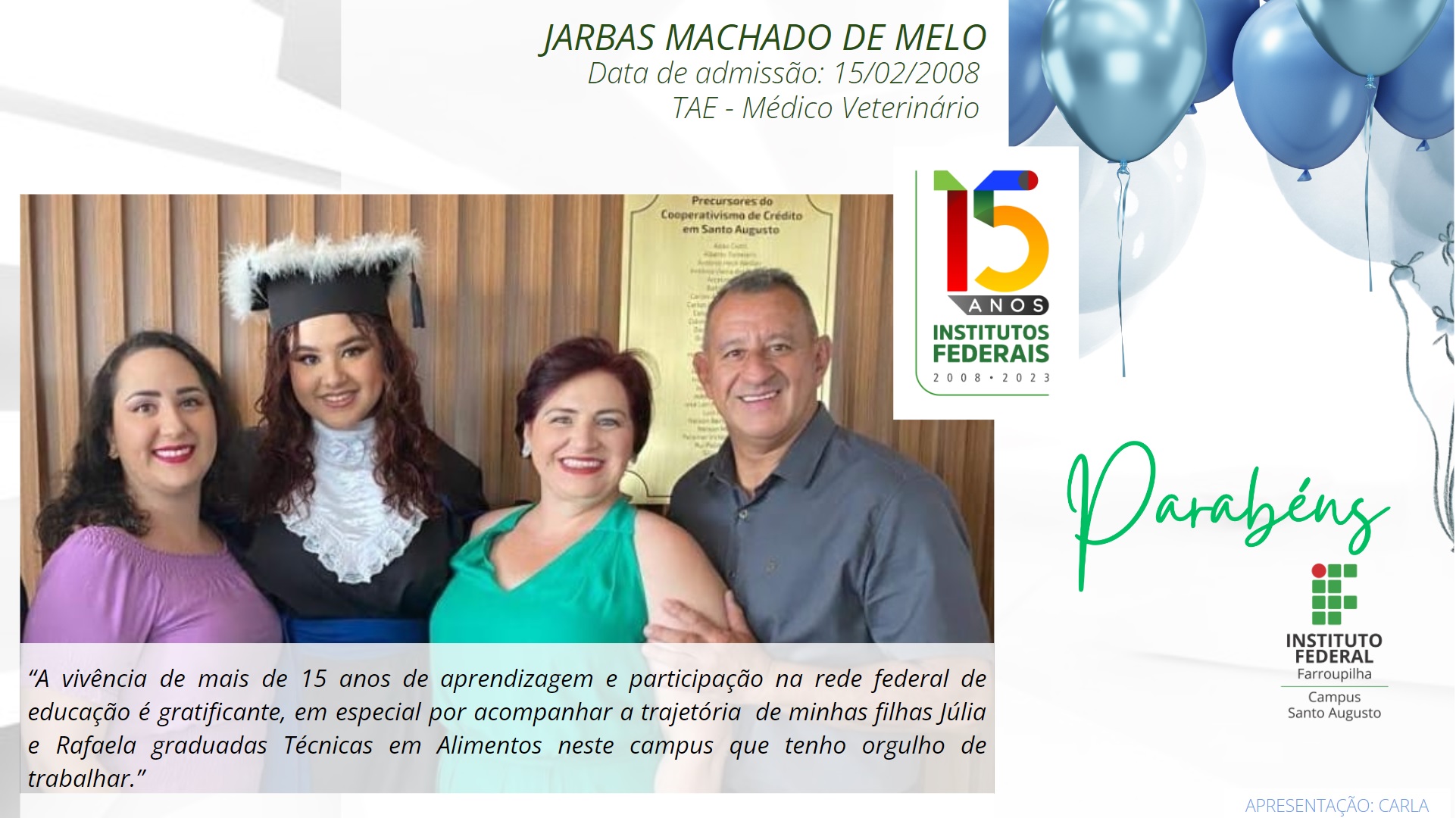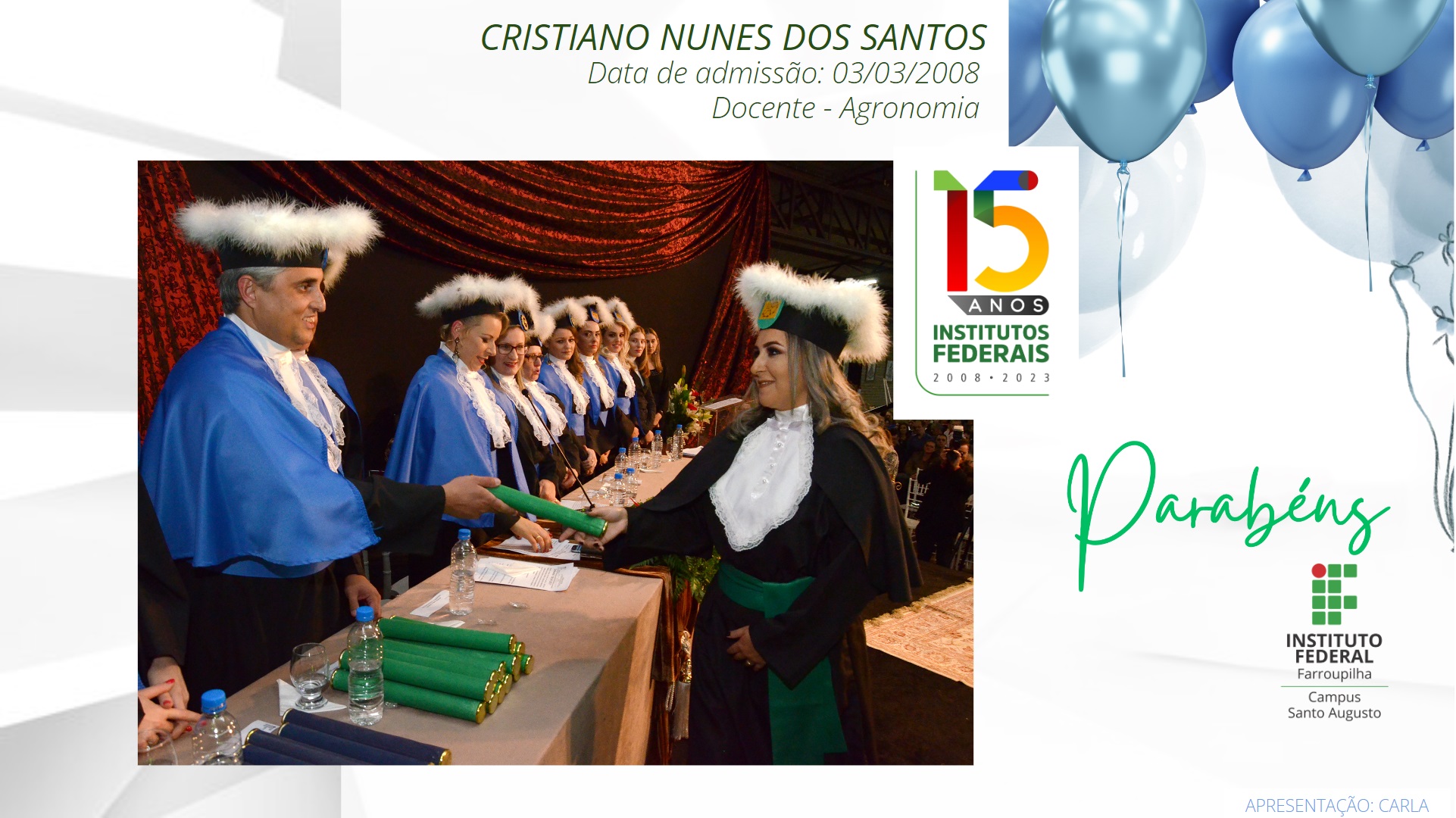 O Instituto Federal Farroupilha, junto com a Rede Federal de Educação Profissional, Científica e Tecnológica, completou 15 anos no dia 29 de dezembro de 2023. Desde o final do ano passado, atividades comemorativas celebram o marco e relembram as trajetórias das instituições e das pessoas que fazem e fizeram parte dessa história. A valorização das trajetórias das pessoas que fazem parte dos Institutos Federais é a tônica das comemorações.