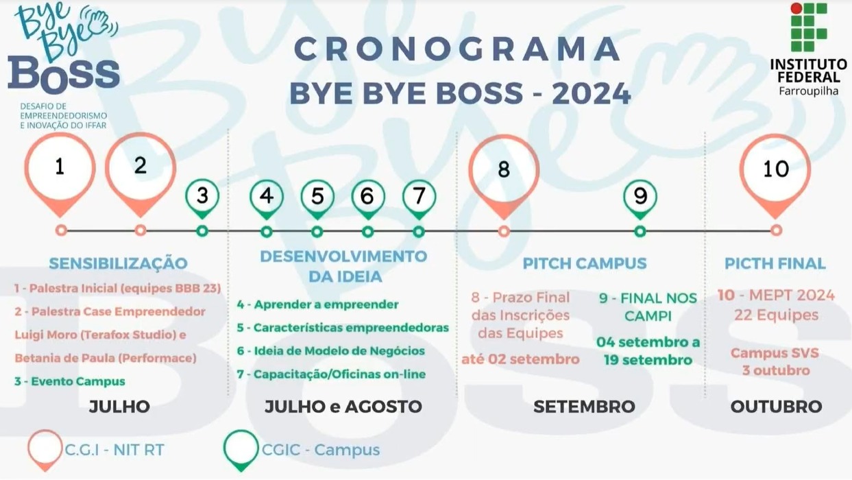 Mais informações podem ser obtidas no regulamento do Desafio, disponível no site https://mept.iffarroupilha.edu.br/byebyeboss/