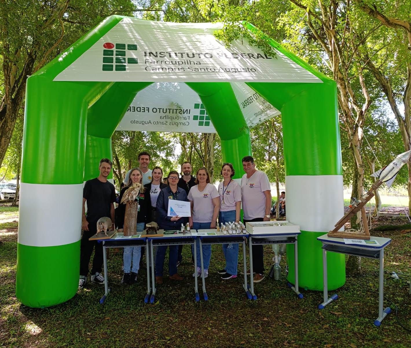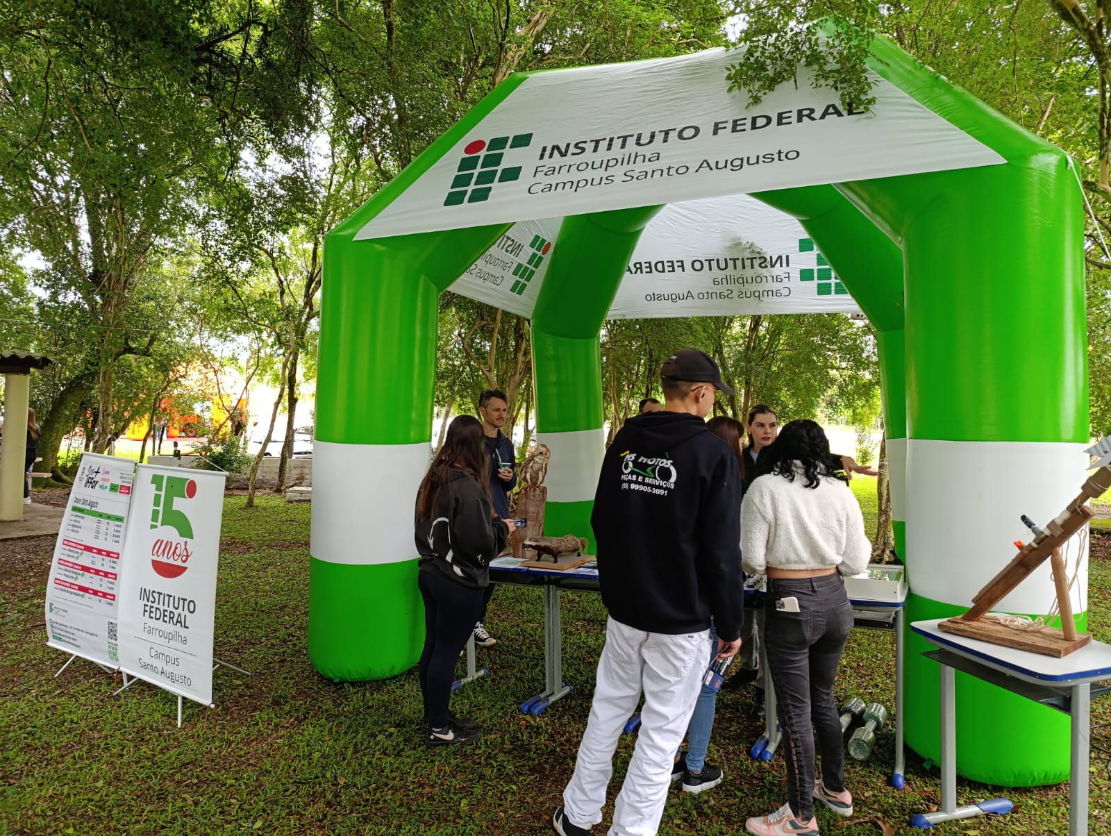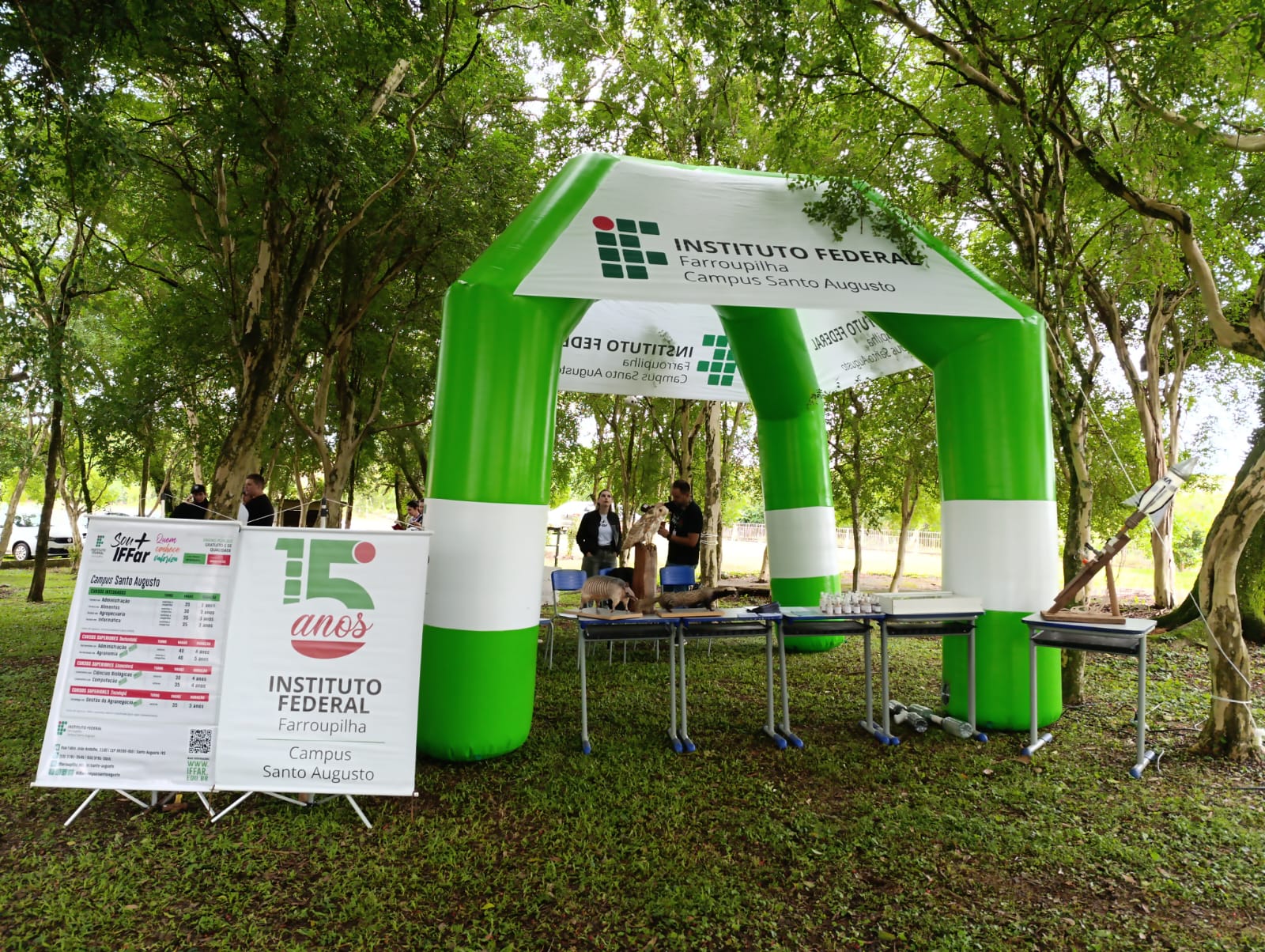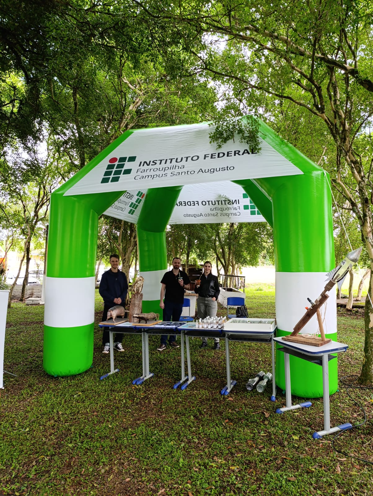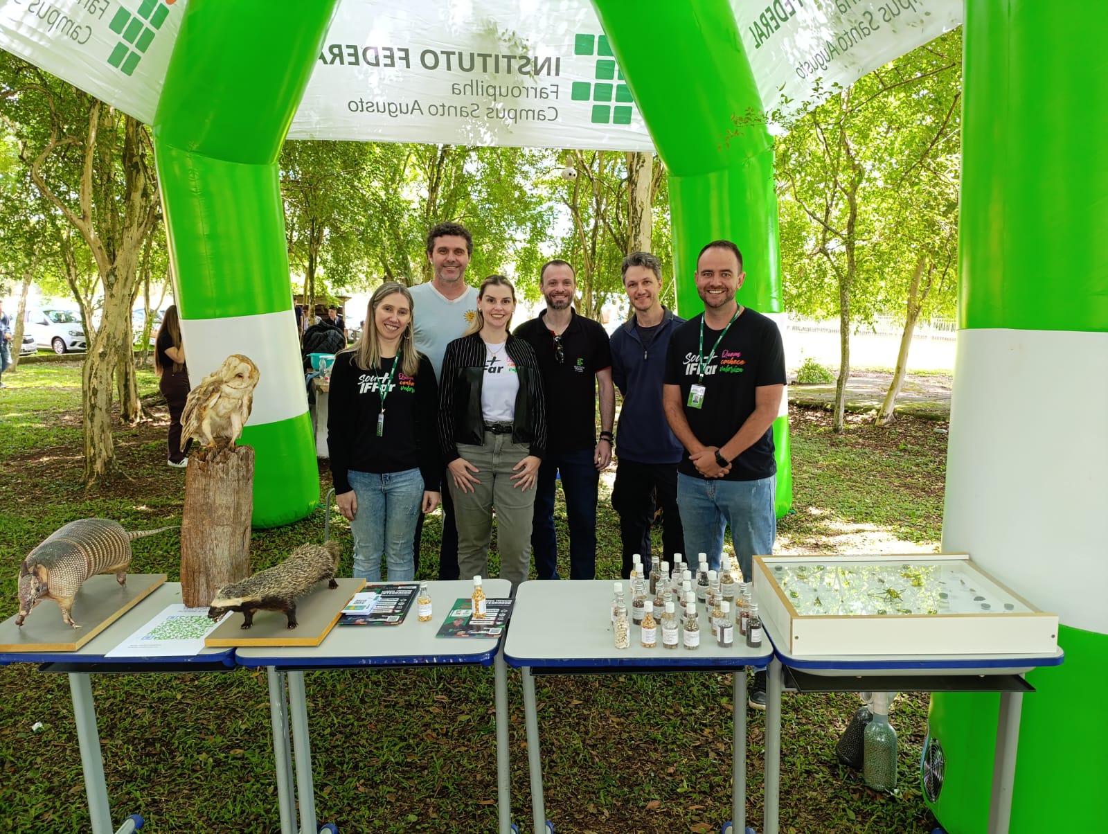 O estande do IFFar – Campus Santo Augusto contou com a participação da Diretora Geral, Márcia Fink; da Diretora de Planejamento e Desenvolvimento Institucional, Lizandra Forgiarini Lucca; do Diretor de Pesquisa Extensão e Produção, Ricardo Paraginski; do Coordenador de Extensão, Osmar Bencke; dos professores, Dante Meller e Fabrício Doring Martins e da Jornalista Carla Maron. Além da entrega de material de divulgação institucional, os visitantes puderam conhecer alguns animais taxidermizados, feitos pelos acadêmicos de Licenciatura em Ciências Biológicas e o foguete vencedor da Mostra de Foguetes do IFFar, e brincar no slackline, sob orientação do professor Fabrício.