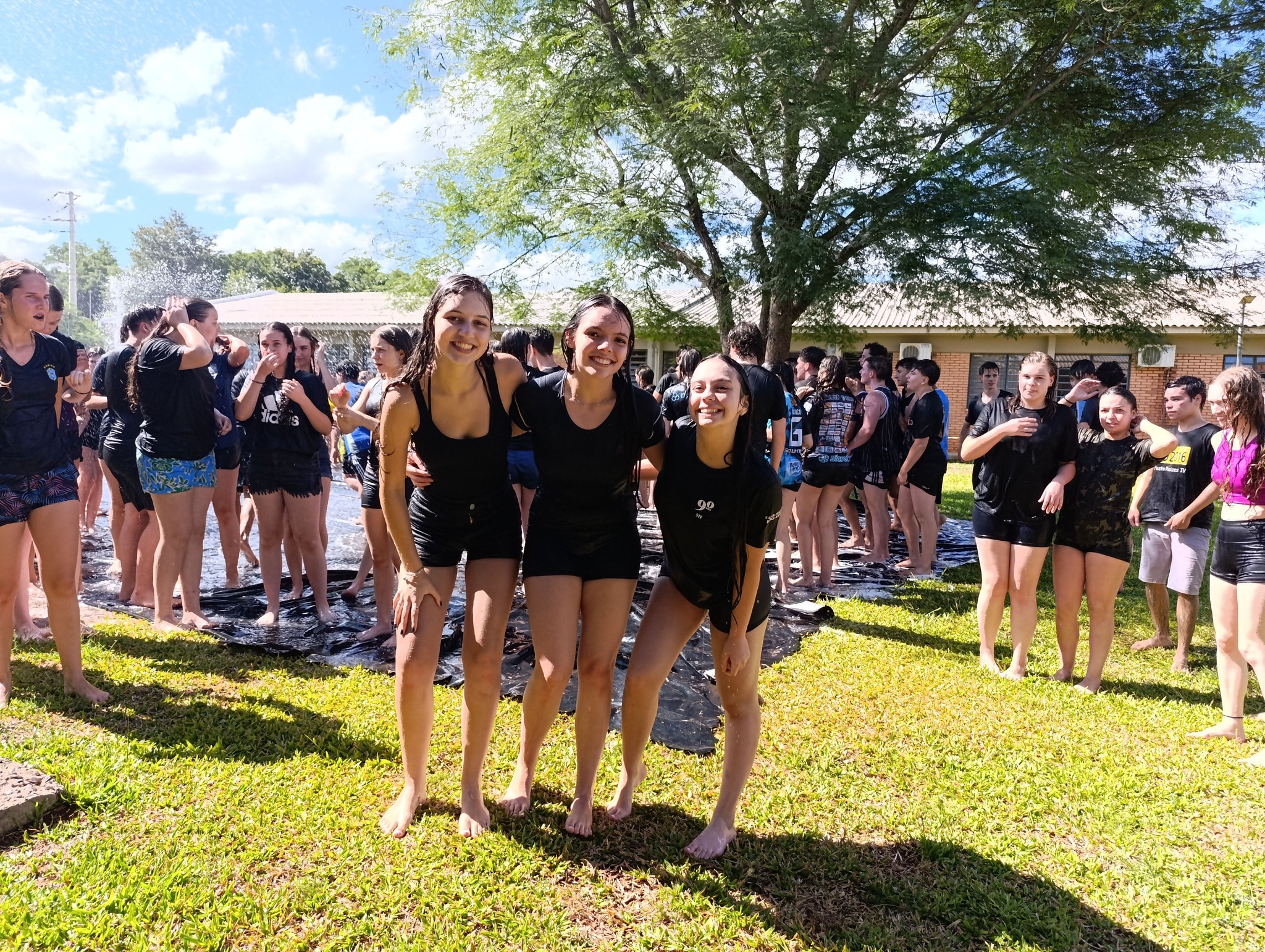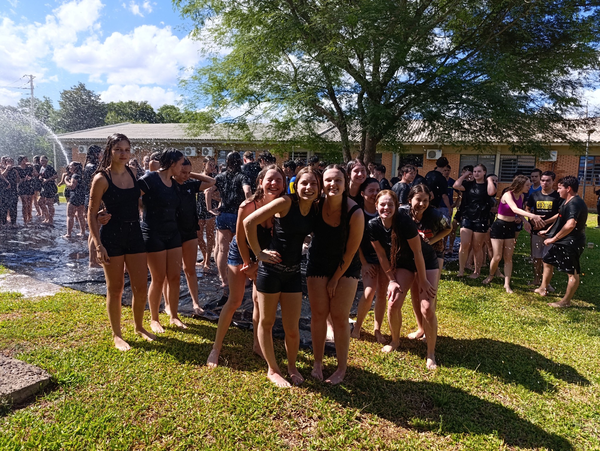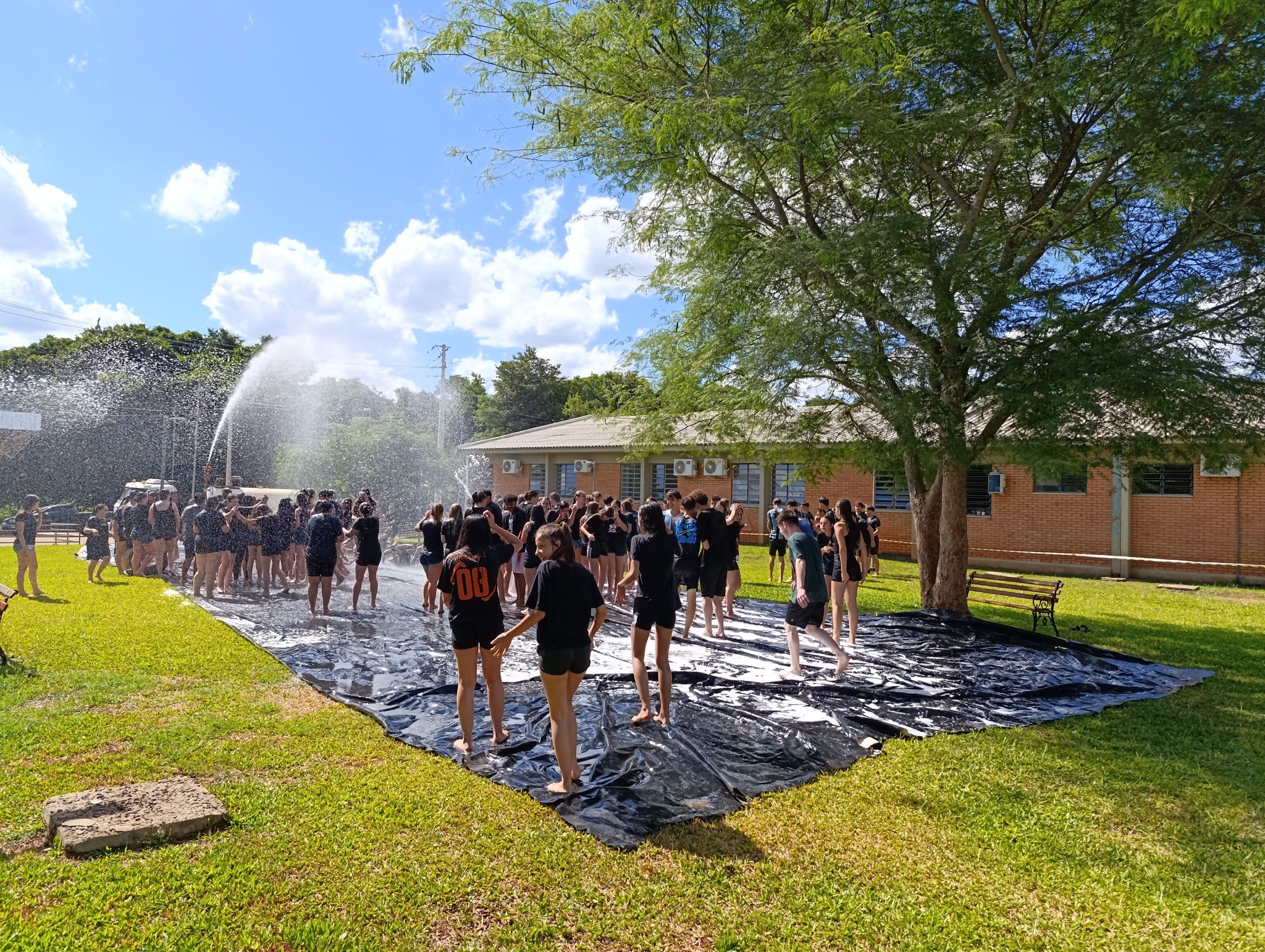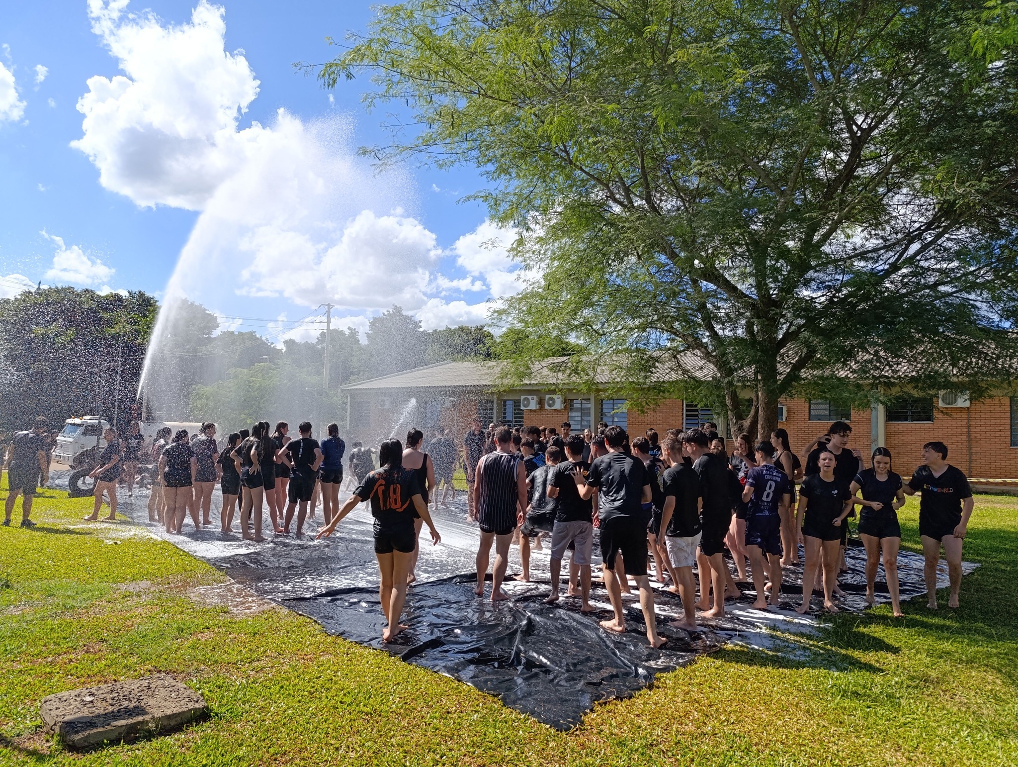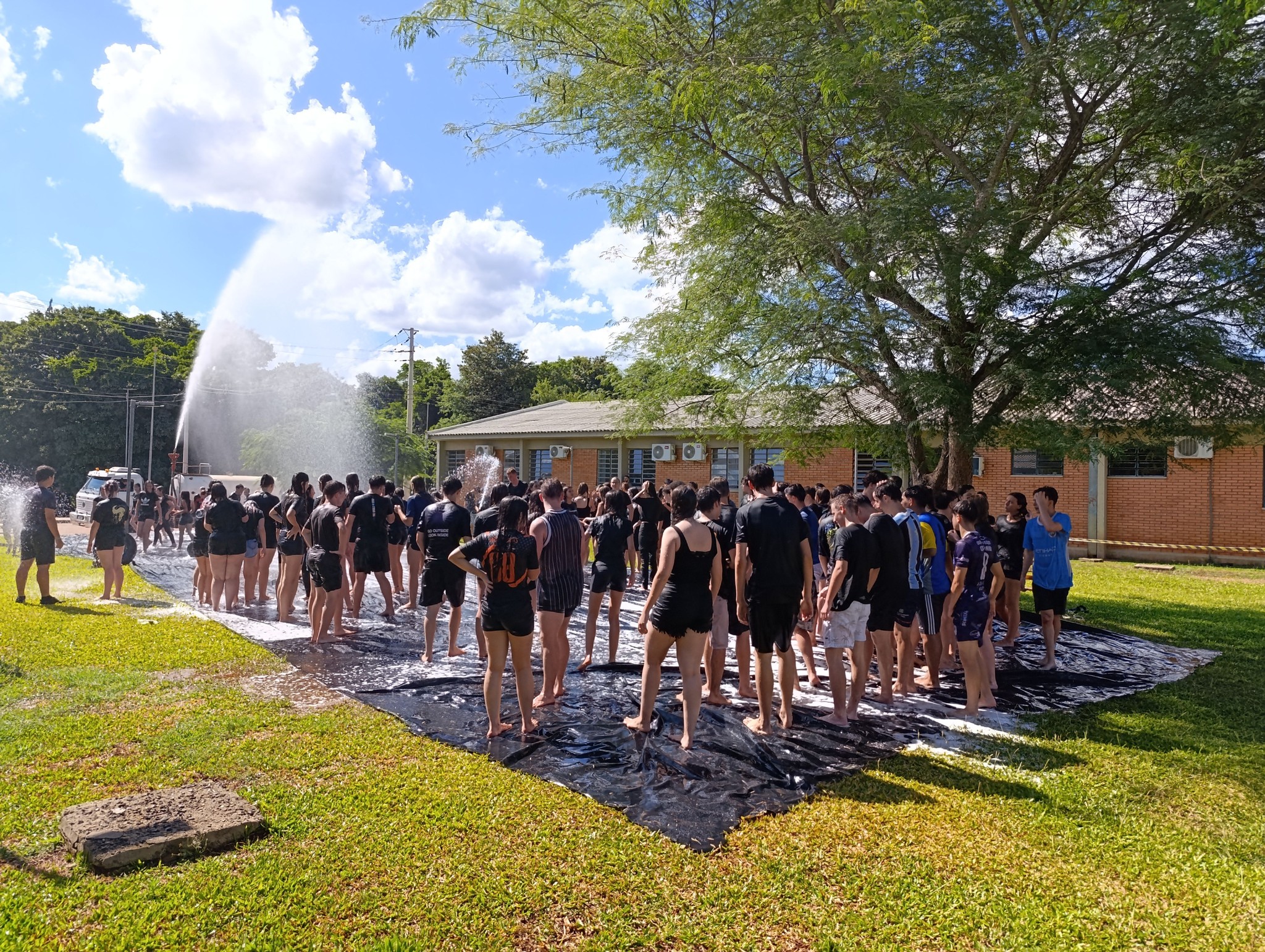 A brincadeira teve como espaço delimitado o gramado central do campus, onde foram utilizadas mangueiras para molhar aqueles que desejavam participar da festa, mas a atração principal foi o jato de água do caminhão pipa da prefeitura e a lona estendida na grama, onde era possível deslizar na água.