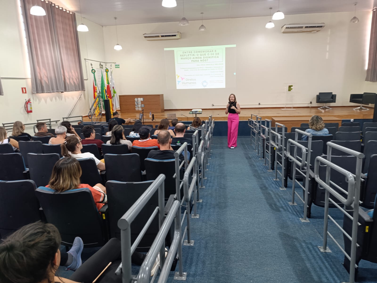 Na ocasião, a professora Joice falou sobre o tema “Entre comemorar e refletir: o que o dia 08 de março ainda significa para nós?”, destacando que as desigualdades entre homens e mulheres são construções sociais, reproduzidas ao longo de muitos anos através da cultura, da religião, das instituições, e que dizem como as pessoas devem se comportar, ou seja, quais são os comportamentos adequados ou naturais para cada um dos sexos, e com isso acabam destinando papéis sociais diferenciados para homens e mulheres. Também apresentou propagandas antigas e algumas mais recentes, onde a mulher é retratada de forma pejorativa ou como um objeto do homem, e por fim as principais conquistas obtidas pelas mulheres ao longo dos anos, como o Direito ao Voto, o Direito ao Divórcio, Lei Maria da Penha, entre outras.