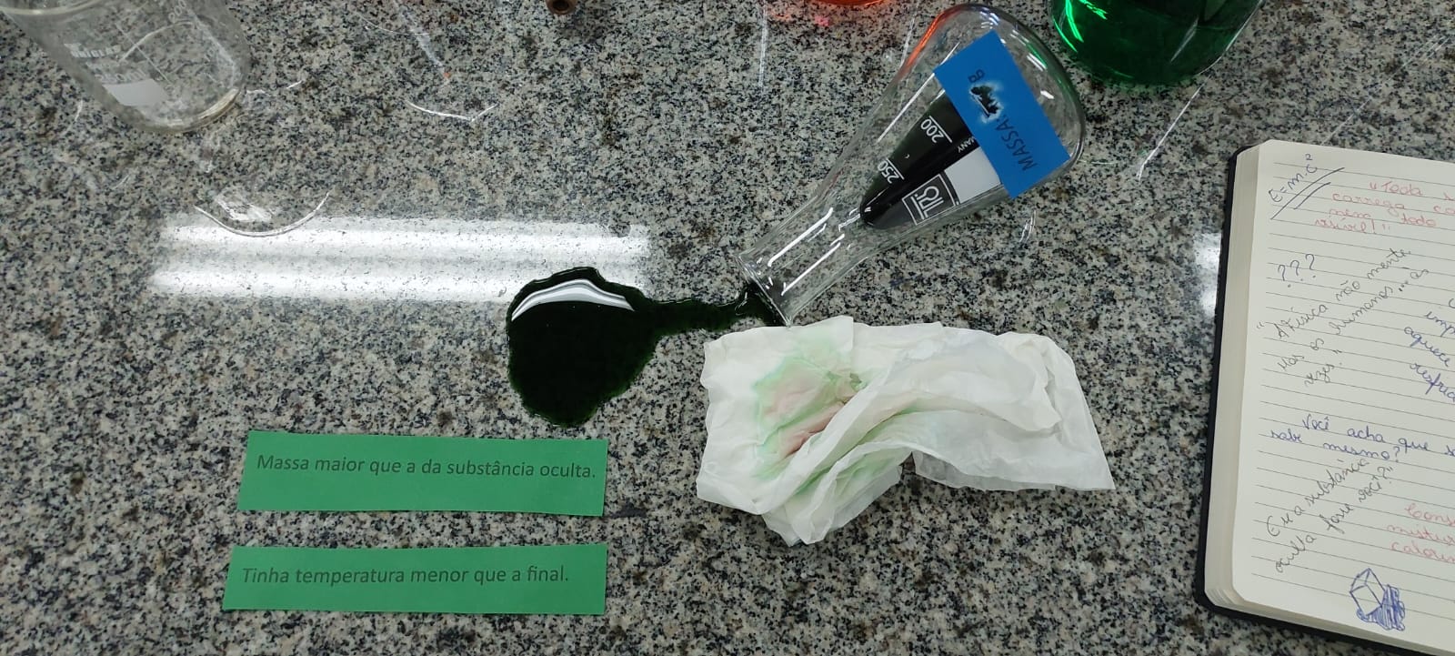 A investigação teve o seguinte enredo: Um béquer foi encontrado tombado no laboratório com uma mistura ainda morna, os estudantes precisaram descobrir qual substância participou da mistura com o composto desconhecido "X". As pistas disponíveis estão na tabela, quadro e na cena do laboratório.