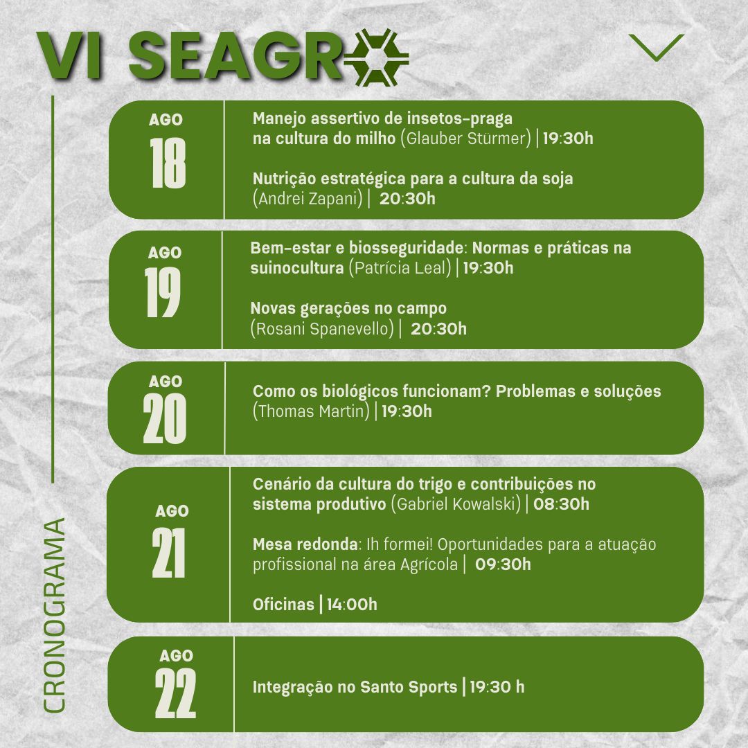 De 18 a 21 de agosto, os acadêmicos do curso superior de Bacharelado em Agronomia do IFFar – Campus Santo Augusto promoveram a VI SEAGRO - Semana Acadêmica da Agronomia, com o objetivo de promover a troca de conhecimentos e experiências entre estudantes, professores, profissionais e a comunidade em geral, trazendo reflexões sobre os rumos da agricultura e os desafios para construir um campo mais sustentável e inovador.