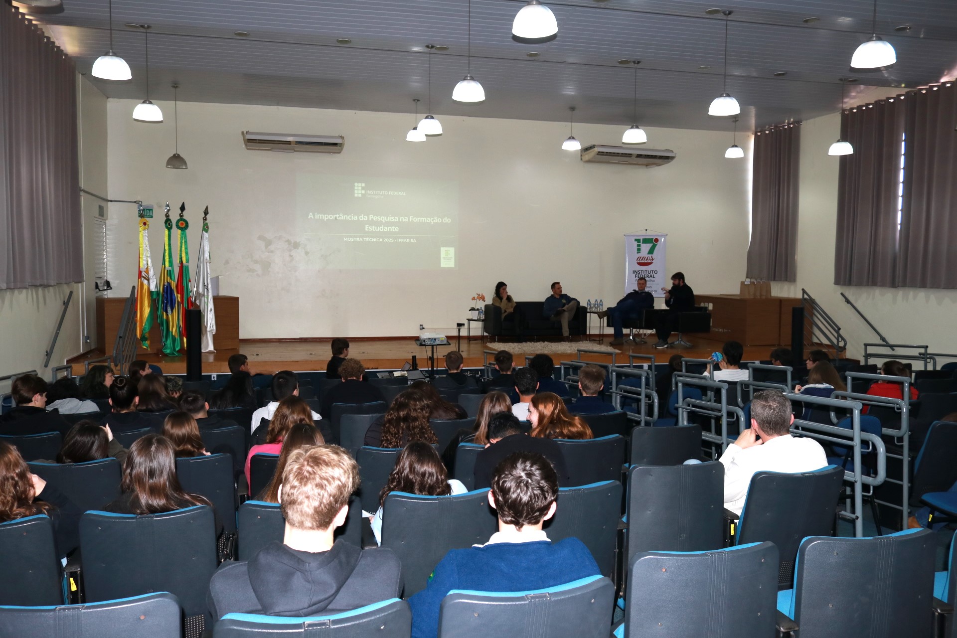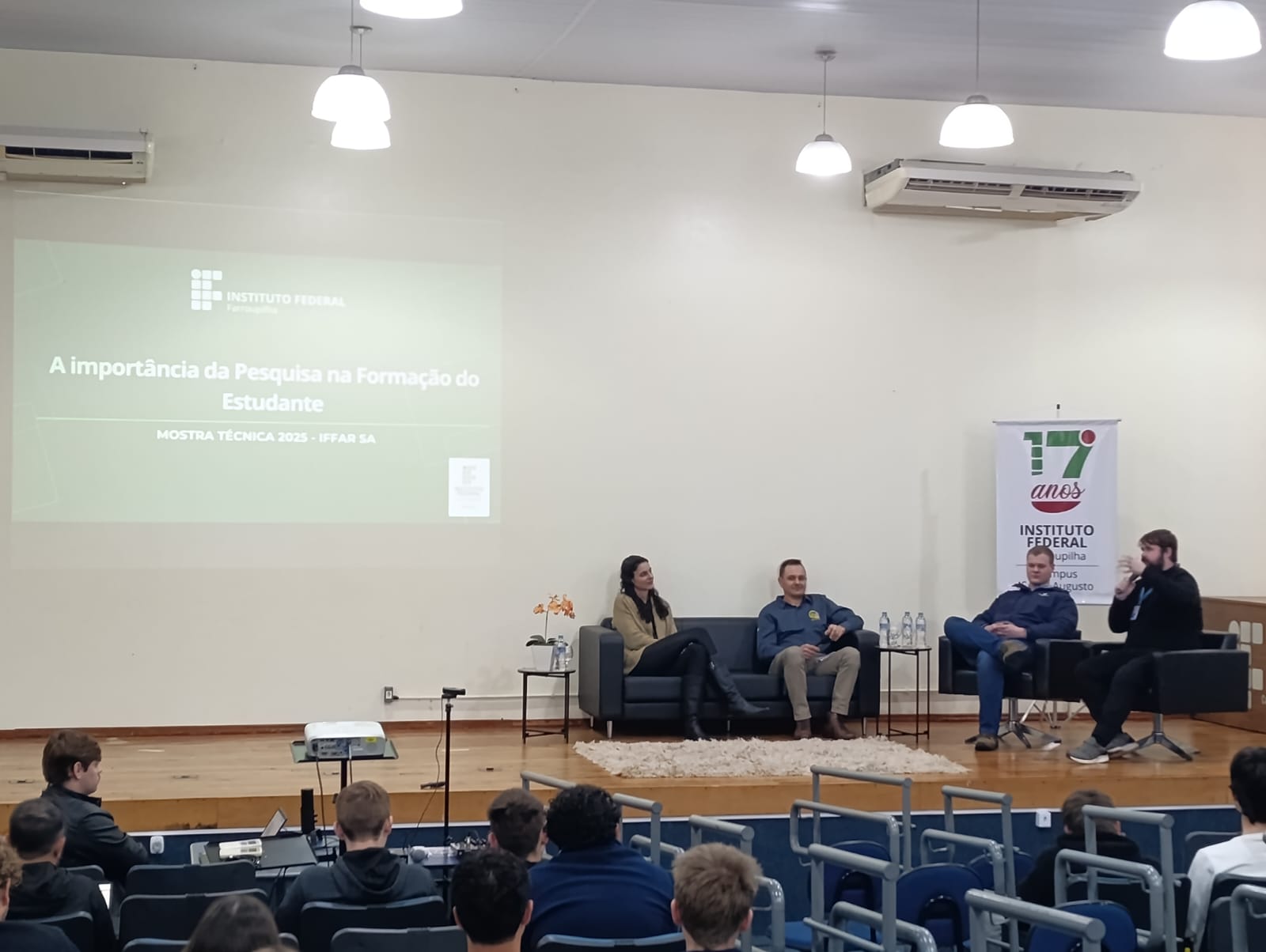 O evento teve início às 9h50, no auditório da instituição, com o painel “A importância da Pesquisa na Formação do Estudante”, às 9h50, com a Pró-Reitora de Pesquisa, Pós-graduação e Inovação do IFFar, professora Dra. Thirssa Helena Grando, e como convidados, Uianes Biondo (assessor pedagógico da Secretaria Municipal de Educação de Santo Augusto e egresso dde Licenciatura em Computação), Augusto Wyrepkowski (acadêmico do 8° semestre de Medicina Veterinária da UNIPAMPA e egresso do Curso Técnico em Agropecuária) e como mediador o professor Dr. Lessandro De Conti (Docente do Eixo de Recursos Naturais do IFFar – Campus Santo Augusto). O painel foi transmitido ao vivo pelo canal no Youtube do Campus (https://www.youtube.com/watch?v=OpI8-03cygA).