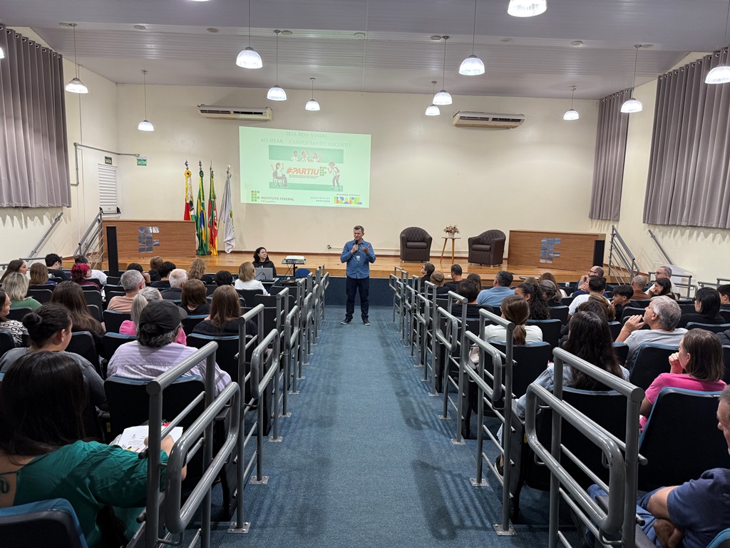 O IFFar – Campus Santo Augusto deu início, na noite do dia 13 de abril, às 19h, no auditório da instituição, às atividades do Programa Partiu IF 2026. O evento contou com a participação da Diretora Geral, Márcia Fink; da Secretária Municipal de Educação de Santo Augusto, Eliane Paier; do coordenador local do programa, professor Carlos César Wyrepkowski; do coordenador da Assistência Estudantil, Marcos Wolmann Santos; além dos integrantes da equipe do programa, estudantes selecionados e seus pais ou responsáveis.