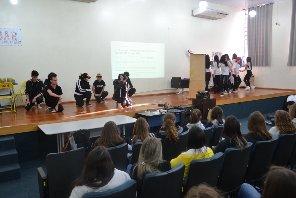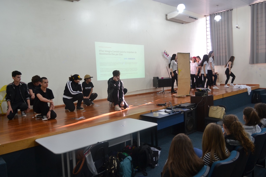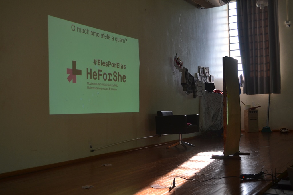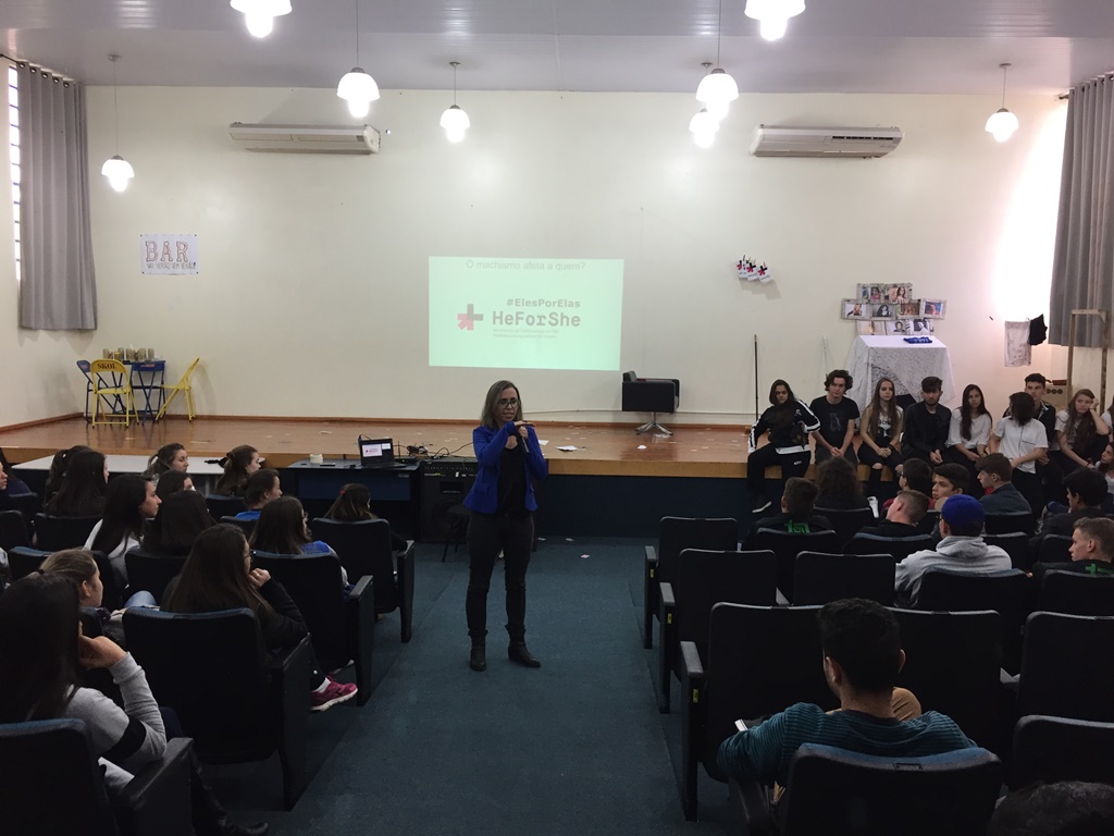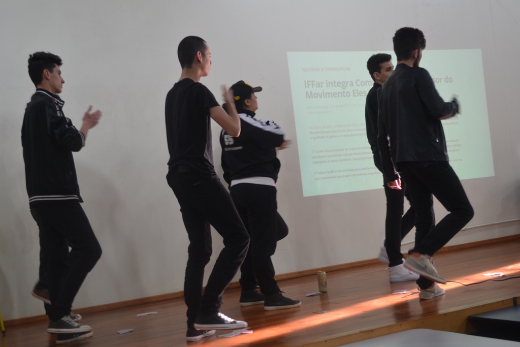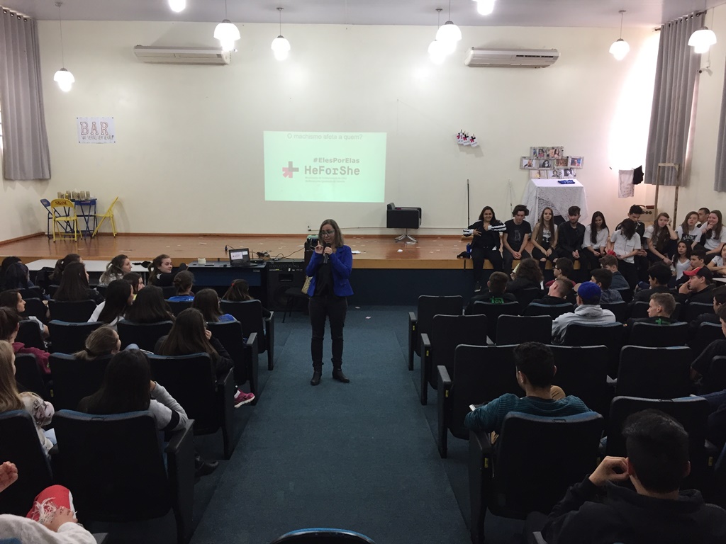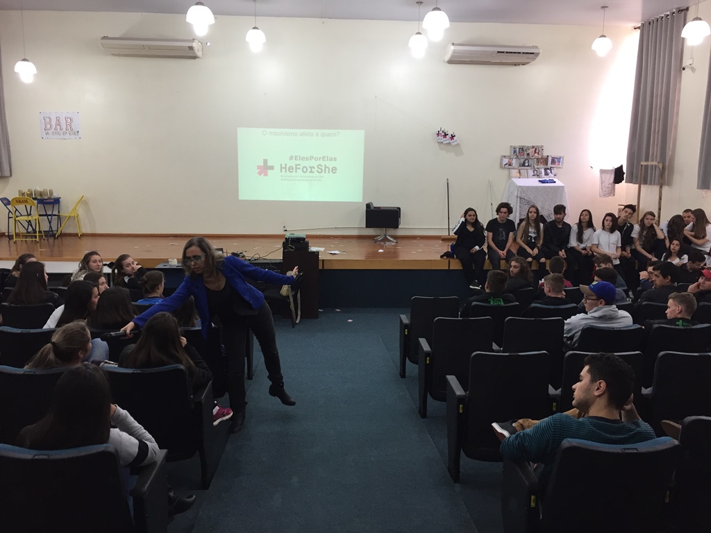 Na quarta-feira, dia 04, os alunos dos cursos técnicos foram reunidos pela manhã no auditório para participar das ações organizadas pela professora Claudia Alves dos Santos alusivas ao movimento ElesporElas (HeforShe). O evento iniciou com a apresentação dos alunos integrantes do Projeto de Ensino “A Situação das Mulheres na Contemporaneidade”, que representaram a música “Do lado de Dentro” da banda Los Hermanos. Na sequência, a professora Claudia explicou o que é o movimento ElesporElas (HeforShe) e trouxe dados sobre as diferenças entre homens e mulheres no Brasil, estimulando o debate sobre o tema entre os estudantes, os quais foram muito participativos.