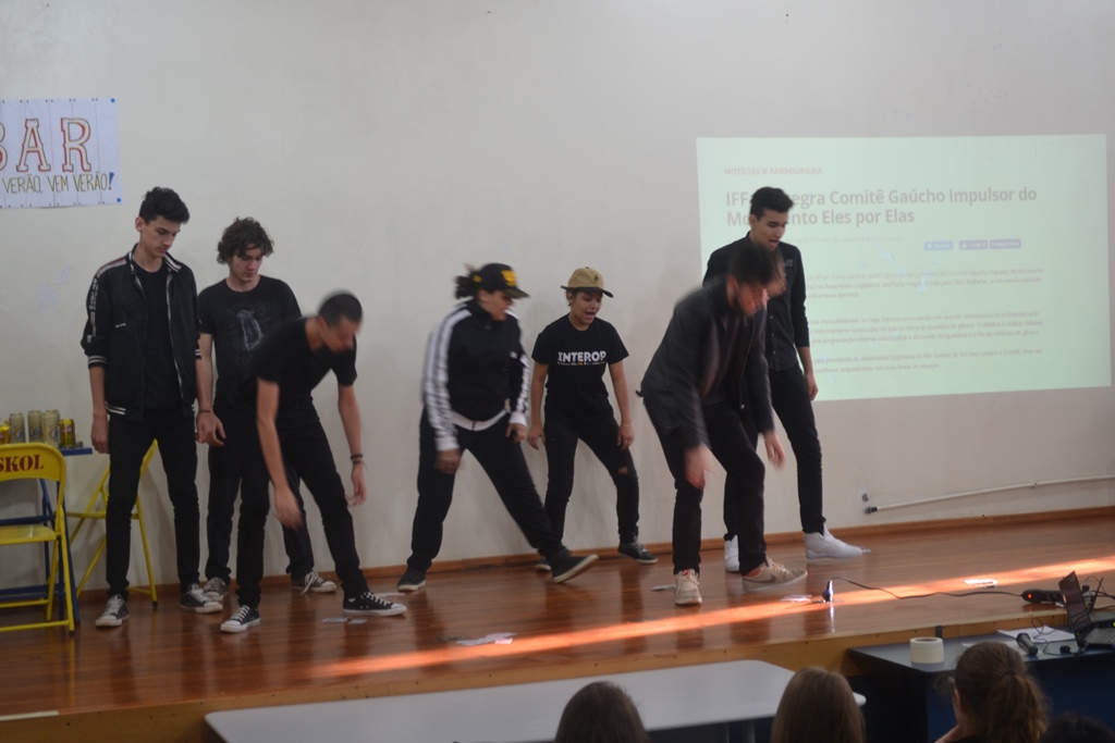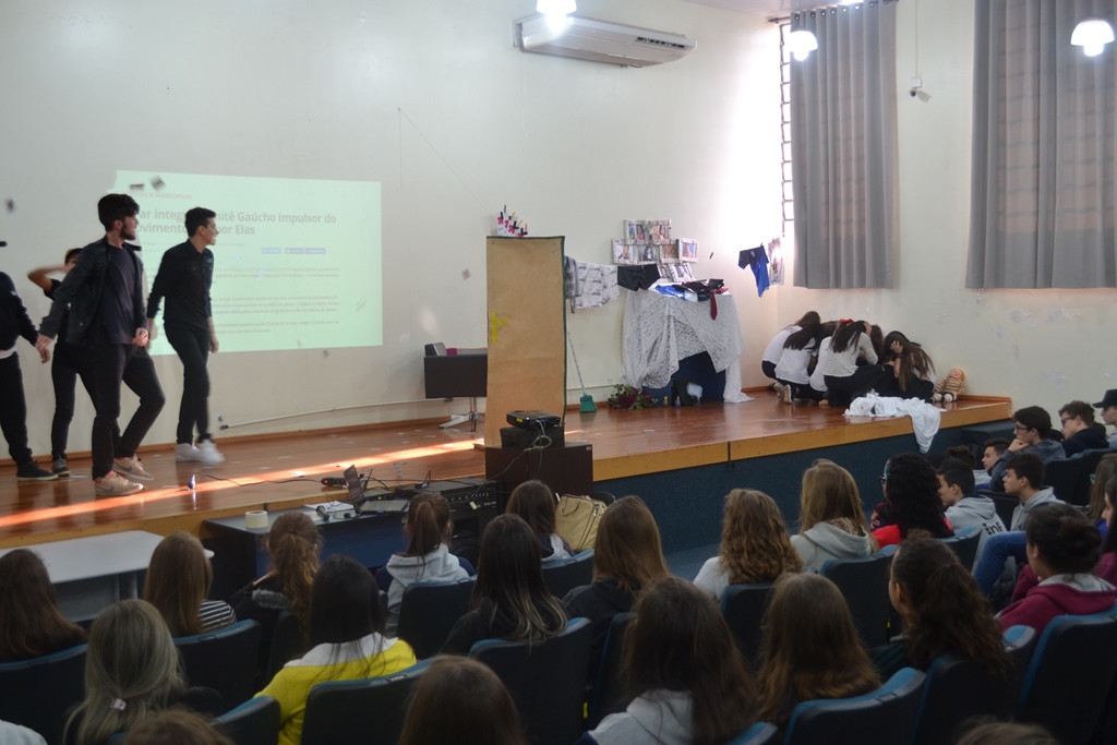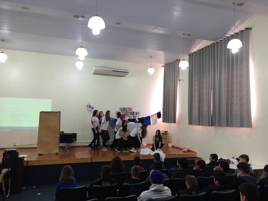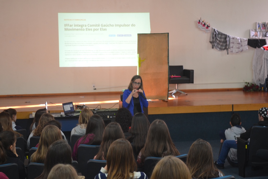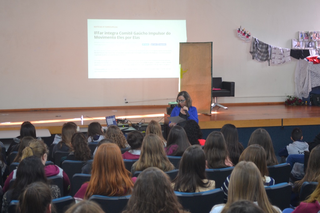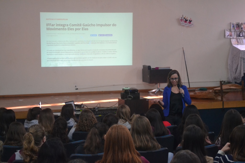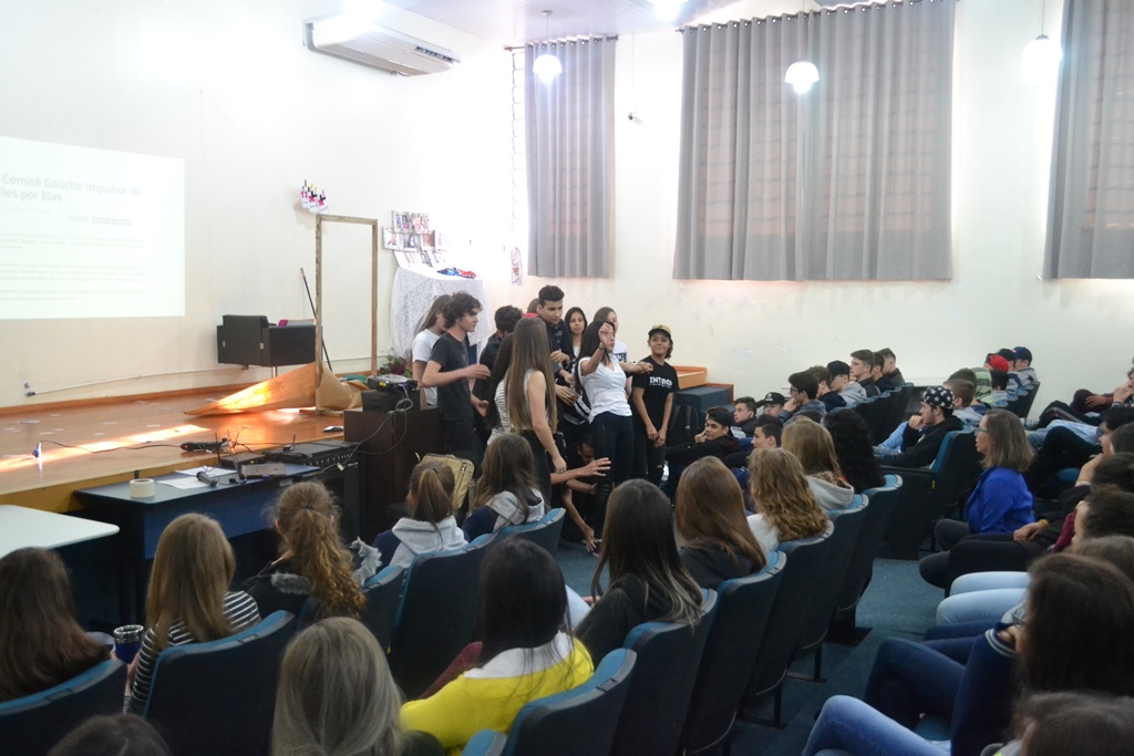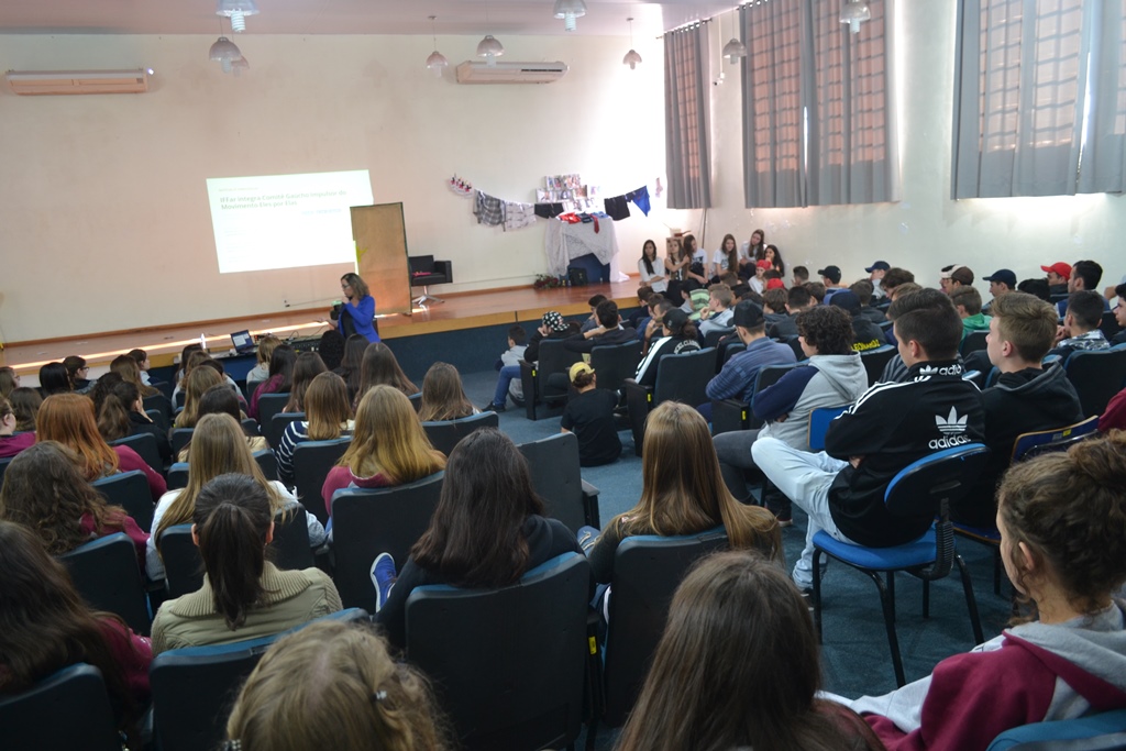 Na quarta-feira, dia 04, os alunos dos cursos técnicos foram reunidos pela manhã no auditório para participar das ações organizadas pela professora Claudia Alves dos Santos alusivas ao movimento ElesporElas (HeforShe). O evento iniciou com a apresentação dos alunos integrantes do Projeto de Ensino “A Situação das Mulheres na Contemporaneidade”, que representaram a música “Do lado de Dentro” da banda Los Hermanos. Na sequência, a professora Claudia explicou o que é o movimento ElesporElas (HeforShe) e trouxe dados sobre as diferenças entre homens e mulheres no Brasil, estimulando o debate sobre o tema entre os estudantes, os quais foram muito participativos.