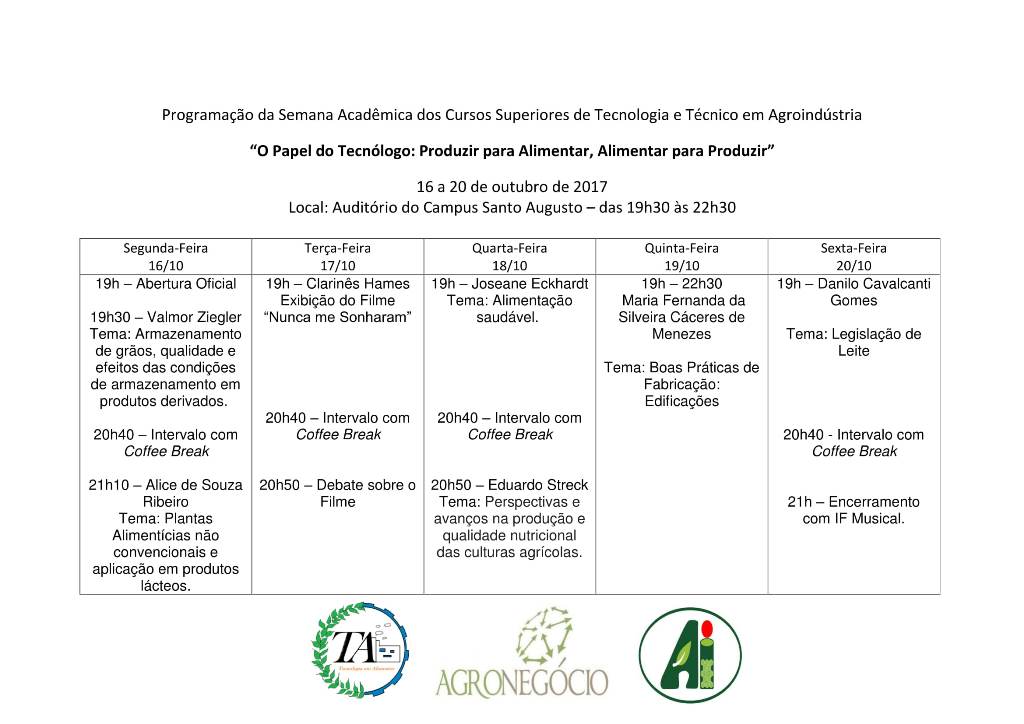 O Instituto Federal Farroupilha-Campus Santo Augusto realizou de 16 a 20 de outubro a Semana Acadêmica dos cursos superiores de Tecnologia em Agronegócio e Alimentos e do curso técnico em Agroindústria na modalidade Proeja, com o tema: “O Papel do Tecnólogo: Produzir para Alimentar, Alimentar para Produzir”.
