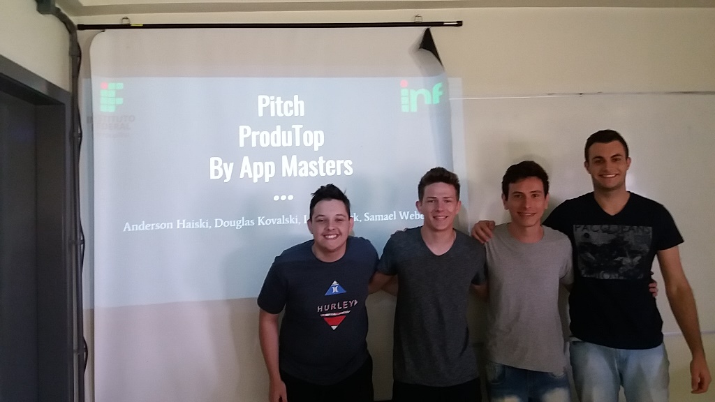 Pointeen (proposta de uma livraria-café como espaço cultural e de serviços): Martieli, Maria, Rafael Briato e William;ProduTop (aplicativo de comparação de preços voltada para mercados locais e regionais): Douglas, Lucas, Samael e Anderson Barasuol;