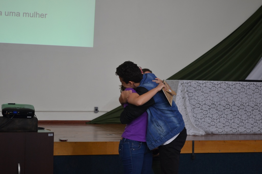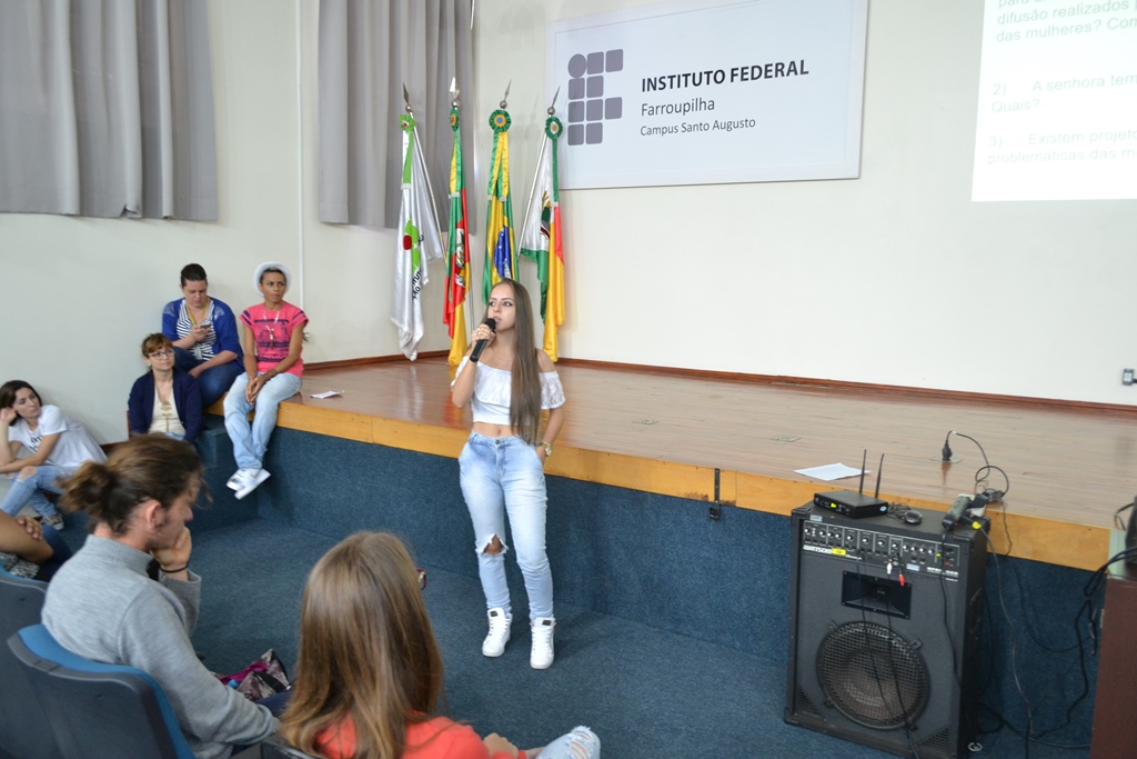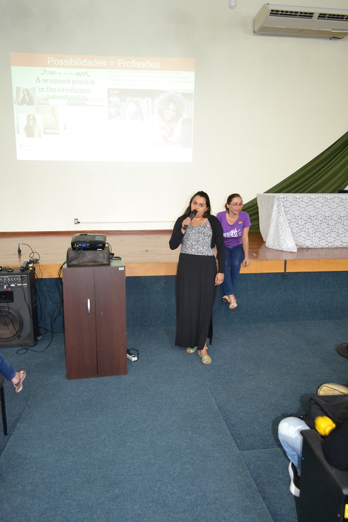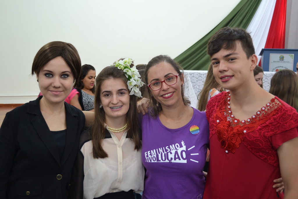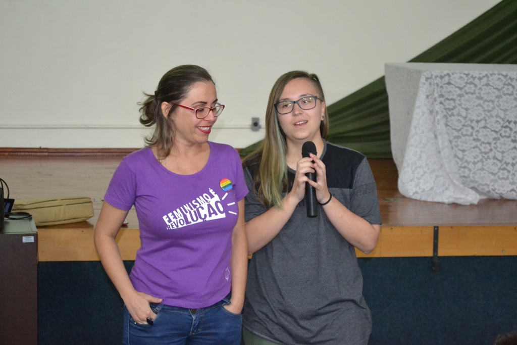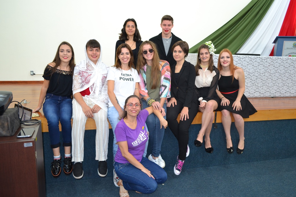 A programação iniciou com a apresentação da música “O bêbado e o equilibrista” pela aluna Vitória Ribeiro, que emocionou a todos cantando à capela. Na sequência, a professora Claudia, juntamente com os alunos participantes do projeto, Letícia Strossi, Allana Trevisan, Luan Mota, Victória Munhlen e Vitor Schmidt, apresentaram dados sobre a presença da mulher na política.