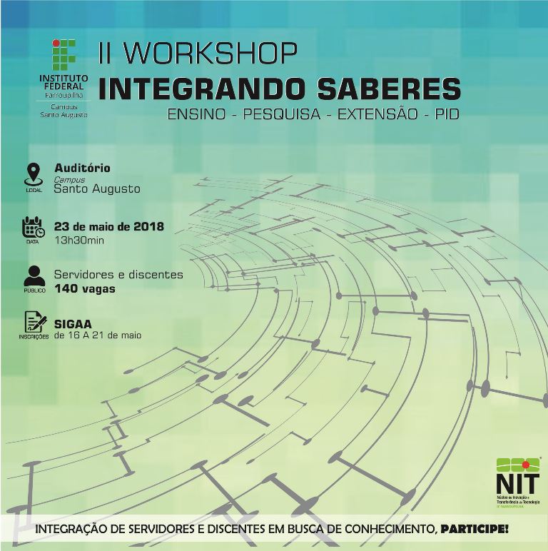 O Núcleo de Inovação Tecnológica (NIT) do IFFar - Campus Santo Augusto em conjunto com o Departamento de Pesquisa, Extensão e Produção, realizou na tarde desta quarta-feira, dia 23 de maio o "II Workshop Integrando Saberes”.