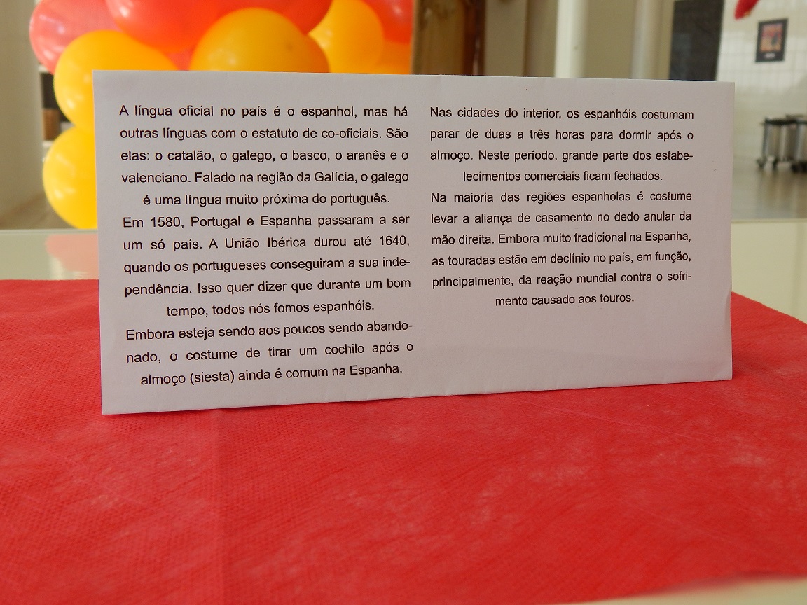 Nas mesas, prismas com aspectos culturais da cultura espanhola levaram aos alunos conhecimentos sobre um povo tão influente na formação histórica e sociopolítica do município. Um costume comum deixado pelos colonizadores espanhóis e que ainda hoje é vivenciado no cotidiano da população da cidade é a “siesta”. O costume de tirar um cochilo após o almoço ainda é comum no país europeu. Nas cidades do interior, os espanhóis costumam parar de duas a três horas para dormir após o almoço. Neste período, grande parte dos estabelecimentos comerciais ficam fechados, comprovando assim, que nós são-borjenses temos muito em comum com os espanhóis e nem percebemos. Além disso, nossa vizinha cidade de Santo Tomé, na Argentina, fortemente influenciada pela cultura espanhola, ainda conserva bem este costume herdado dos espanhóis, pois em Santo Tomé, o comércio só abre suas portas depois da "siesta", em torno das 15h30, 16 horas.