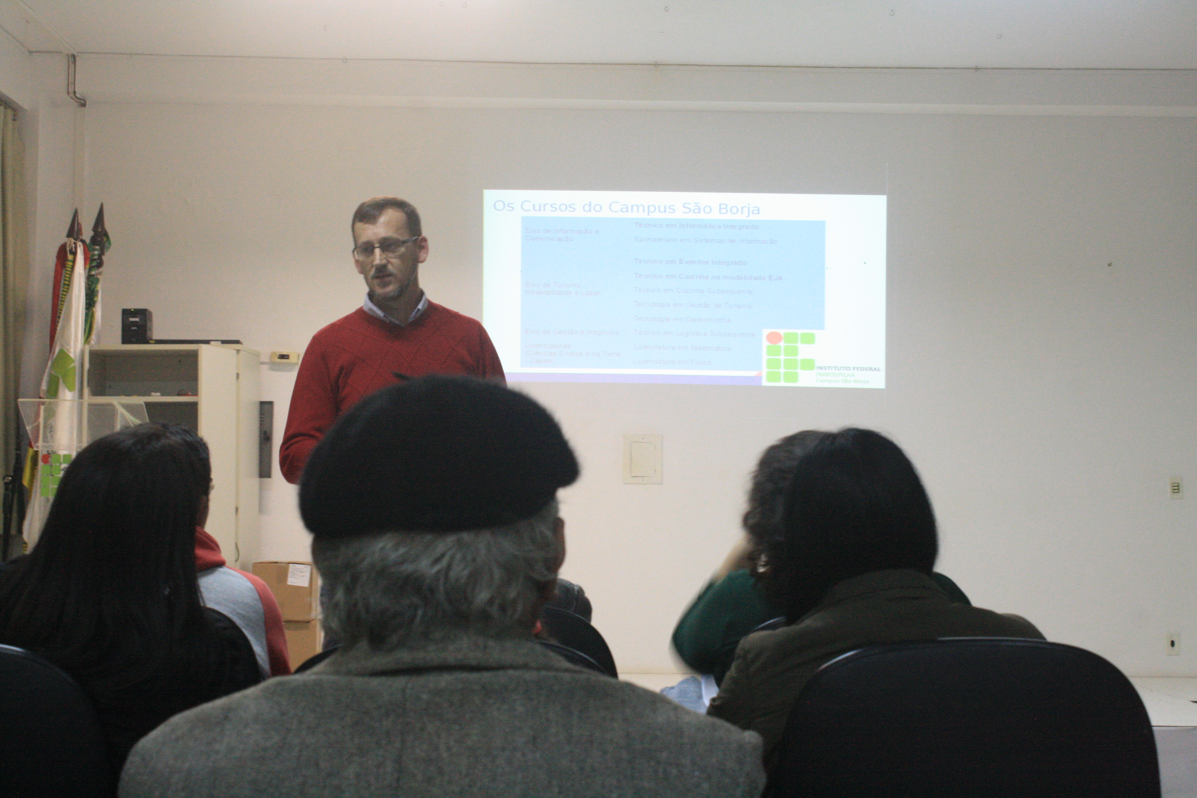 Por sua vez, o professor Artênio Rabuske realizou uma apresentação sobre alguns aspectos do IFFar como quantidade de alunos, duração dos cursos, avaliação pelo MEC e as ações e eventos que acontecem na instituição. O professor Artênio destacou que para fortalecer a participação dos estudantes visando alcançar a missão, a visão e os valores da instituição, o IFFar também conta com núcleos como o Núcleo de Apoio as Pessoas com Necessidades Educacionais Especiais (NAPNE), Núcleo de Estudos Afro-Brasileiros e Indígenas (NEABI) e Núcleo de Gênero e Diversidade Sexual (NUGEDIS). Esclareceu também as formas de ingresso como ensino médio integrado, Enem, educação de jovens e adultos – PROEJA e o curso Técnico de Logística, com 30 vagas ofertadas. O professor destacou que o IFFar também oferece assistência estudantil aos alunos, como assistência social, nutricionista, médico, dentista, enfermagem e psicóloga, moradia estudantil, auxílio financeiro, auxílio-transporte e auxílio permanência.