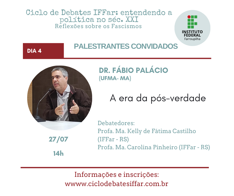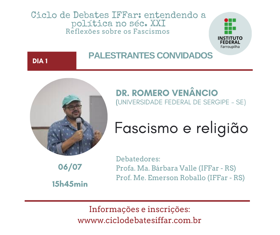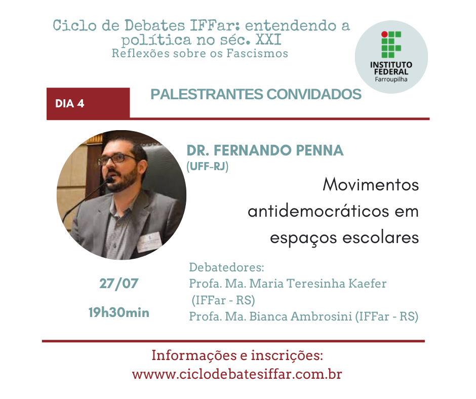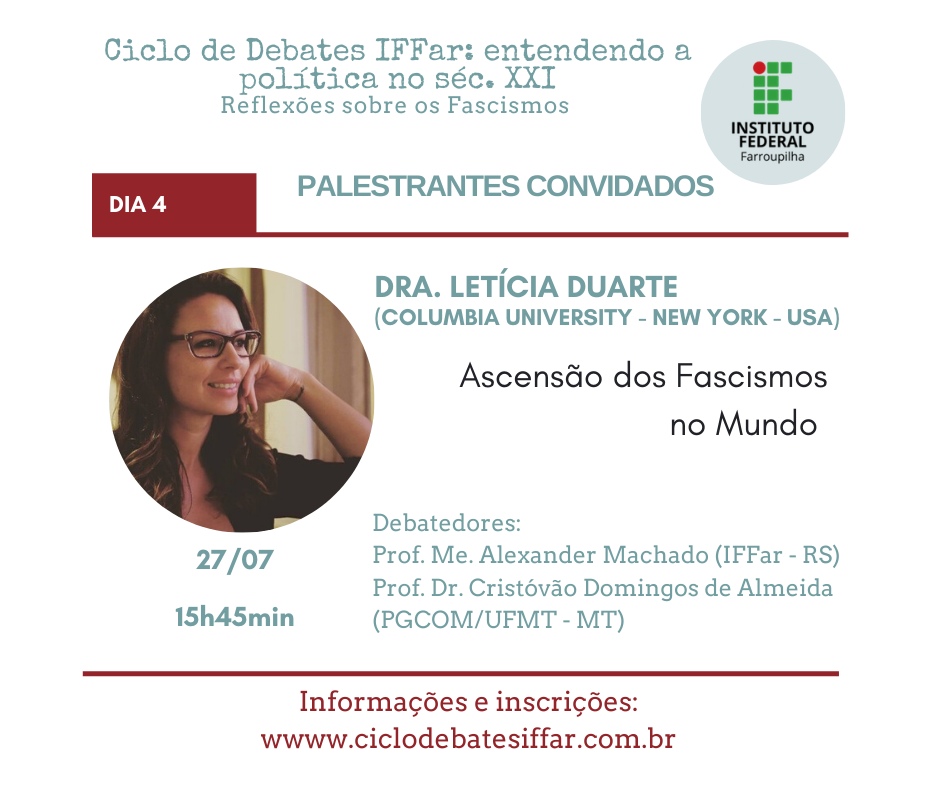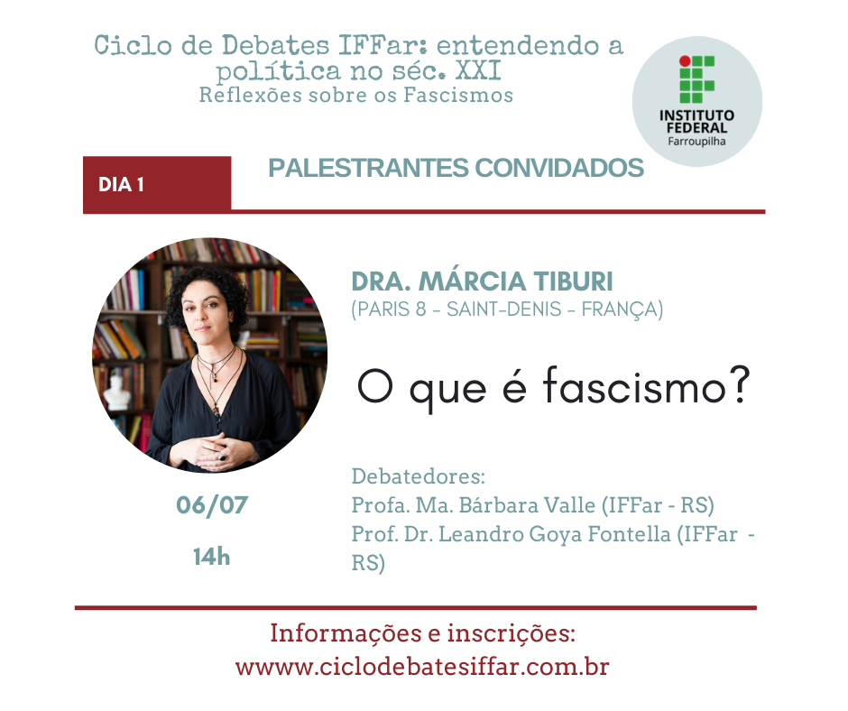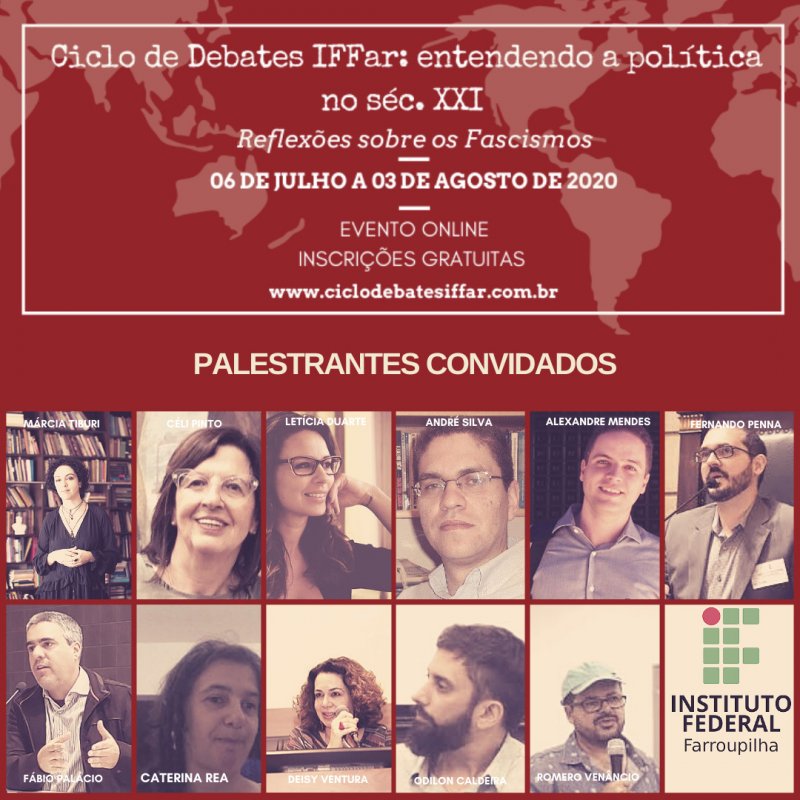Em meio a pandemia do Covid-19, os governos atuais de vários países têm orquestrado ataques à democracia, que intencionais ou não prejudicam a liberdade de pensamento e ação do povo. Assim, embora preocupados com a saúde, precisamos também nos preocupar com a política atual. Nesse cenário é que entendemos ser mais do que urgente discutirmos a onda neofascista que se alastra mundialmente. Por isso, reunimos grandes pensadores e pensadoras para cinco dias de debate no Ciclo de Debates IFFar: entendendo a política no séc. XXI. Reflexões sobre os Fascismos e contamos com sua participação!
