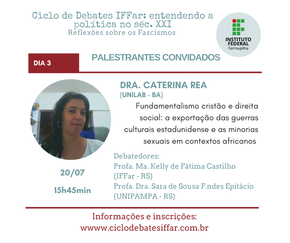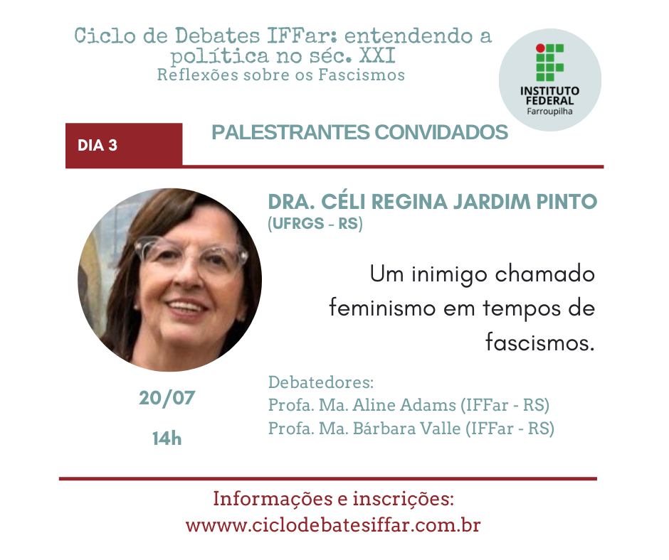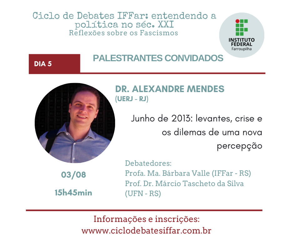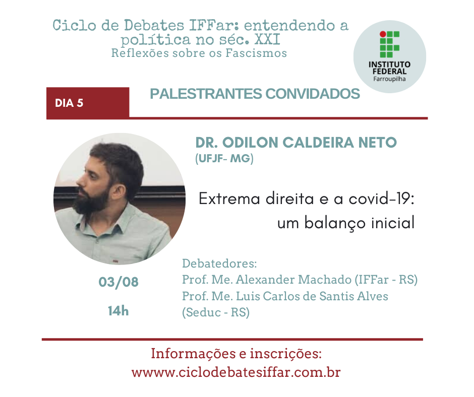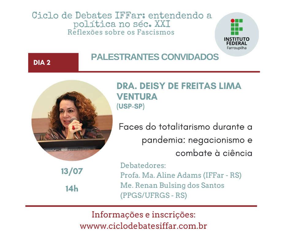 Em meio a pandemia do Covid-19, os governos atuais de vários países têm orquestrado ataques à democracia, que intencionais ou não prejudicam a liberdade de pensamento e ação do povo. Assim, embora preocupados com a saúde, precisamos também nos preocupar com a política atual. Nesse cenário é que entendemos ser mais do que urgente discutirmos a onda neofascista que se alastra mundialmente. Por isso, reunimos grandes pensadores e pensadoras para cinco dias de debate no Ciclo de Debates IFFar: entendendo a política no séc. XXI. Reflexões sobre os Fascismos e contamos com sua participação!