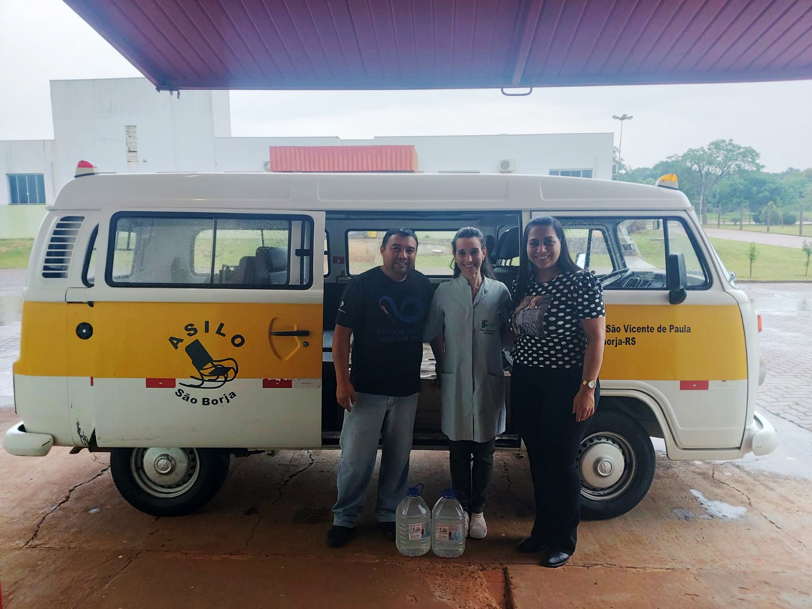 Nesta quarta-feira (5), o IFFar – Campus São Borja, realizou entrega de álcool em gel para duas entidades do município. Foram doados 50 litros do produto para o Pastor Edir Spredemann, representante da Igreja Luterana e 50 litros para o Asilo São Vicente de Paula.
