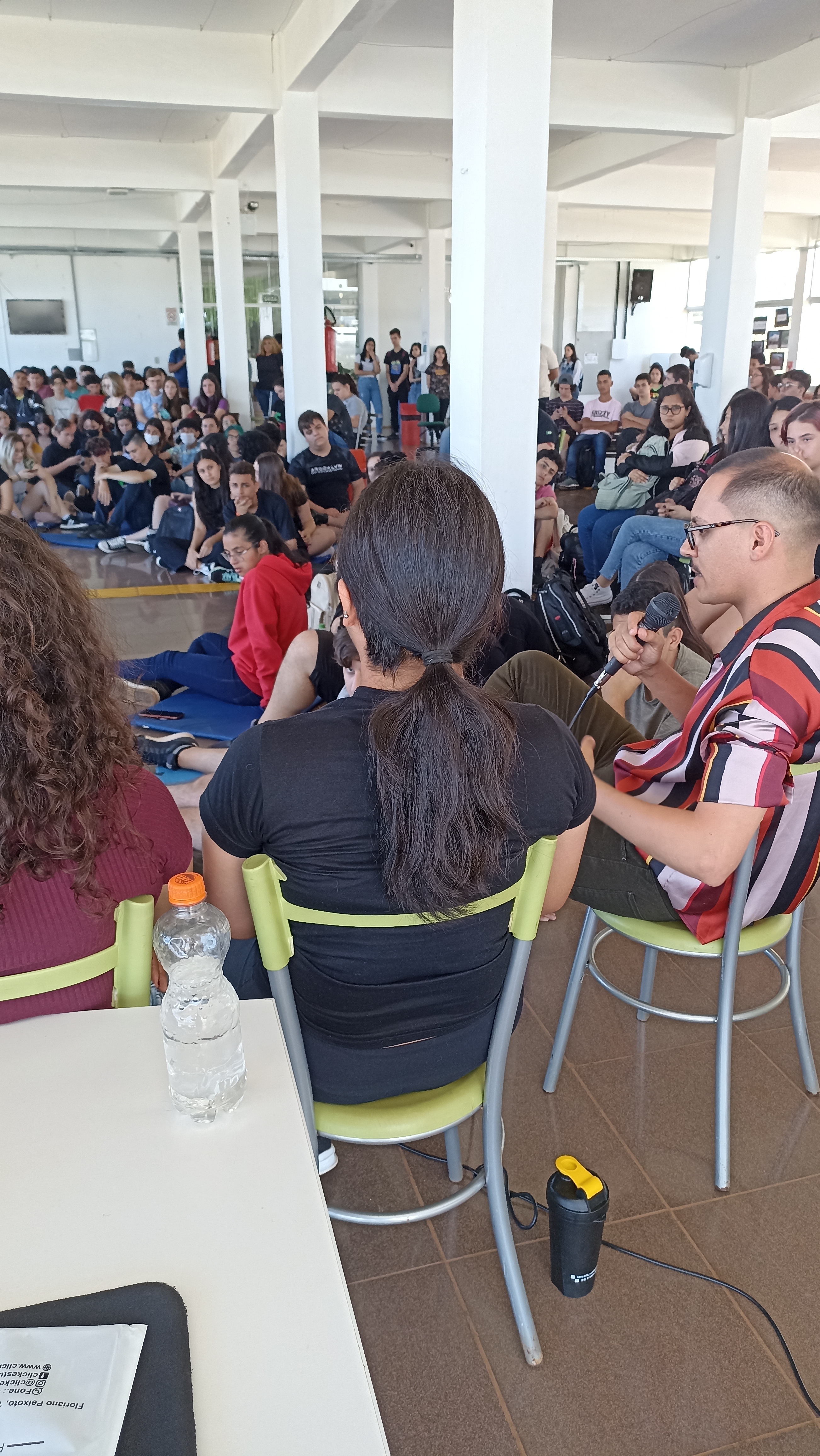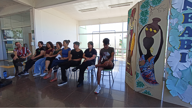 "Quem são as/os nossas/os? Potências e identidades para além da dor", foi o tema do primeiro diálogo pretagógico, realizado na manhã desta quarta-feira (16) no aquário. Na atividade, 7 (sete) estudantes dos cursos integrados e superiores do IFFar participaram de roda de conversa com todas as turmas dos cursos integrados de Informática e Eventos.