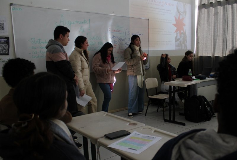 Foto: estudantes ministrando a oficina "Argumenta aí: usando o Rap na redação do Enem"/ASCOM