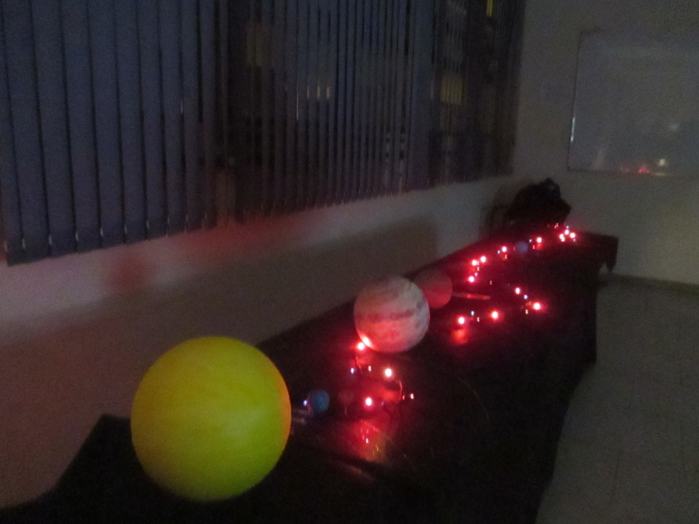 Encerrando a participação do projeto de extensão Astronomia na Escola, Campus São Borja, as alunas Brenda e Bruna, com os professores Bianca e Mairon, apresentaram uma sala temática sobre o Sistema Solar. Por meio de maquetes e simulações, os visitantes puderam visualizar e aprender questões como dimensões dos planetas, características, constituição, curiosidades, além de detalhar as diferenças e características dos eclipses e fases da Lua. Os materiais da Sala Temática foram desenvolvidos pelos alunos do projeto de ensino Clube da Astronomia, também do IFFar- Campus São Borja.