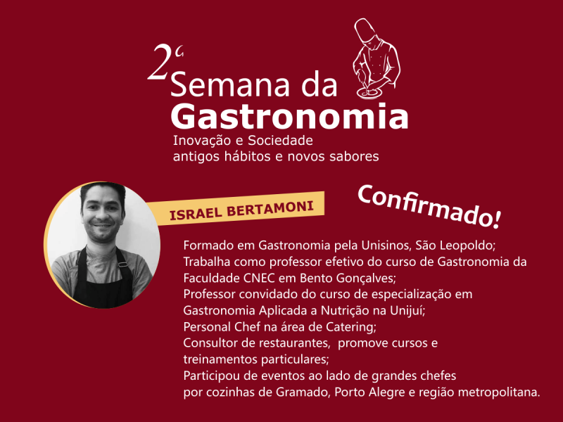 O evento é a semana acadêmica do Curso Superior de Tecnologia em Gastronomia. A palestra de abertura fica por conta de Israel Bertamoni, que falará sobre experiências e vivências no mercado gastronômico de eventos.