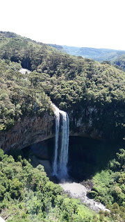 Ainda em Canela, foi a vez de conhecer o Parque do Caracol, com direito a passeio na torre panorâmica e vista para a cascata homônima do parque, com uma queda livre de 131 metros. A água percorre por uma formação basáltica, até despencar do topo. Acima da base há um espaço para admirar o mirante. No Parque há uma escada ecológica com 927 degraus que leva até a base da cascata, mas desta vez ninguém se aventurou nesta atividade alternativa.