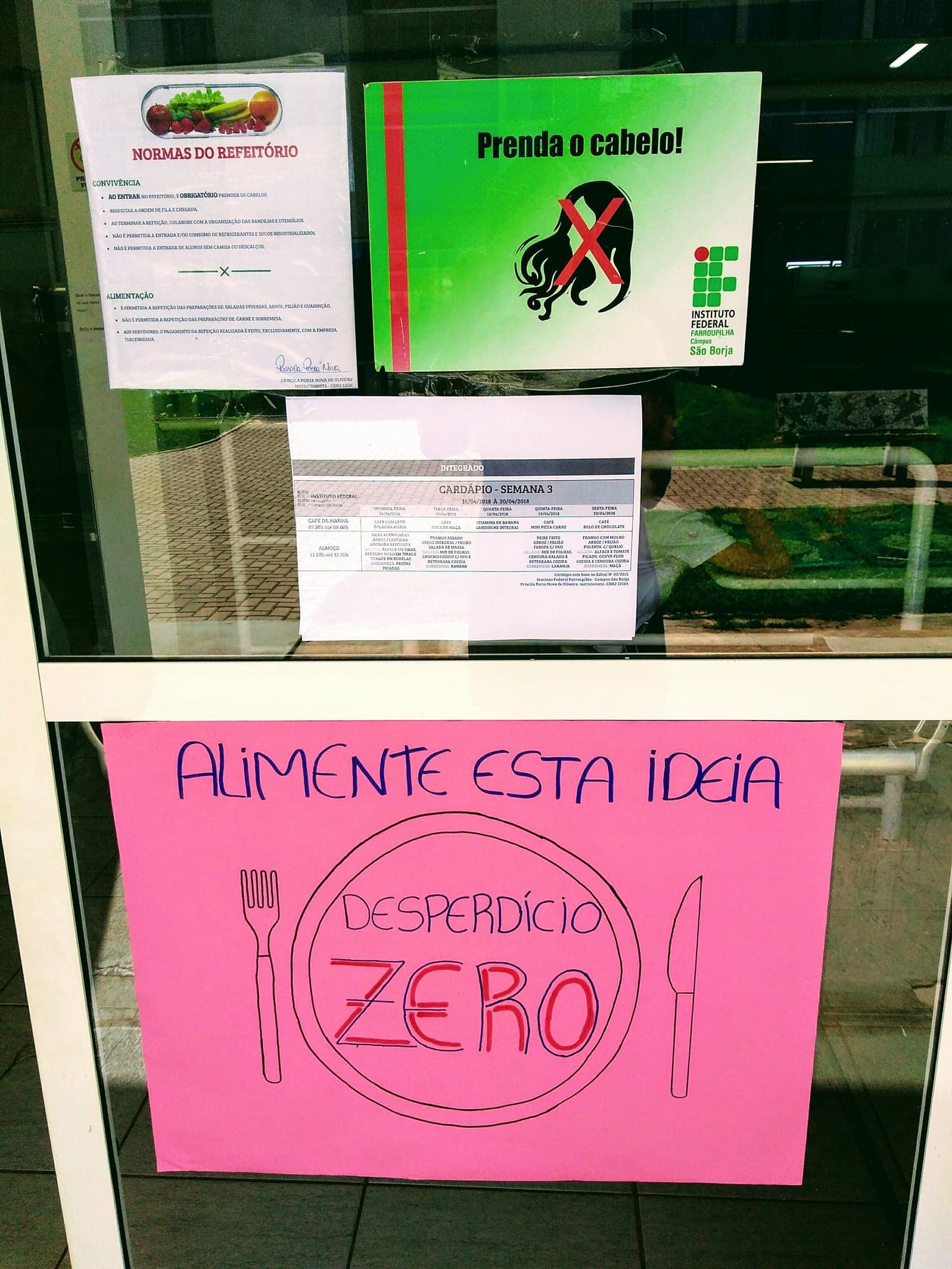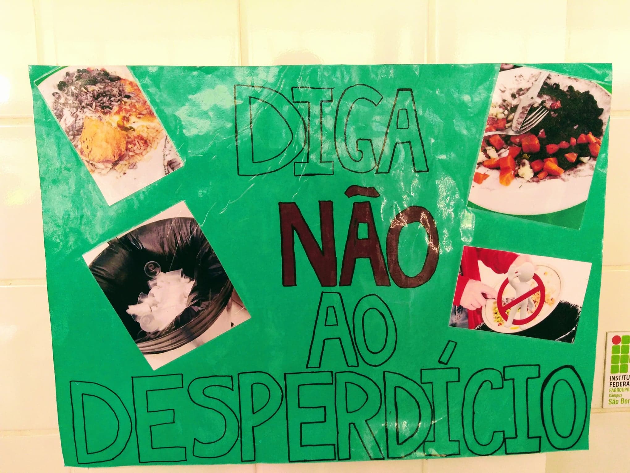 Desde a segunda-feira (16), está ocorrendo no Refeitório do IFFar-Campus São Borja, a campanha “Desperdício Zero”. A ação tem por objetivo a conscientização sobre os impactos financeiro, ambiental e de desvalorização da produção de alimentos regionais, com o descarte de alimentos próprios para o consumo. Na questão do impacto ambiental, também é lembrado aos usuários do refeitório, a diferença que cada um pode fazer ao utilizar menos copos descartáveis e uma quantidade suficiente de guardanapos e papel toalha.