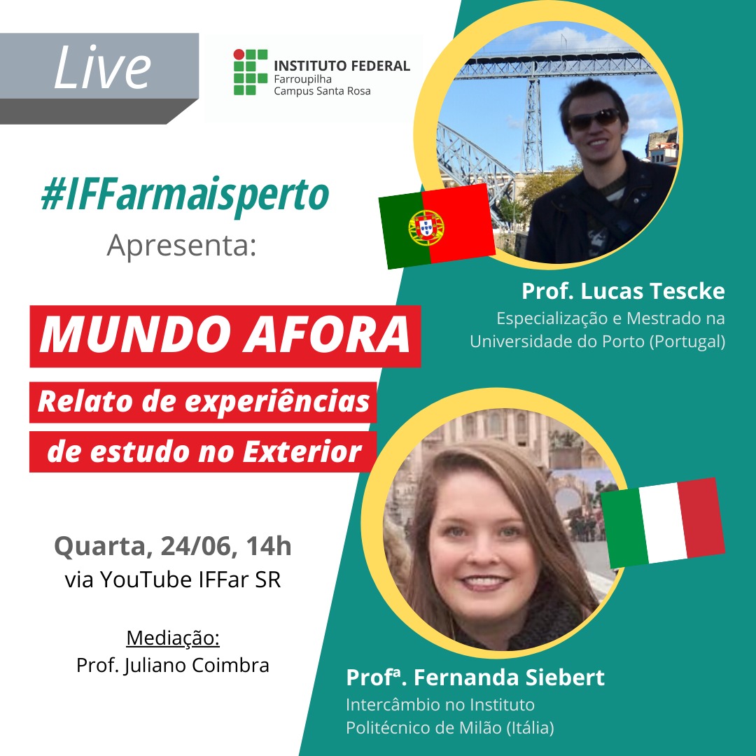 Qua. 24/06 - 14h - Mundo afora: relato de experiências de estudo no exterior com Prof. Lucas Tescke e Prof. Fernanda Siebert - Youtube IFFar Campus Santa Rosa