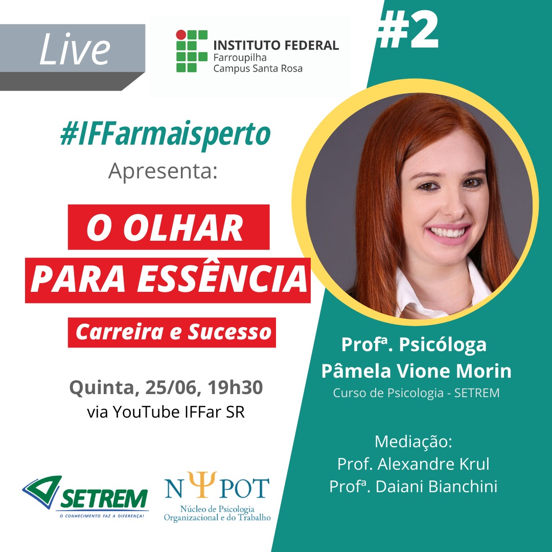 Qui. 25/06 - Um olhar para a essência: carreira e sucesso. Com a professora Pâmela Morin (Psicologia Setrem). Via YouTube.